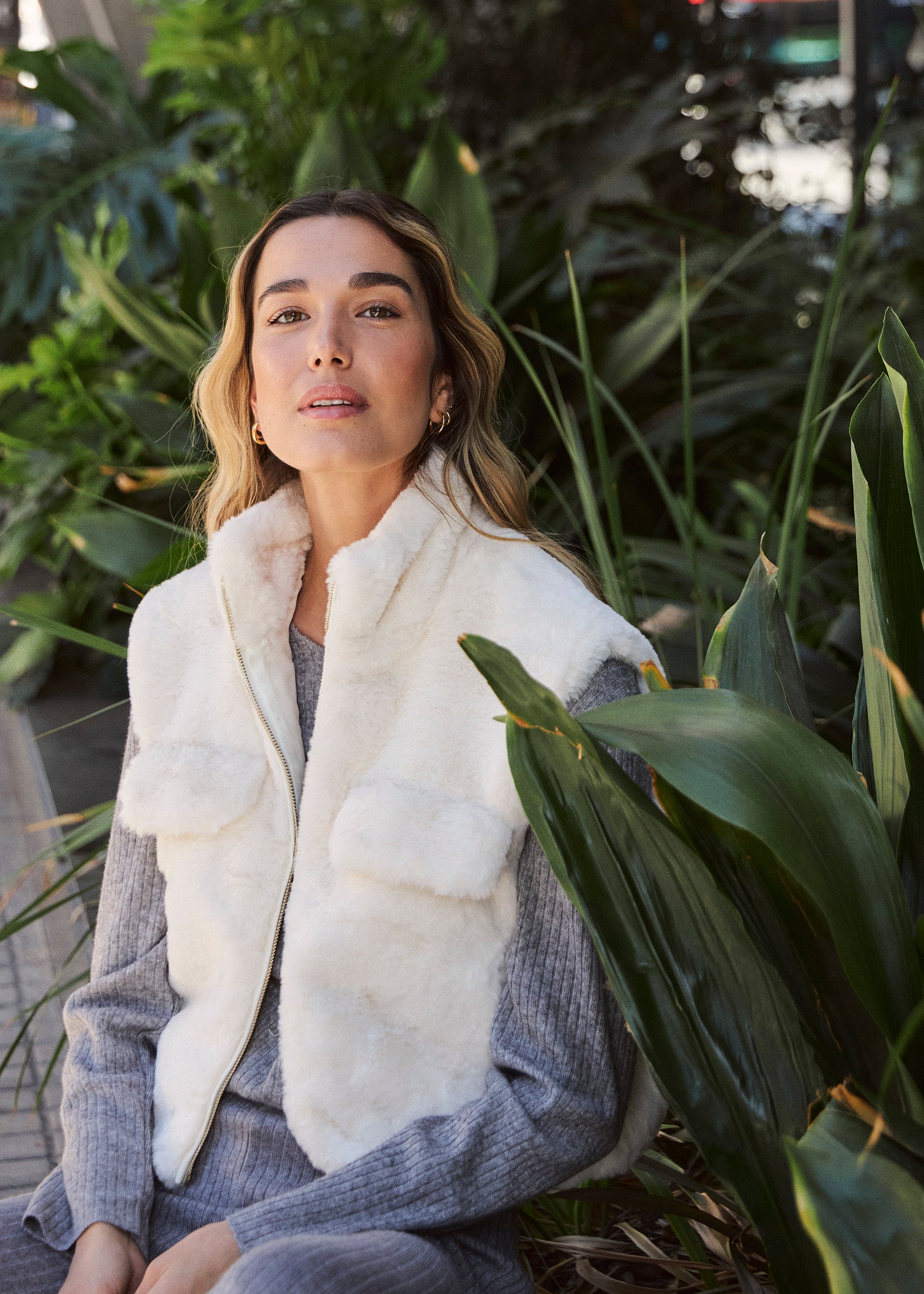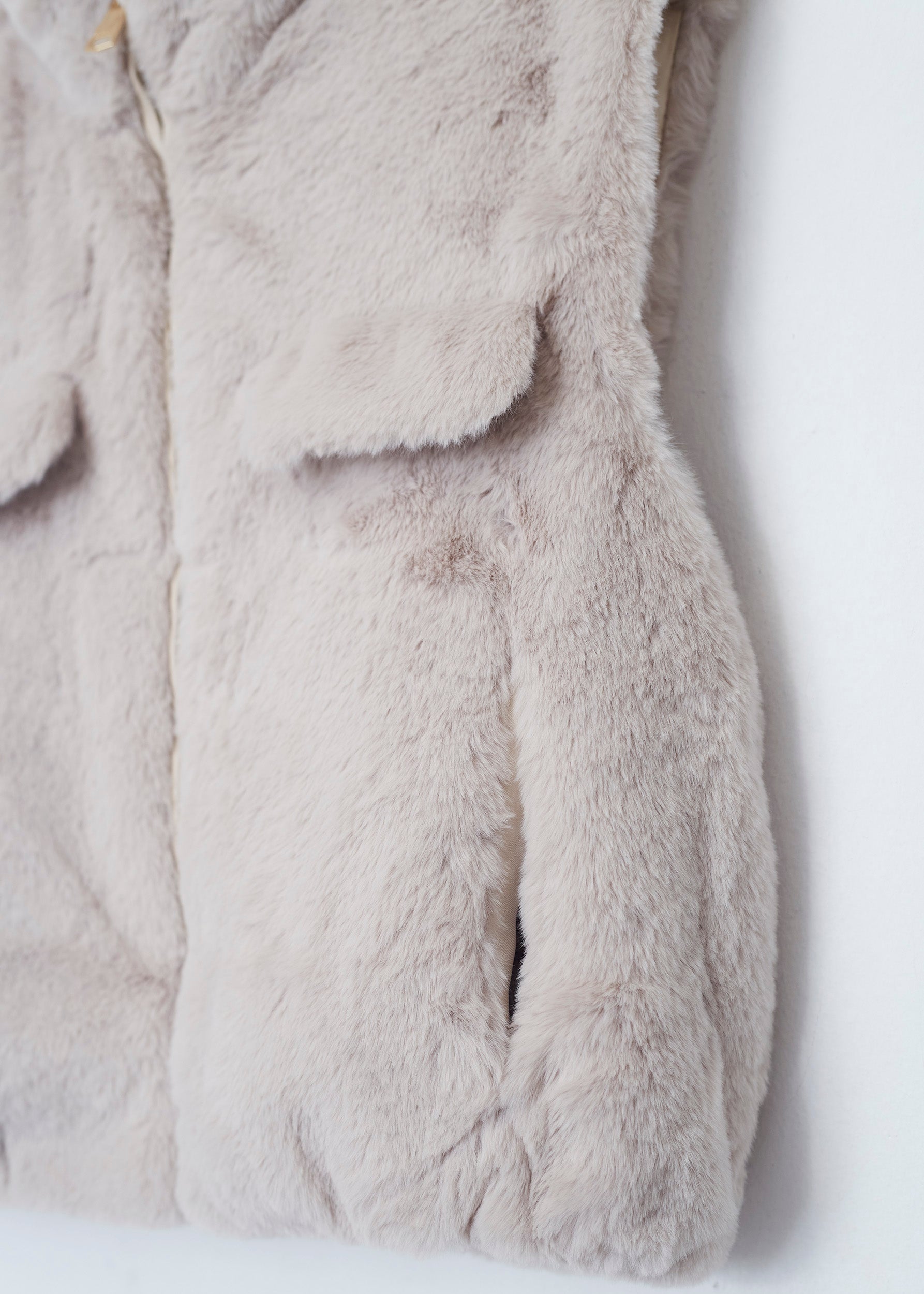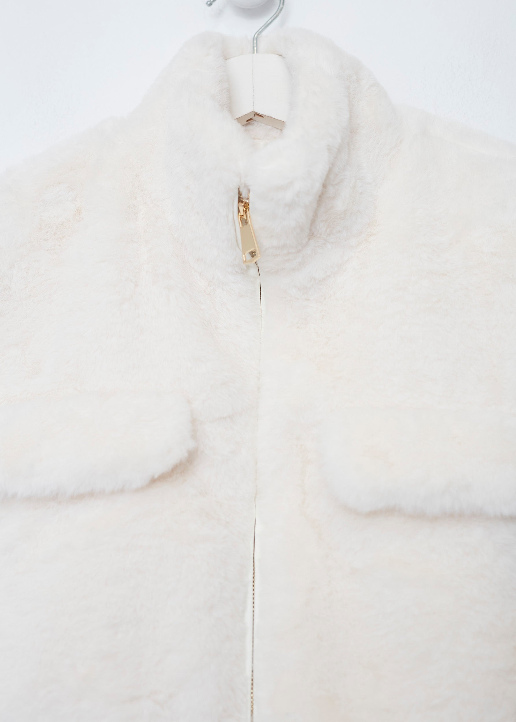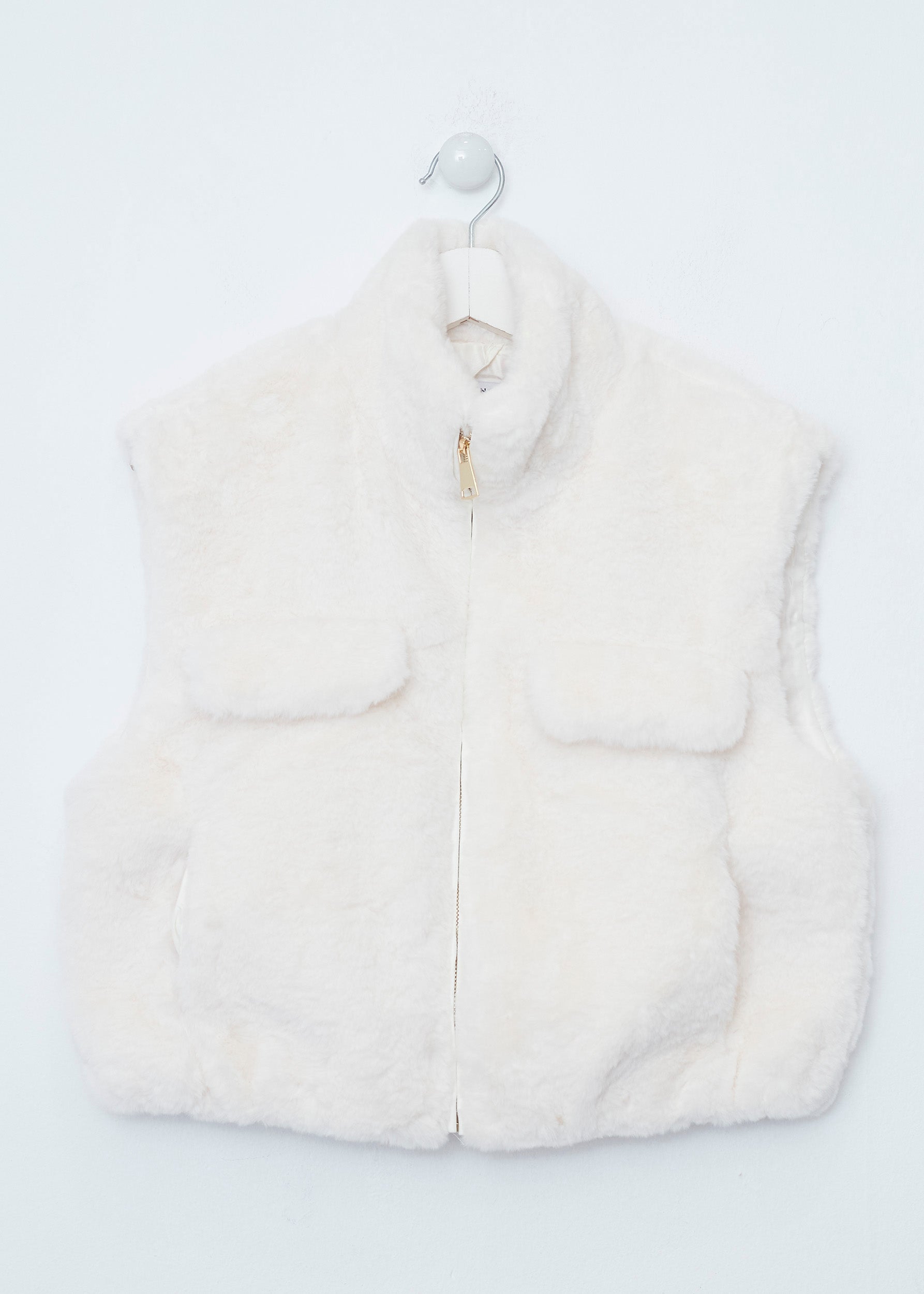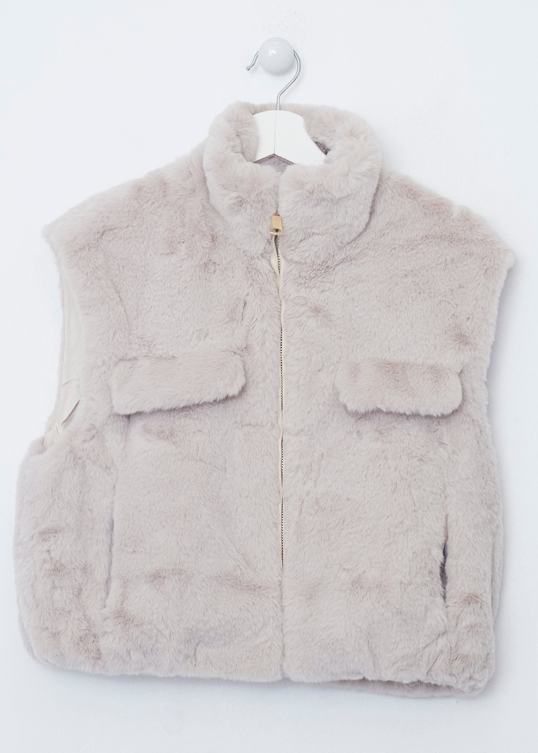Chaleco con manga sisa y cuello subido. Cierre frontal con cremallera. Detalle de falsos bolsillos en pecho. Forro interior. Bajo ligeramente elástico.