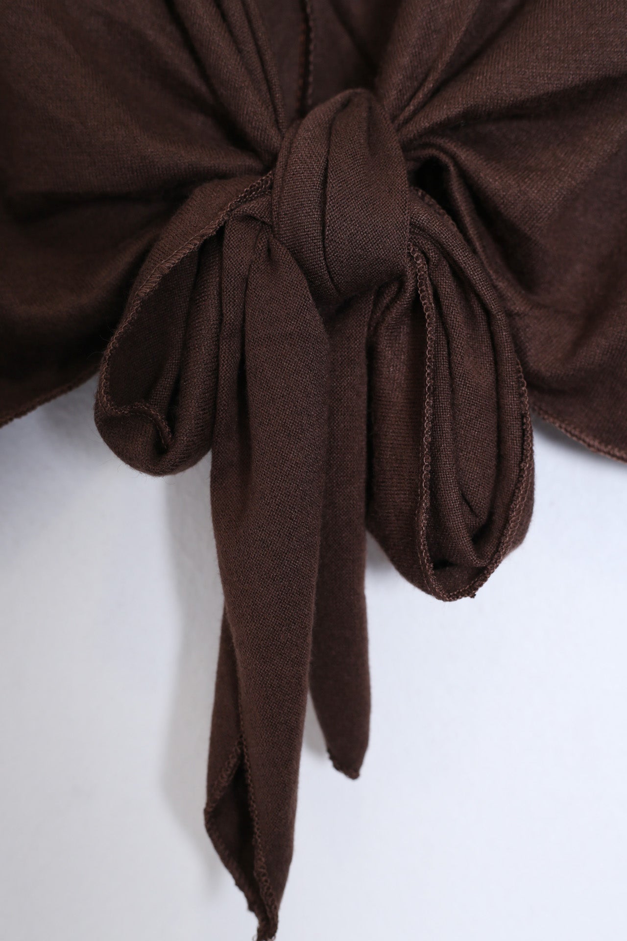 Bolero con escote cruzado en punta y manga tres cuartos. Cierre frontal con nudo delantero. Tejido confeccionado en punto.
