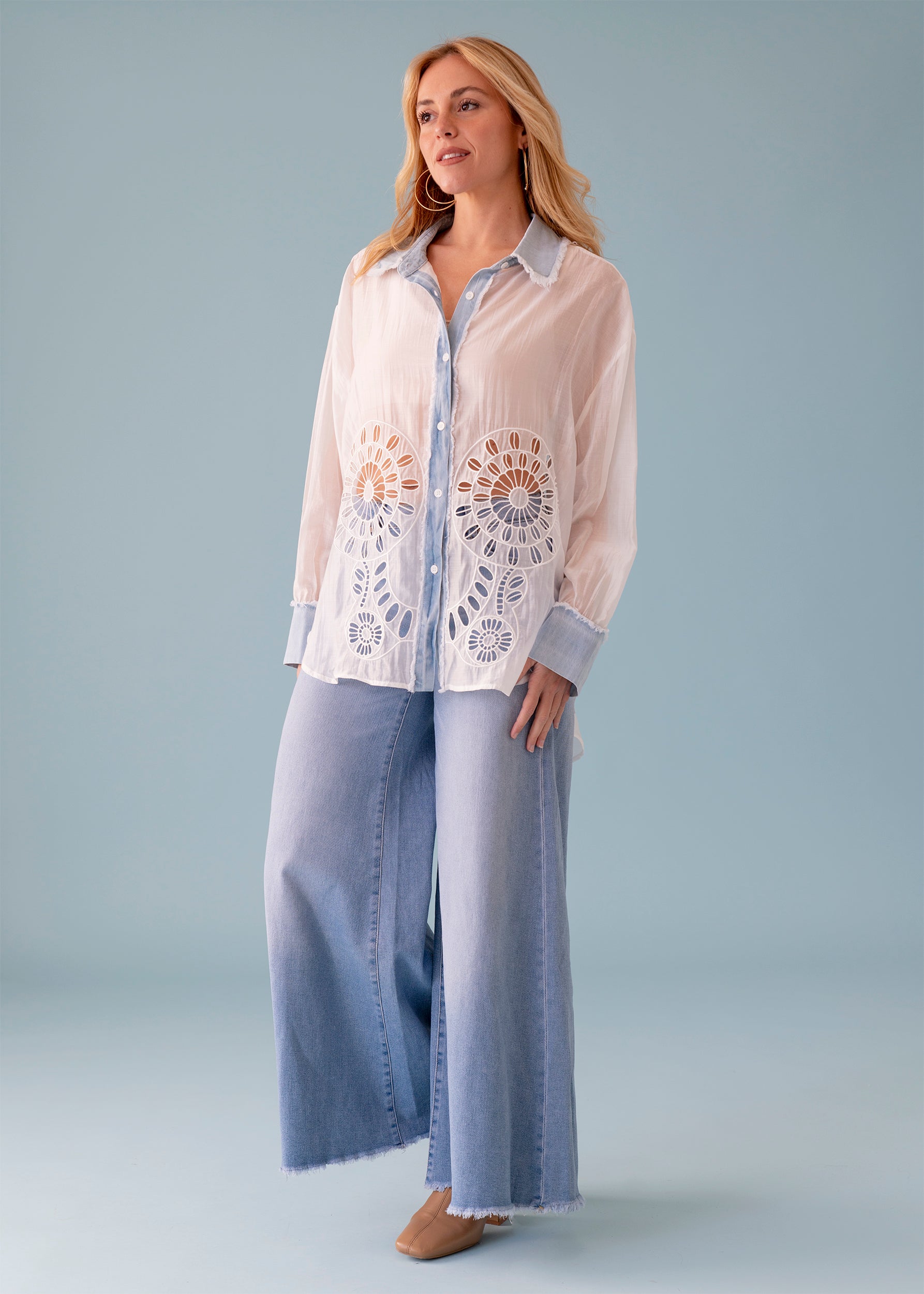 Camisa con cuello solapa y manga larga acabada en puño abotonado. Cierre frontal abotonado. Tejido fluido con detalle de bordado agujereado en frontal. Cuello, puño y abotonadura en denim a contraste con acabado desflecado. Bajo asimétrico. Corte amplio.