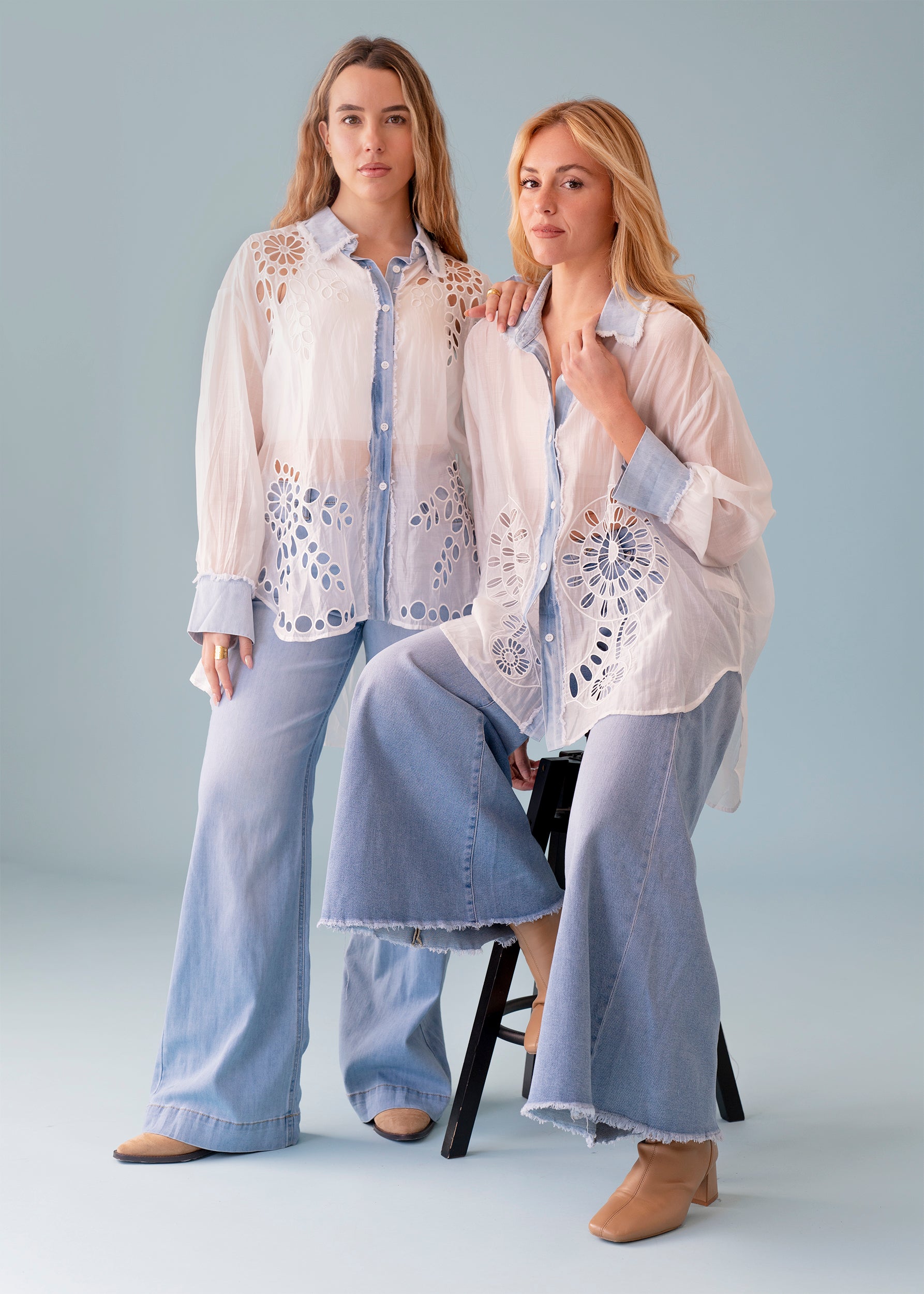 Camisa con cuello solapa desflecado y manga larga acabada en puño con botones. Cierre frontal abotonado. Detalle de bordados agujereados frontales. Cuello, botonadura y puños en denim con acabados desflecados. Bajo asimétrico.