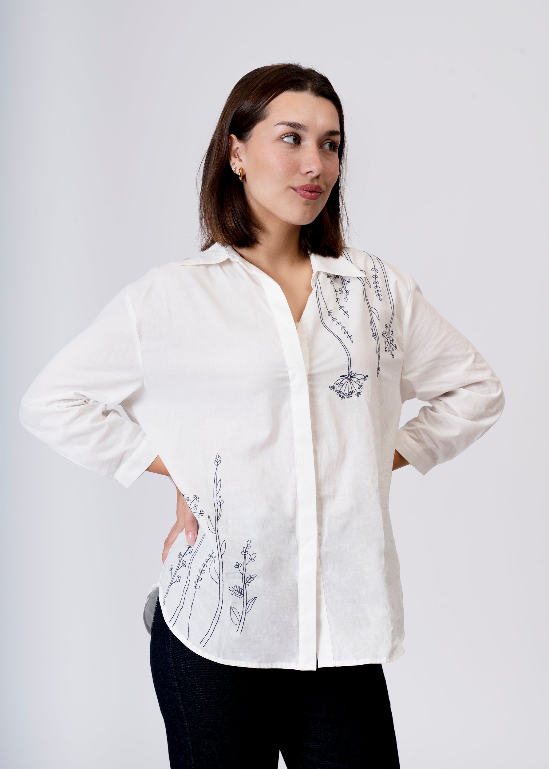 Camisa con cuello solapa y manga larga. Cierre frontal con botones ocultos. Bajos asimétricos. Detalle de bordados a contraste con motivos florales.