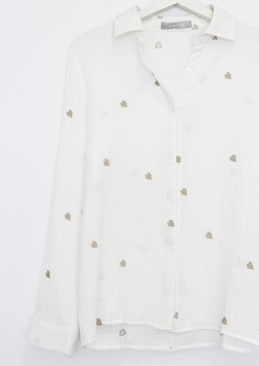 Camisa con cuello solapa y manga larga. Cierre frontal con botones. Detalle de corazones bordados en hilo metalizado. Tejido bambula.