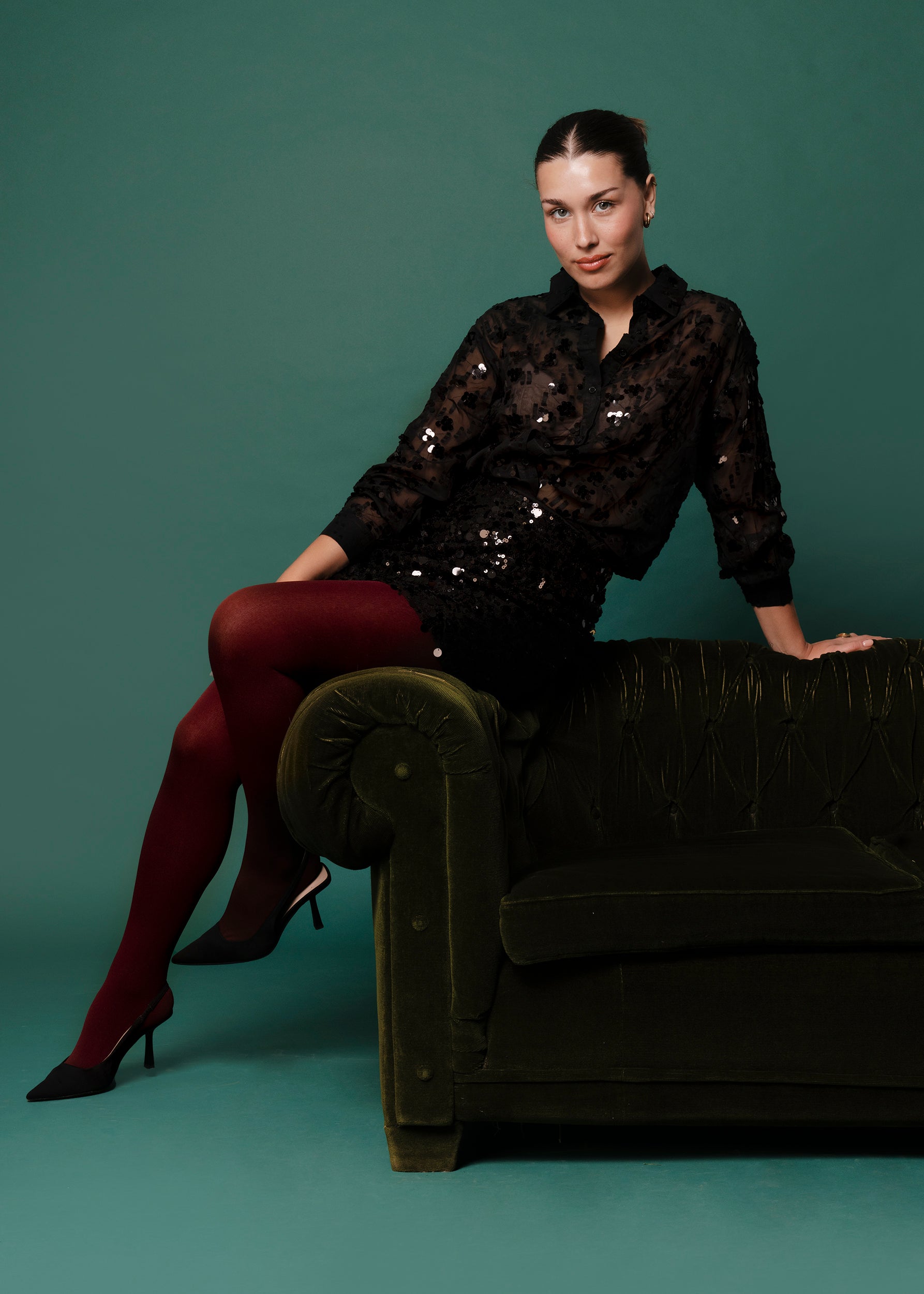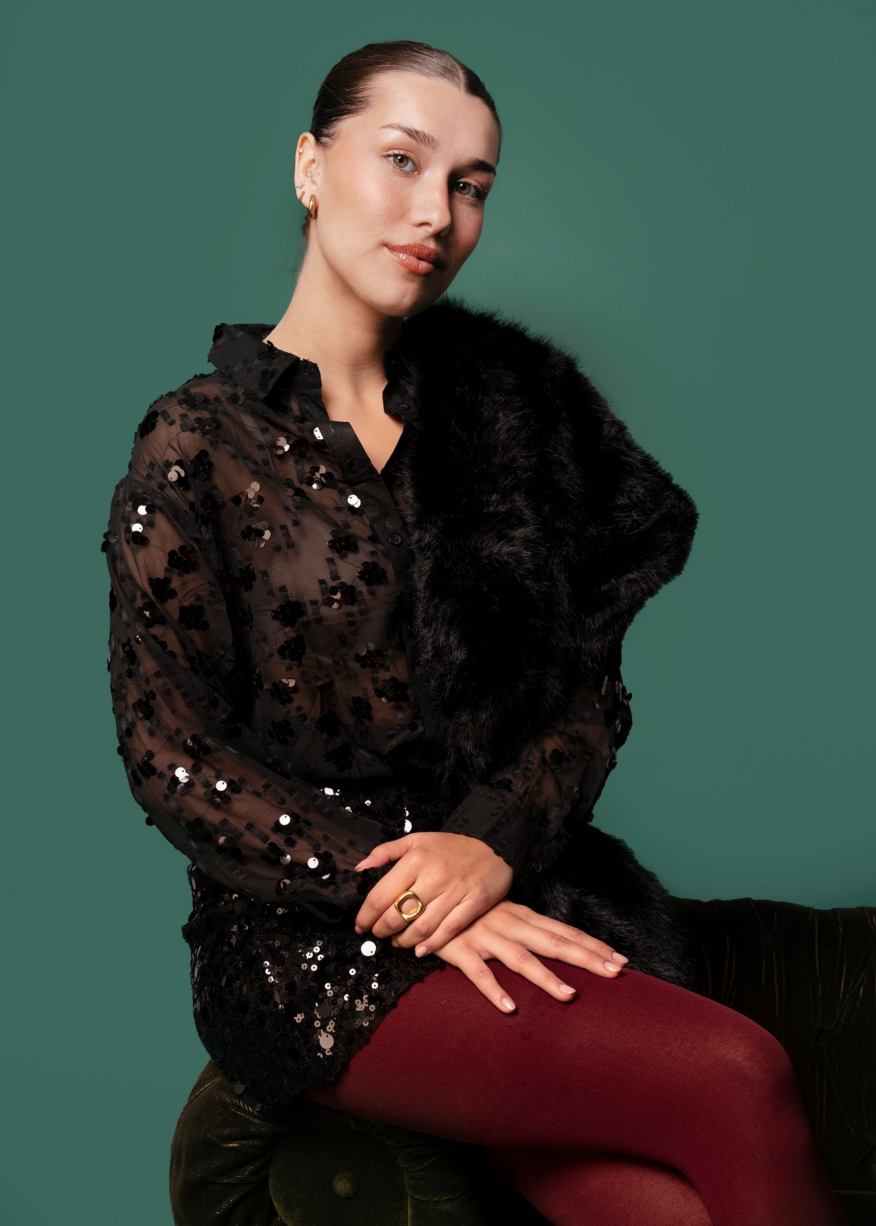 Camisa con cuello solapa y manga larga. Cierre frontal abotonado. Tejido semitransparente con detalle de texturas y aplicaciones de lentejuelas a tono. Bajo asimétrico. Corte amplio y recto.