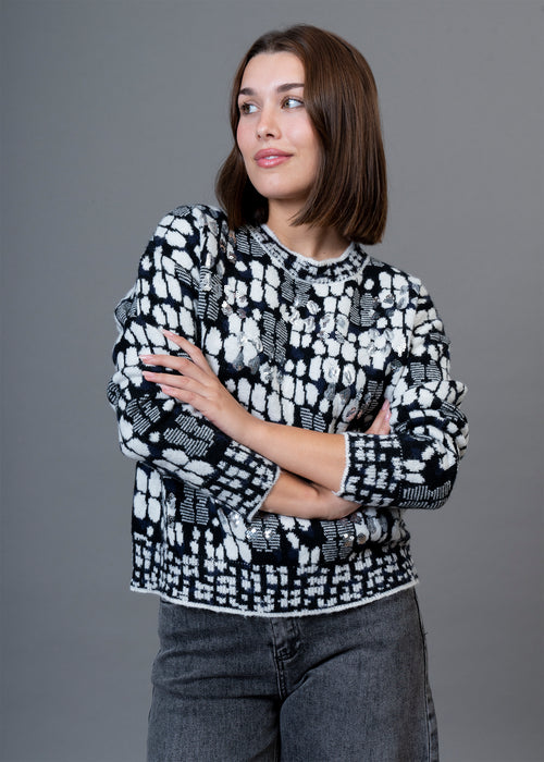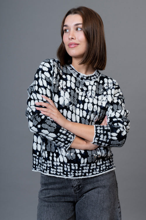 Cárdigan de escote en punta y manga larga. Cierre frontal con botones decorativos. Detalle de falsos bolsillos de plastrón delanteros con botón decorativo. Bajo y puños acabados en rib. Ribete a contraste.