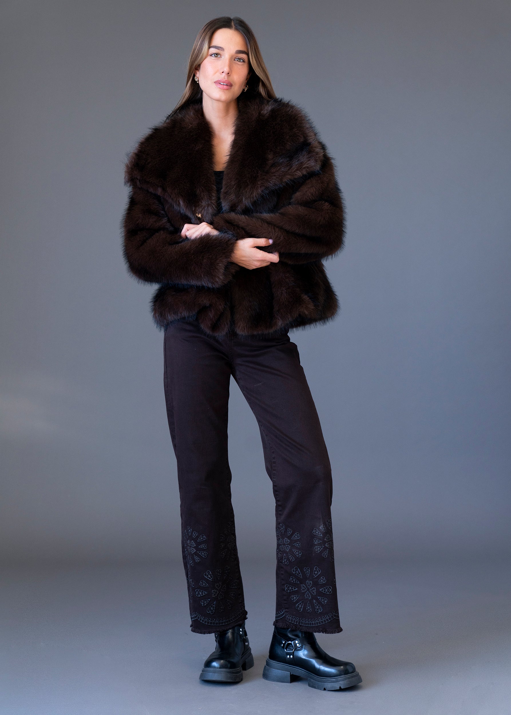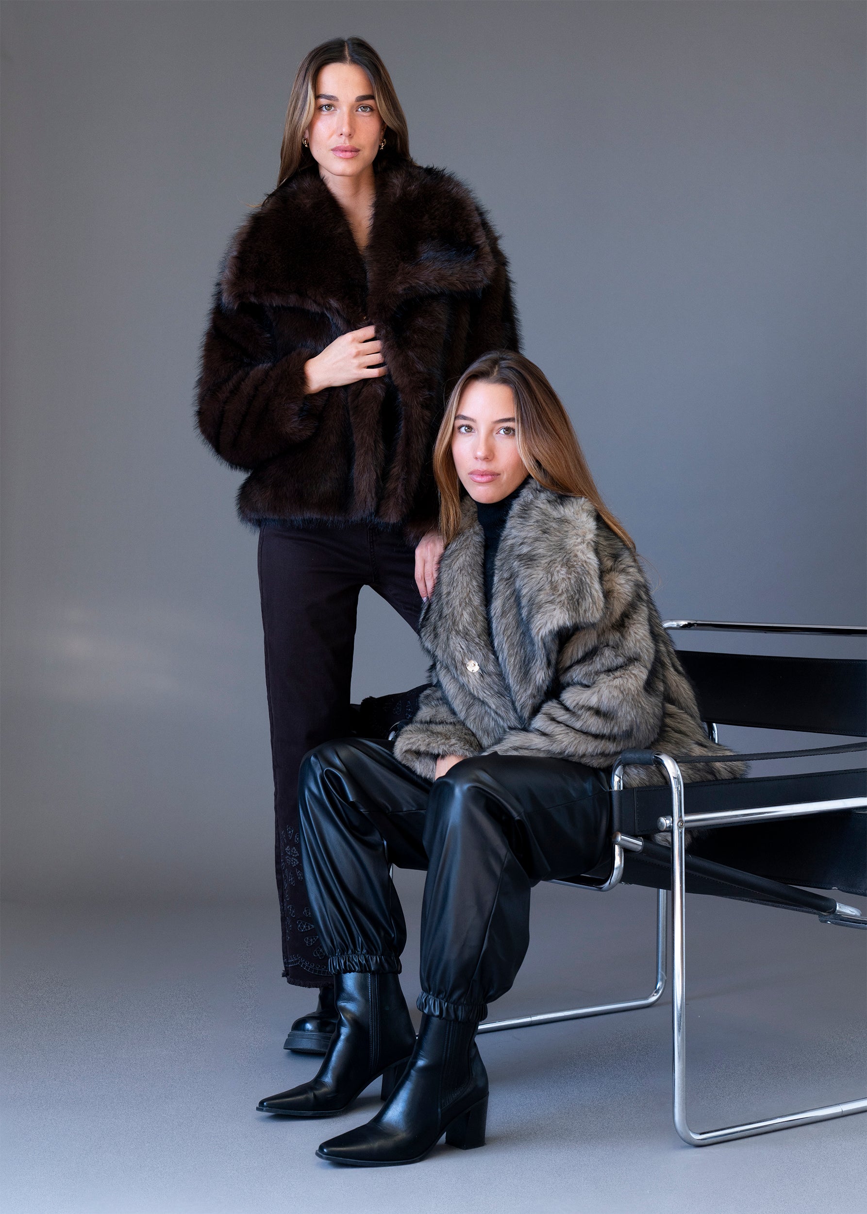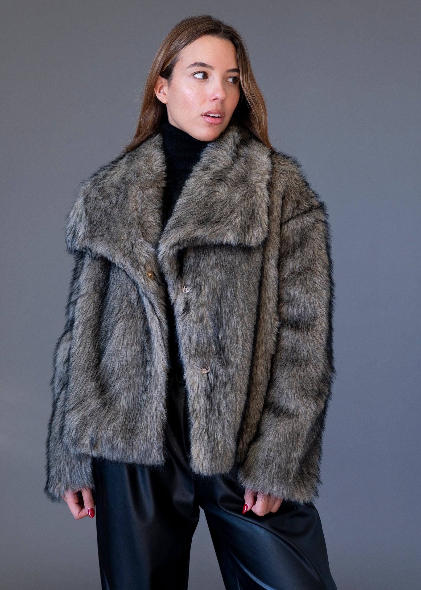 Chaqueta efecto pelo con cuello solapa y manga larga. Cierre frontal con botones metálicos ocultos. Dos bolsillos delanteros. Forro interior.