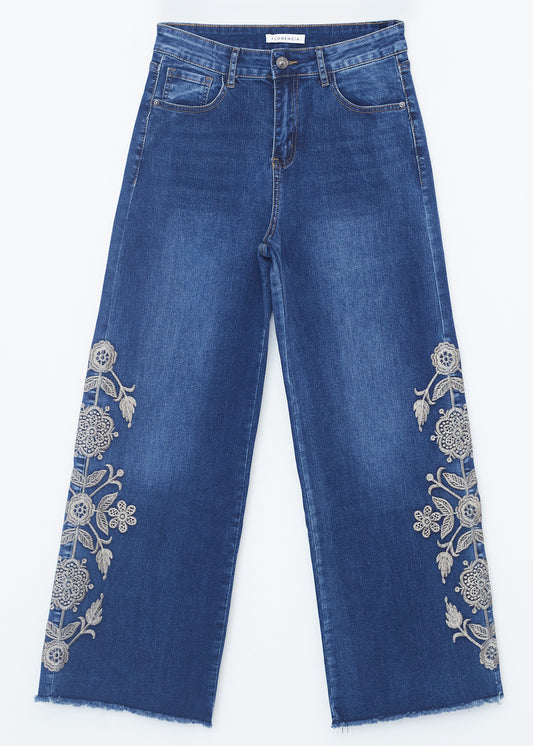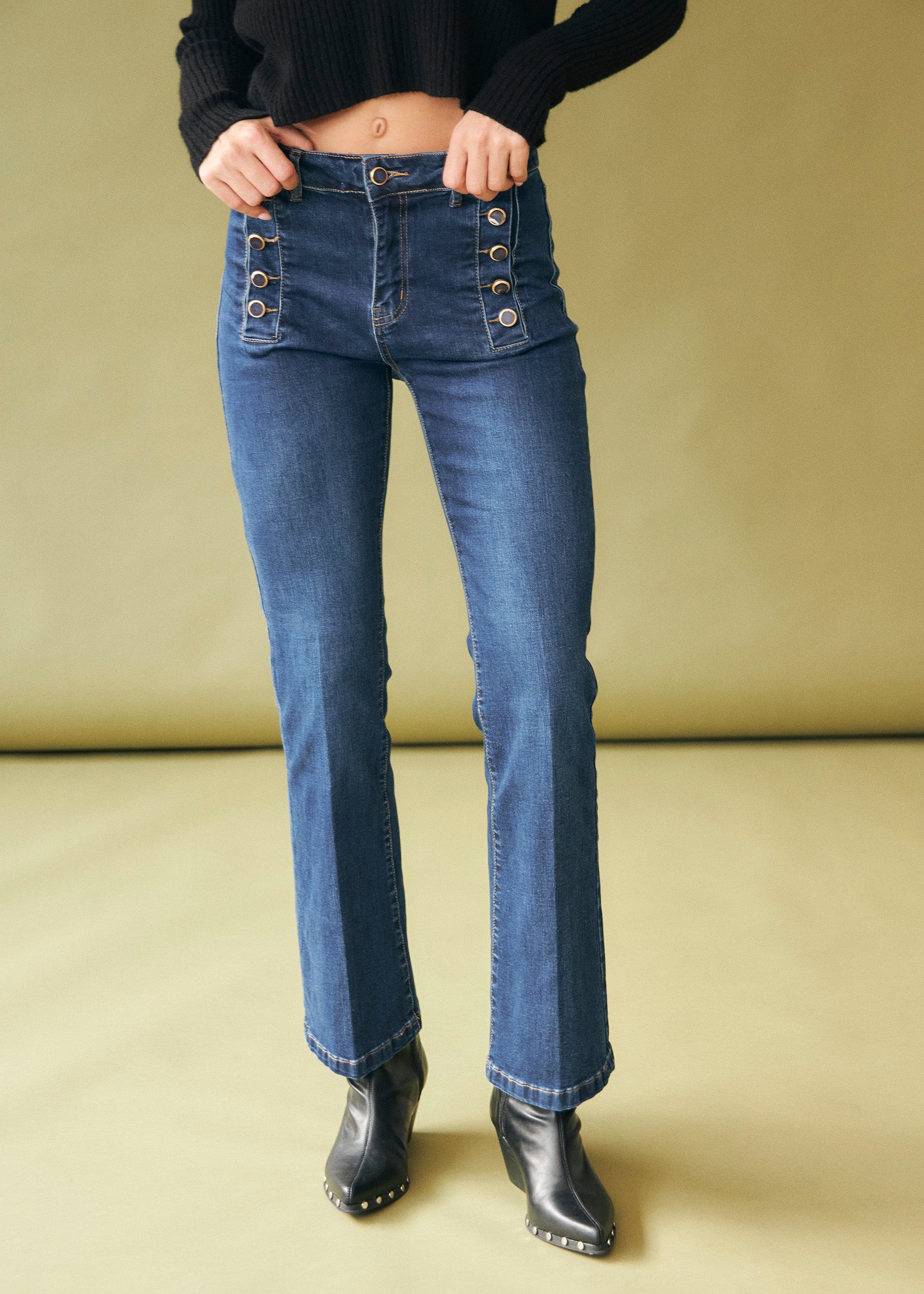 Jeans de tiro alto y pierna ligeramente acampanada. Cierre frontal con botón y cremallera. Detalle de botones decorativos. Bolsillos traseros de plastrón.