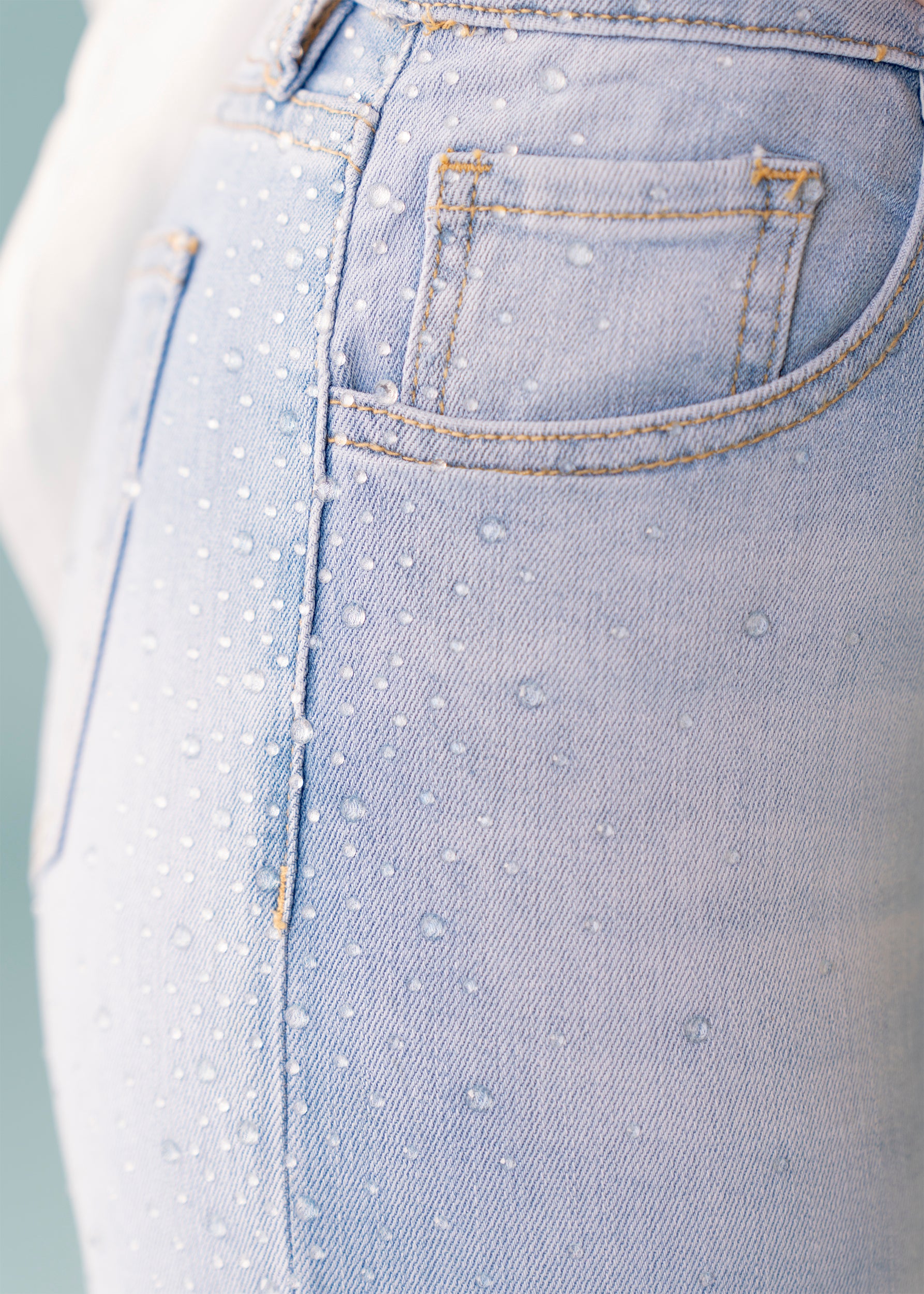 Jeans de tiro alto. Tres bolsillos delanteros y dos bolsillos traseros. Detalle de aplicaciones en forma de lágrima brillante.