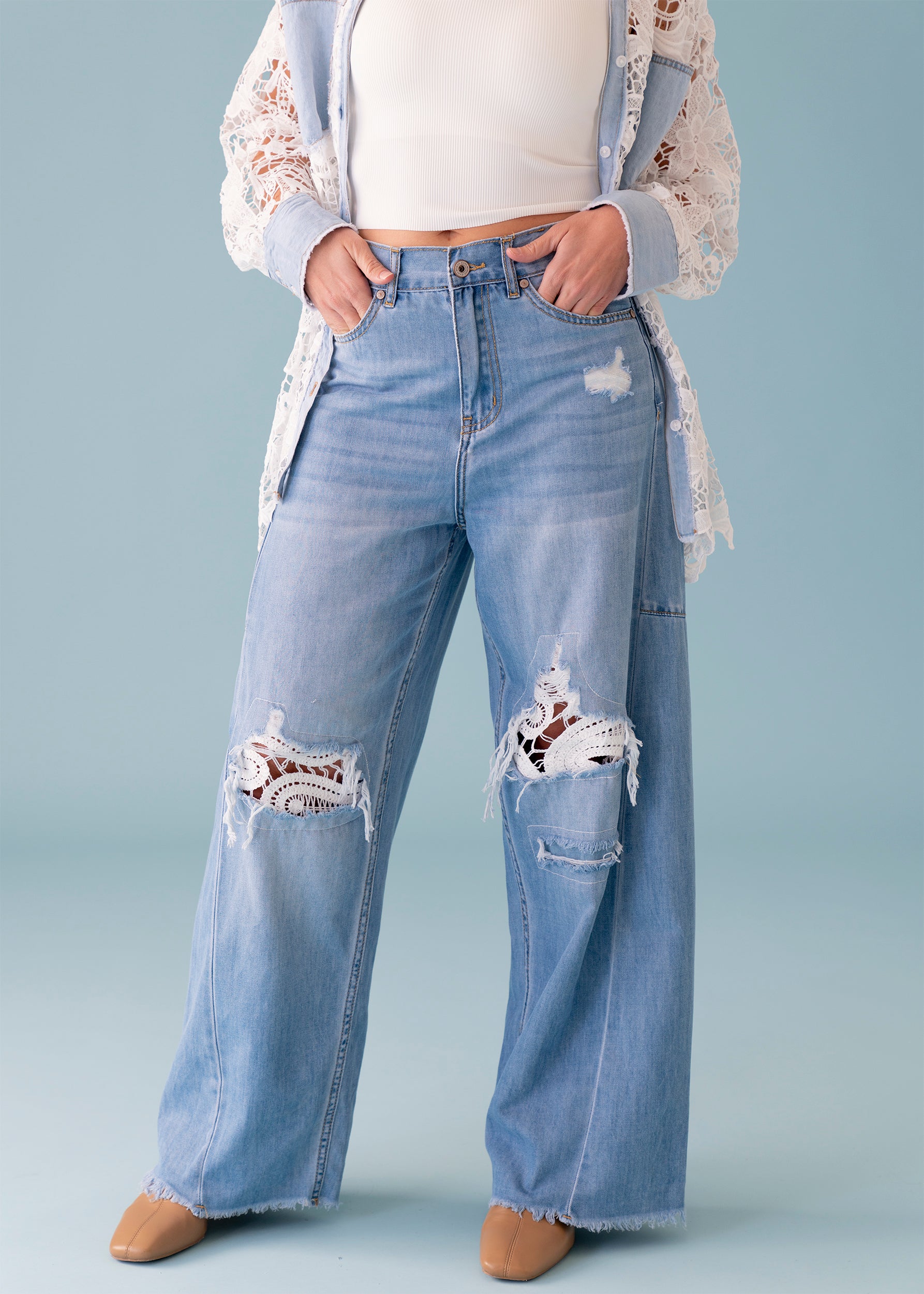 Jeans anchos y tiro alto. Cierre frontal con cremallera y botón. 3 bolsillos delanteros y 2 traseros. Detalle de rotos y aplicaciones de guipur en frontal. Bajo desflecado.