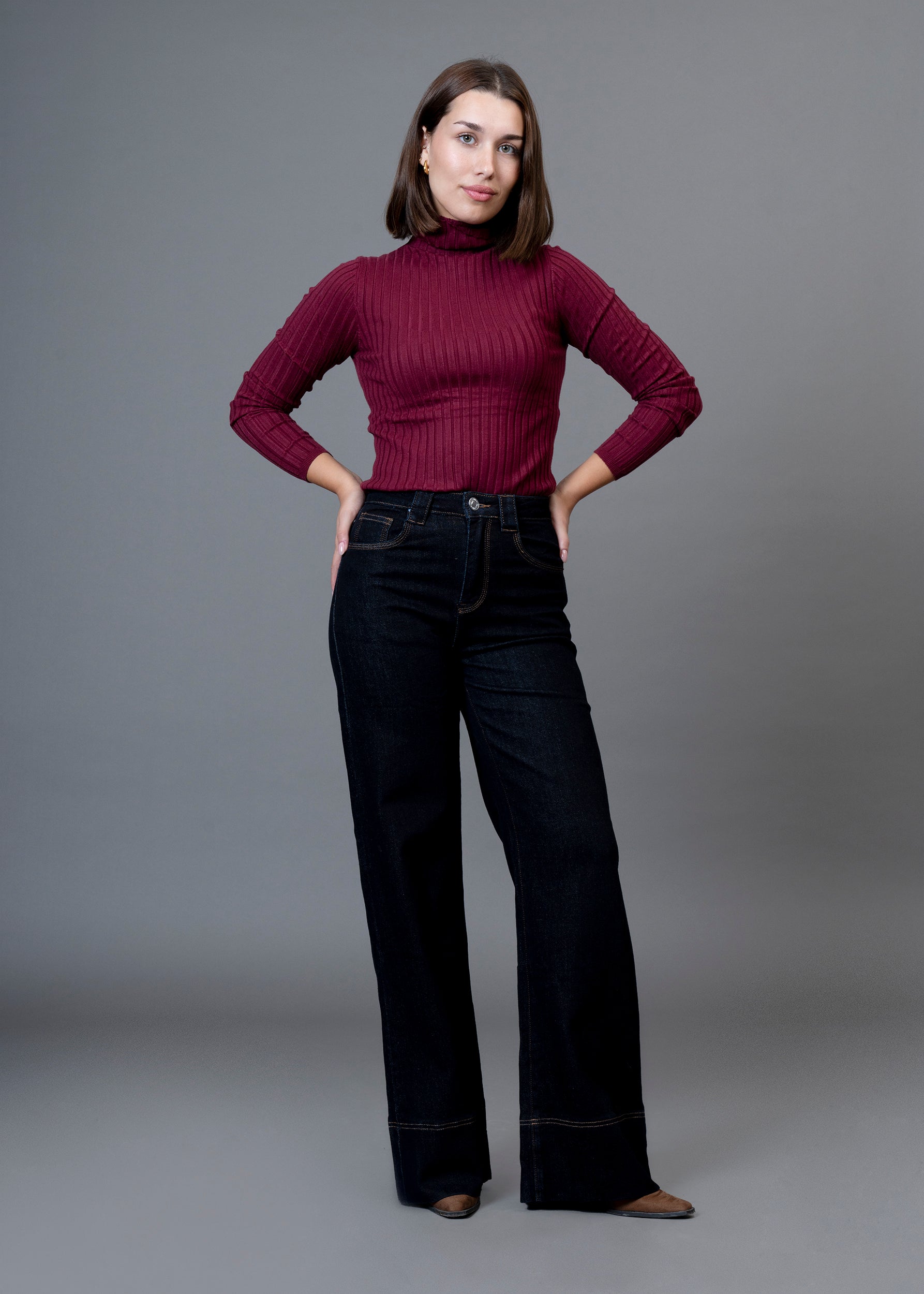 Jersey canalé con cuello alto y manga larga. Corte entallado.