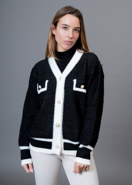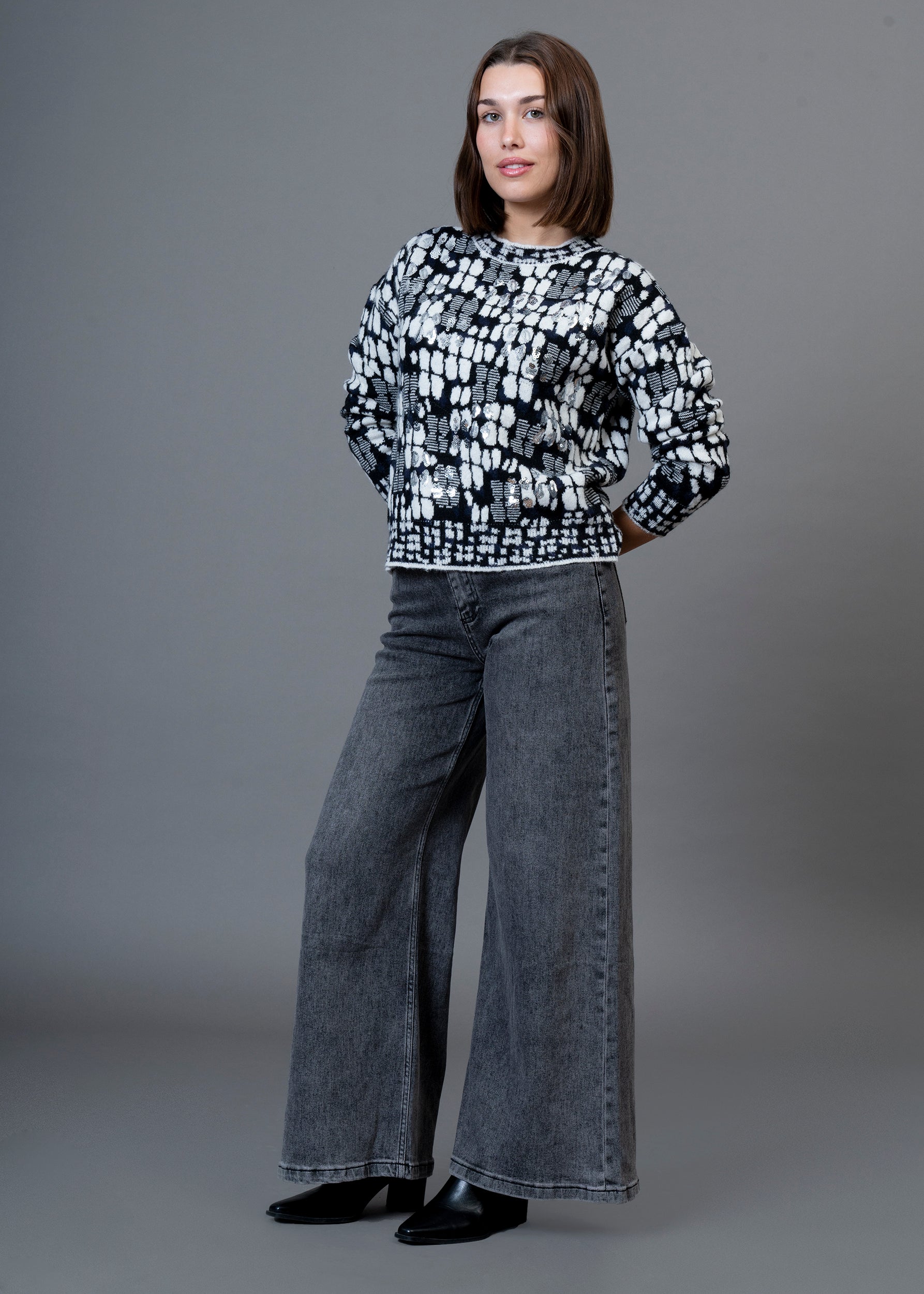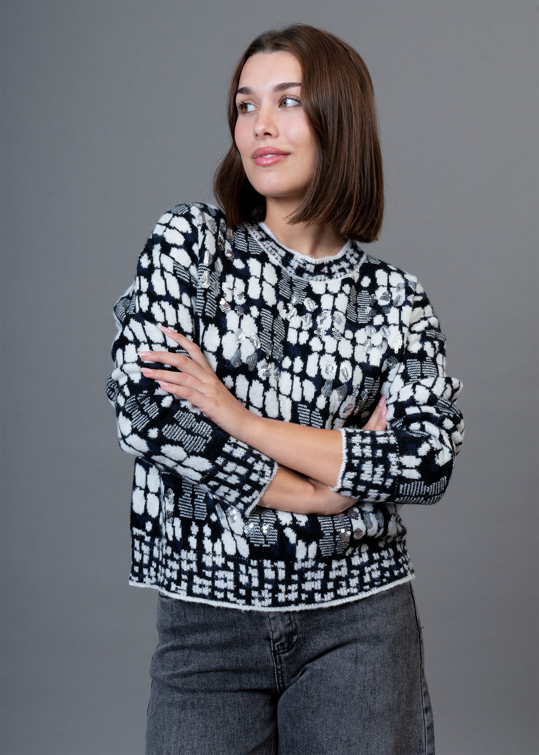 Jersey de cuello redondo y manga larga. Confeccionado en jaquard con dibujo bitono. Detalle de aplicación de lentejuelas plateadas. Corte recto. Acabados en rib.