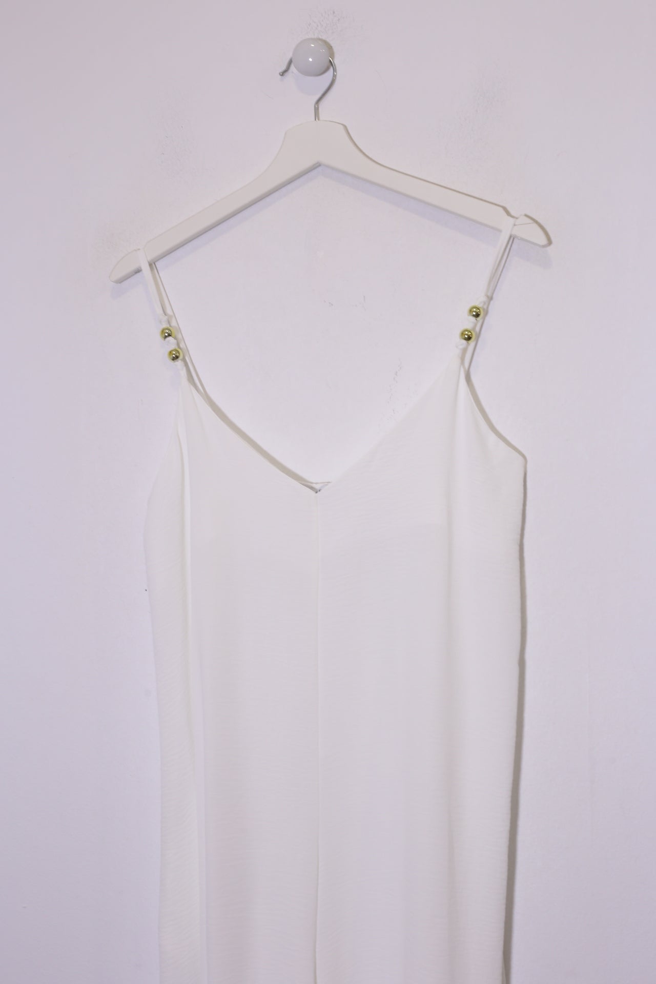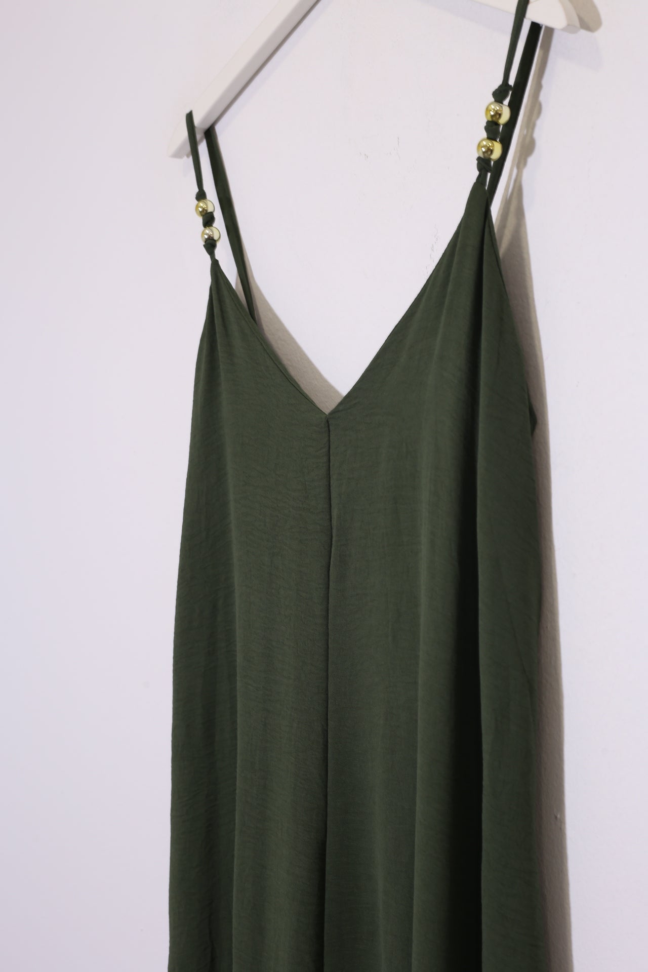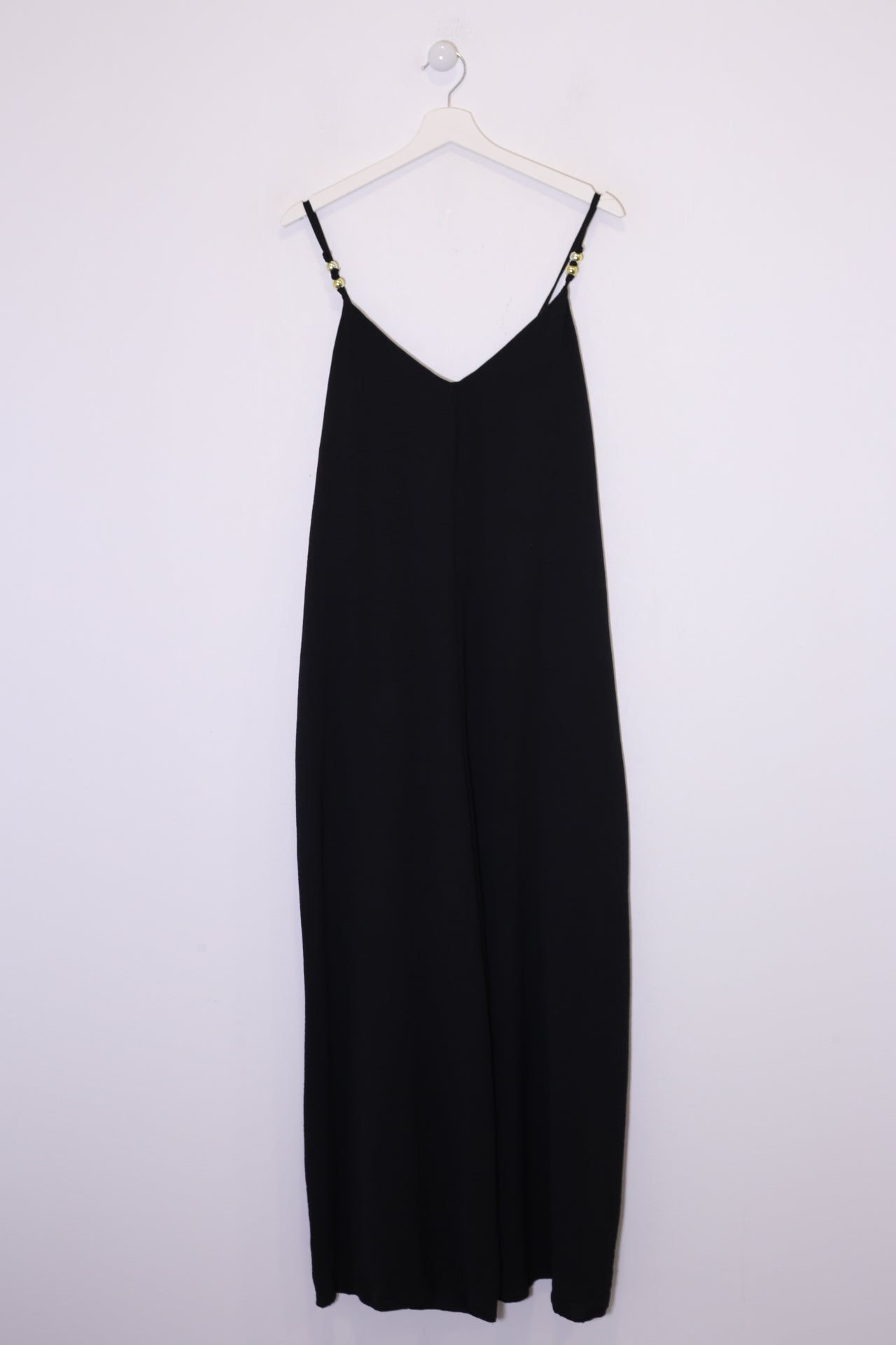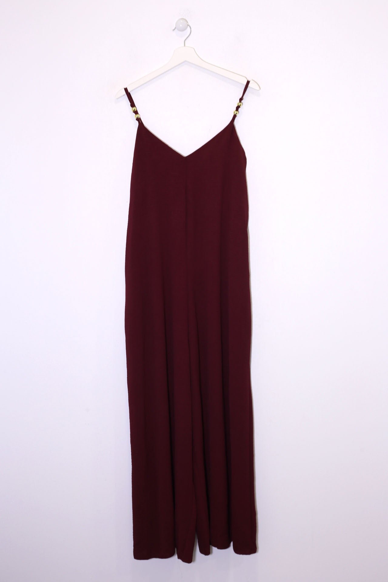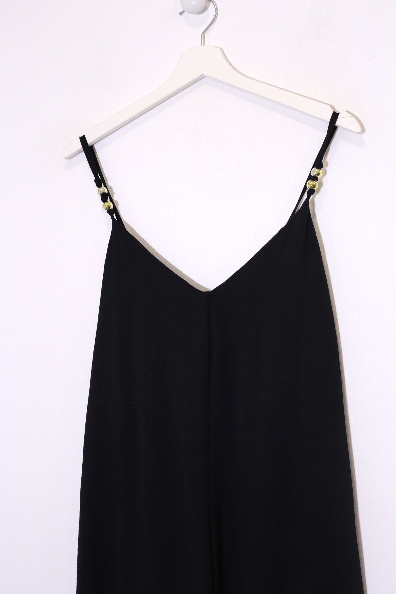 Mono de tirantes finos con detalle de abalorios, escote en pico y pierna ancha de corte fluido.