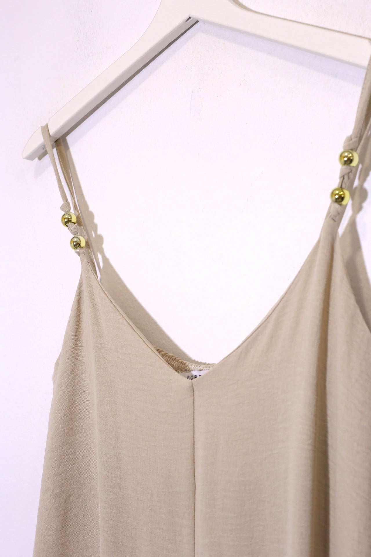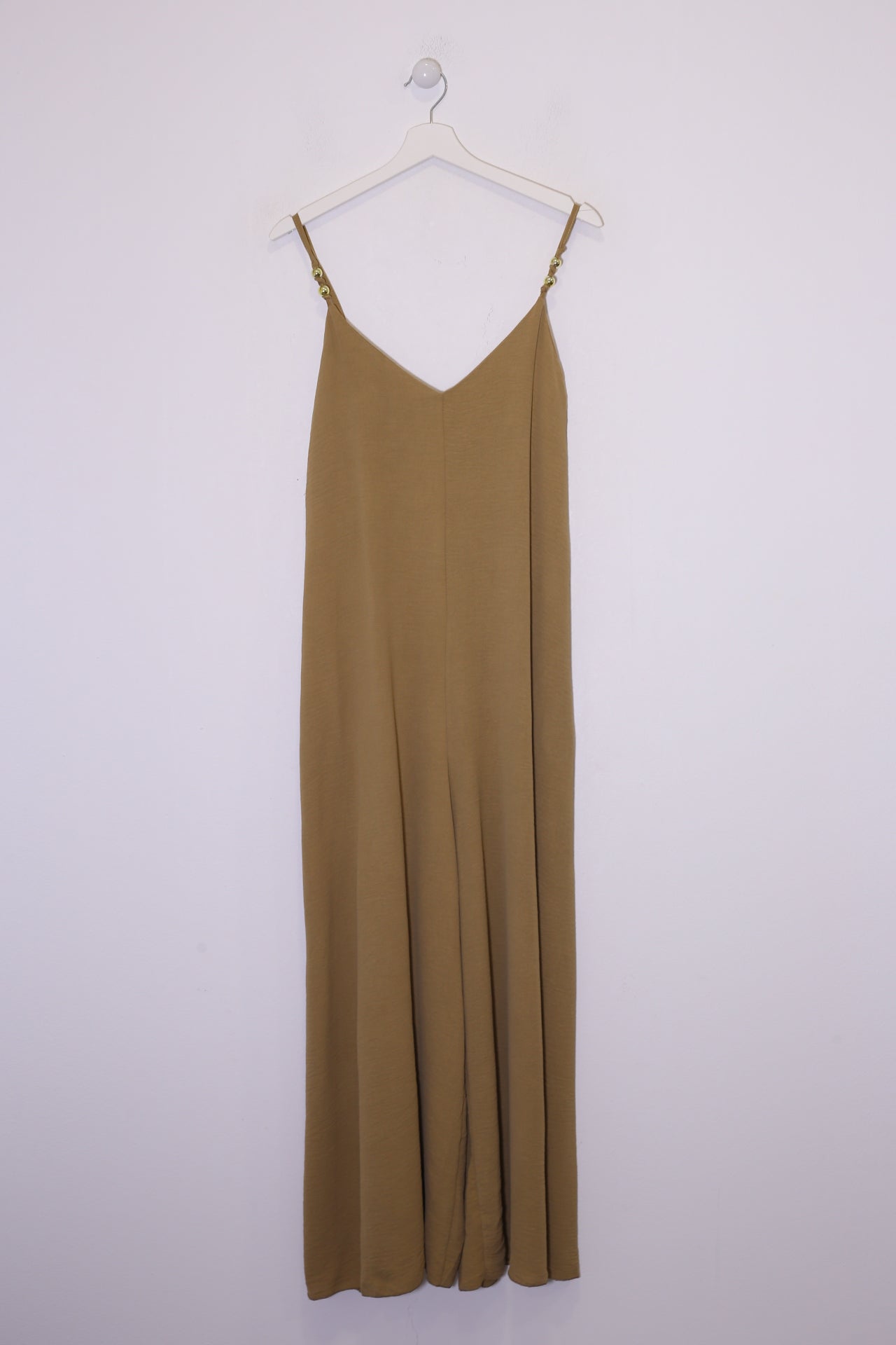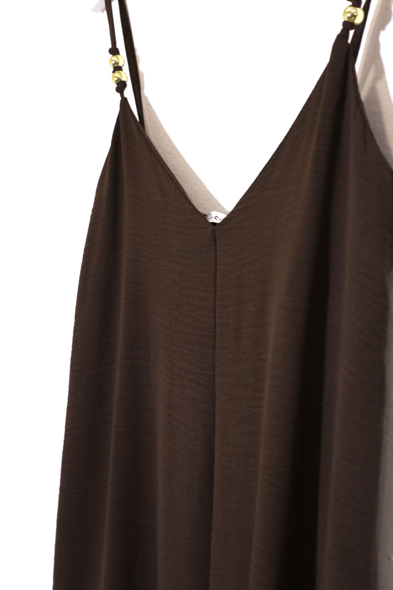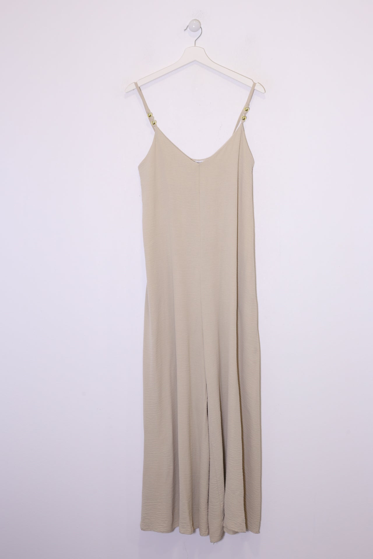 Mono de tirantes finos con detalle de abalorios, escote en pico y pierna ancha de corte fluido.
