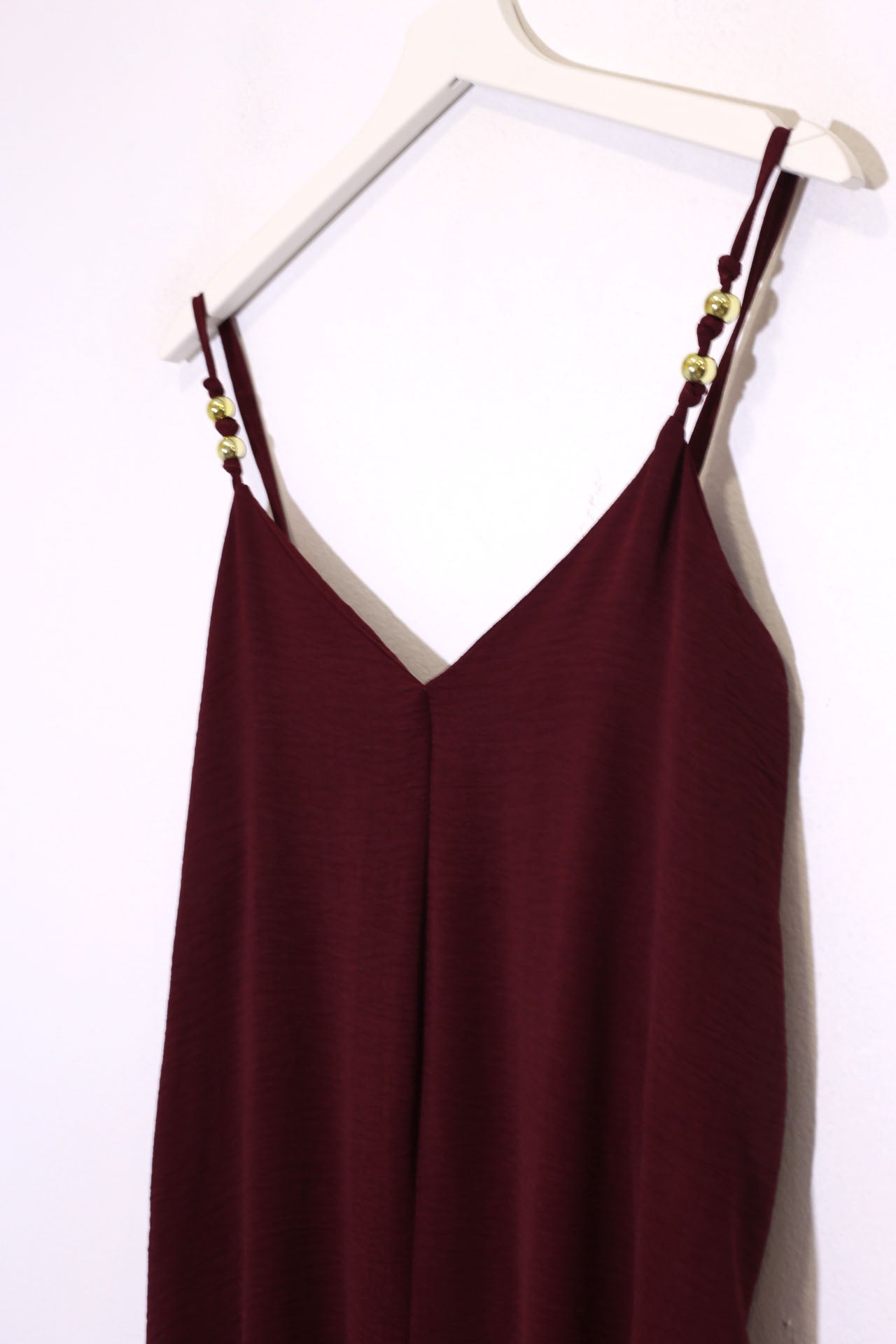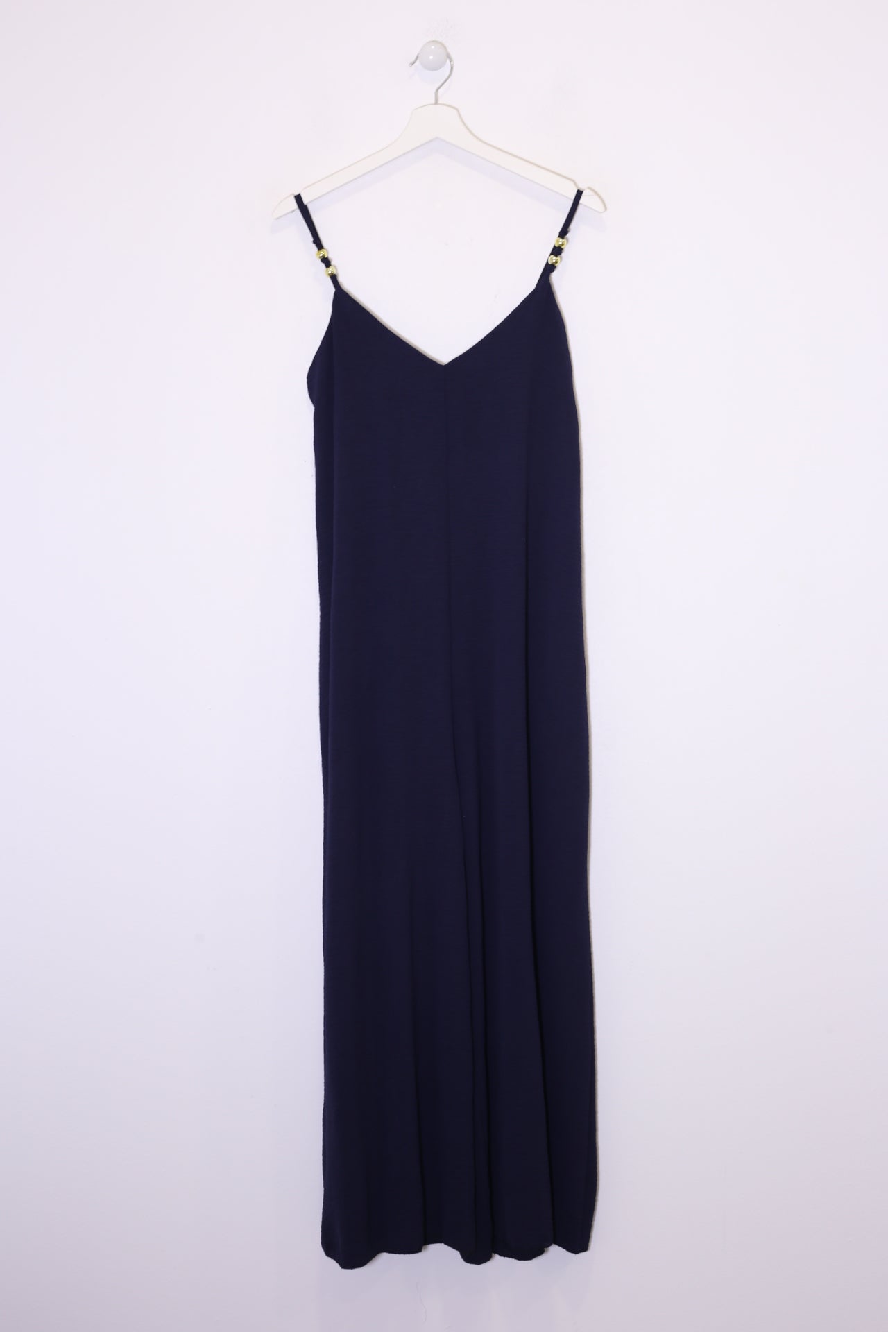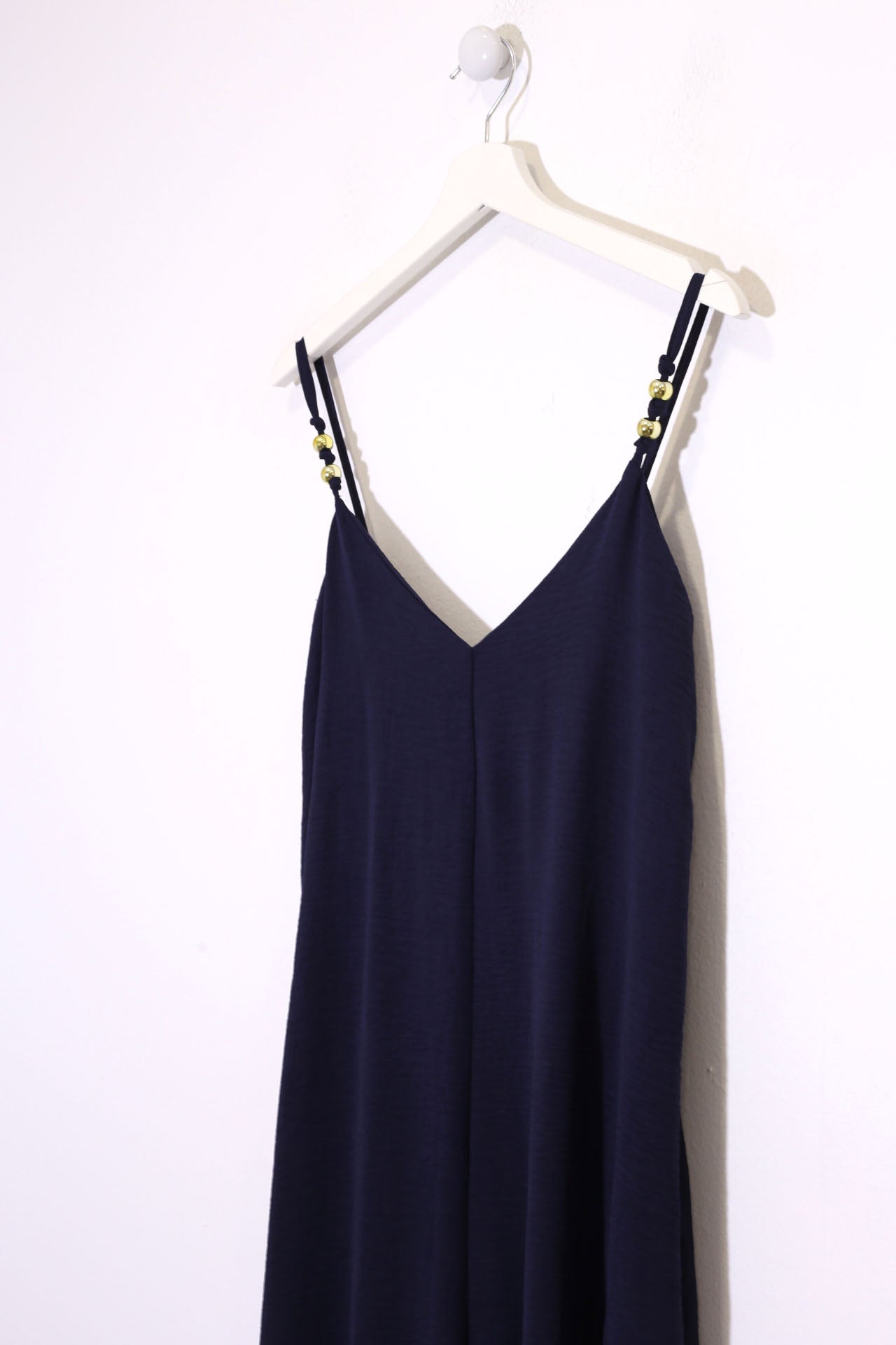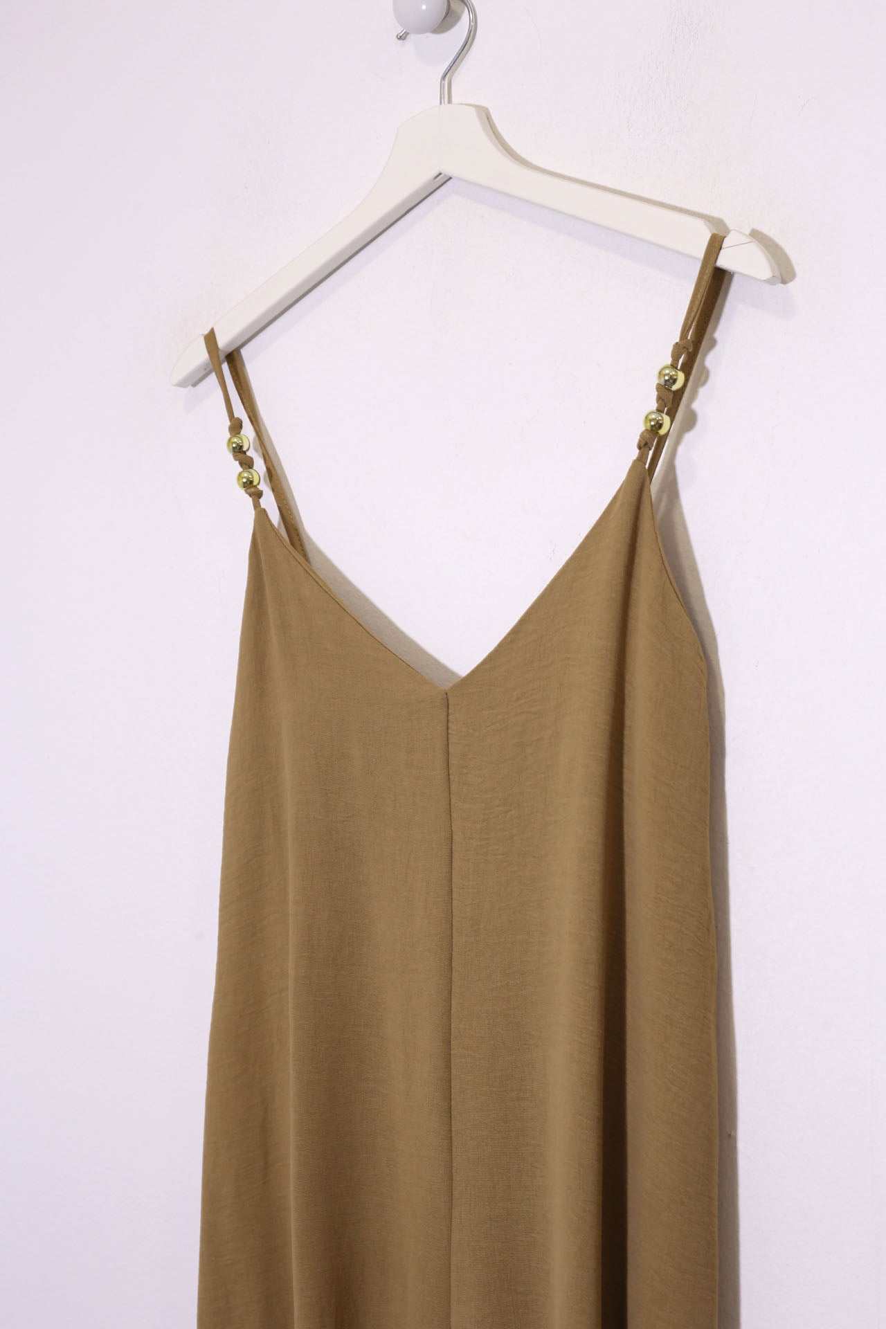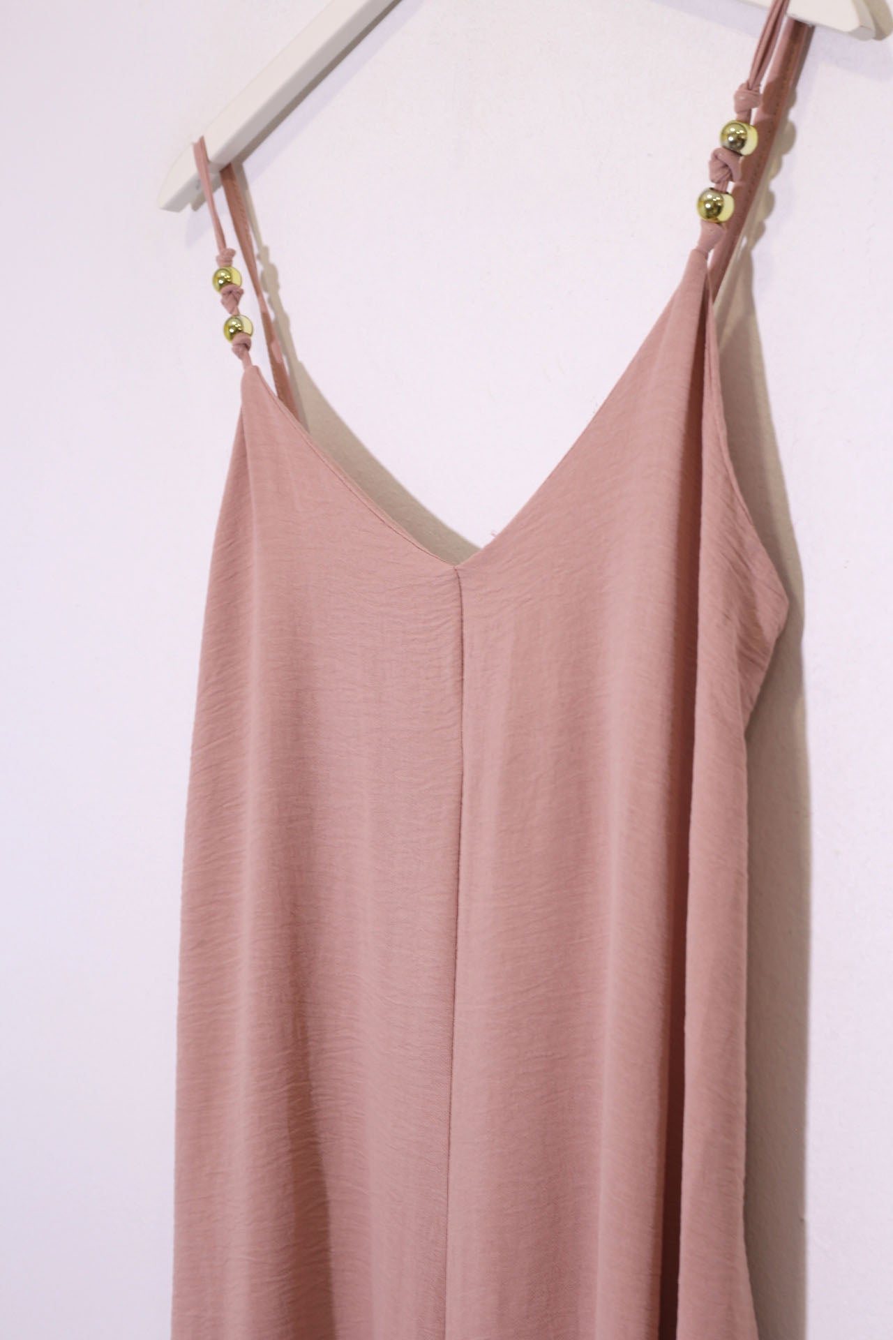 Mono de tirantes finos con detalle de abalorios, escote en pico y pierna ancha de corte fluido.