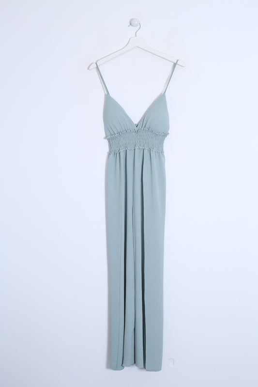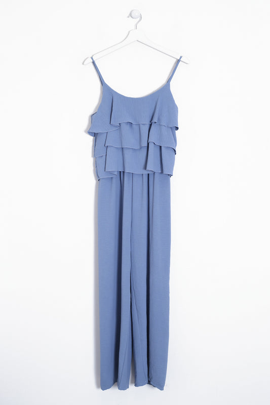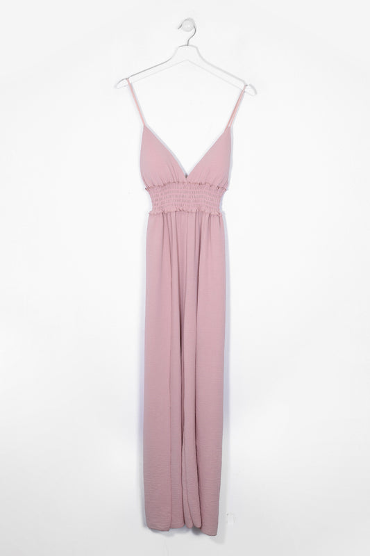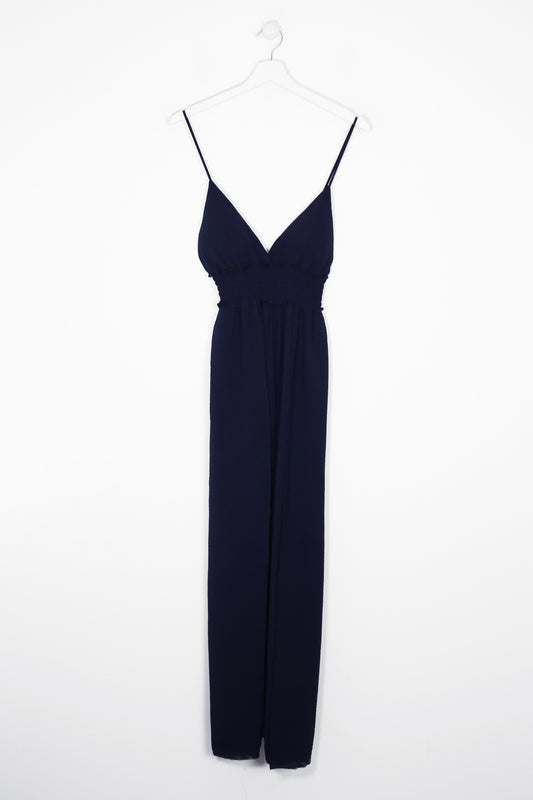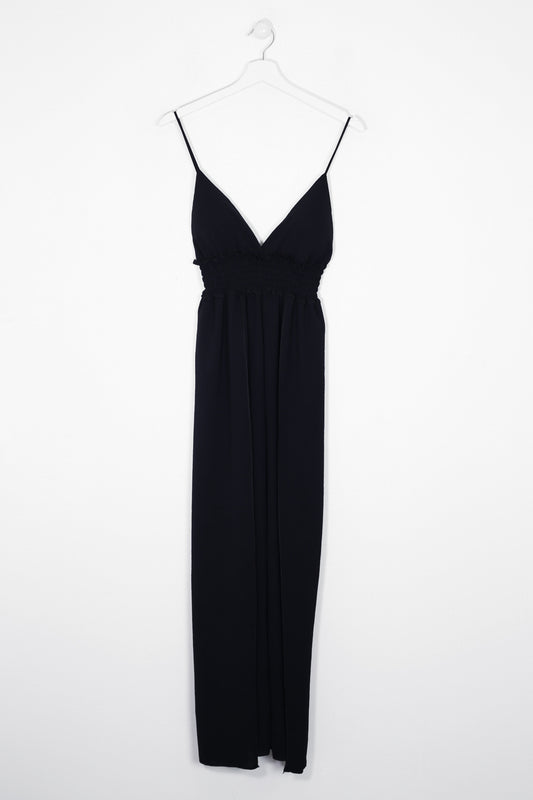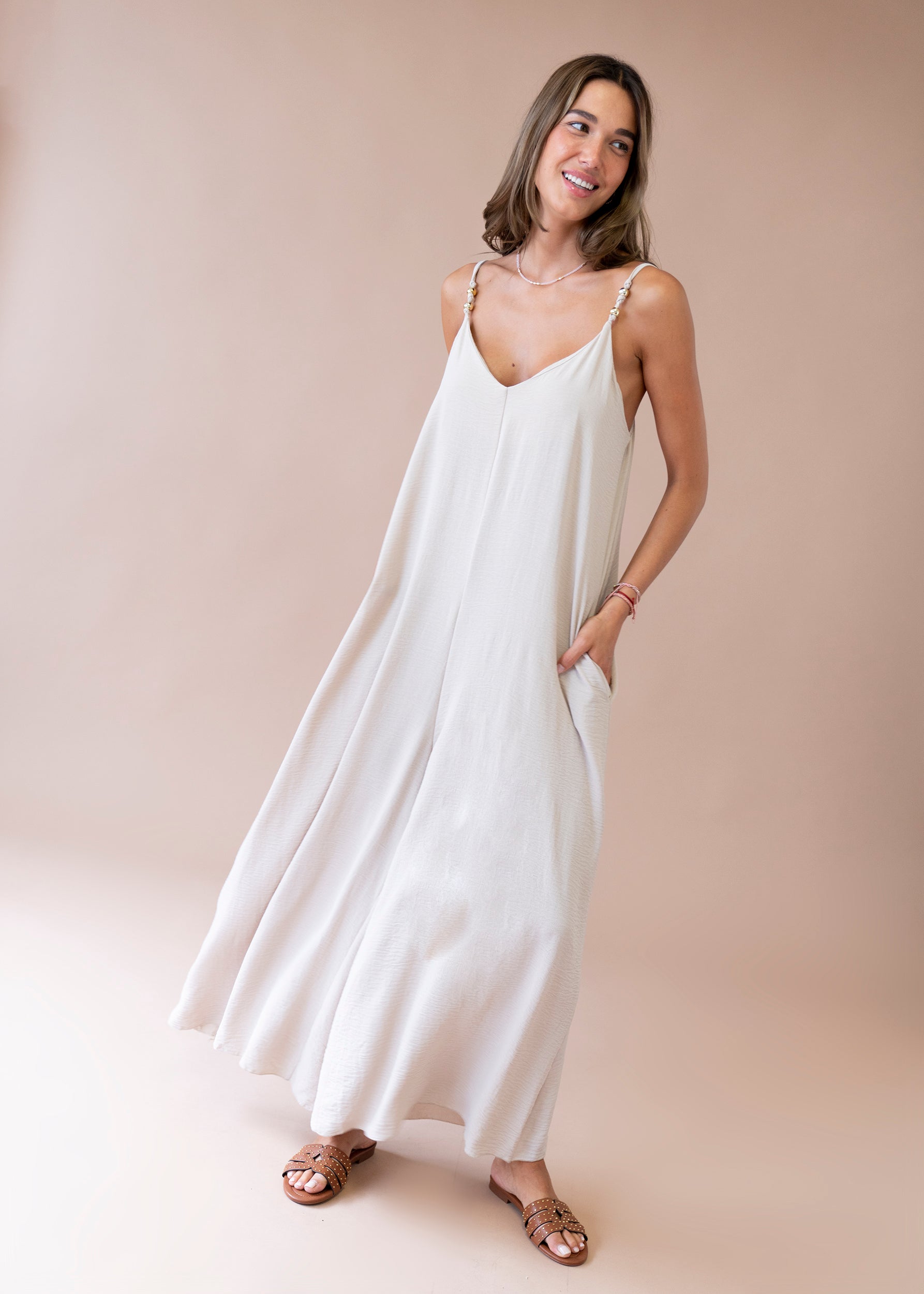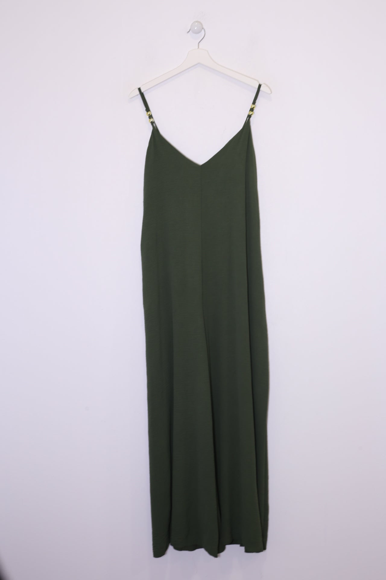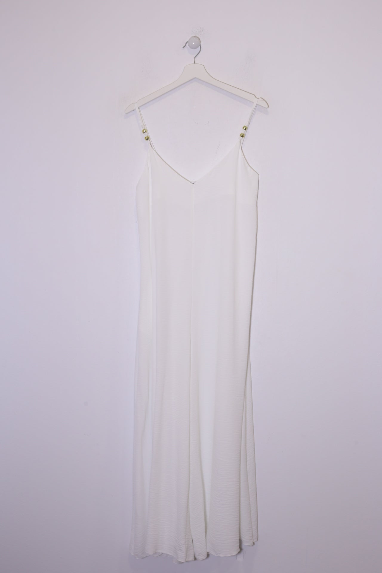 Mono de tirantes finos con detalle de abalorios, escote en pico y pierna ancha de corte fluido.