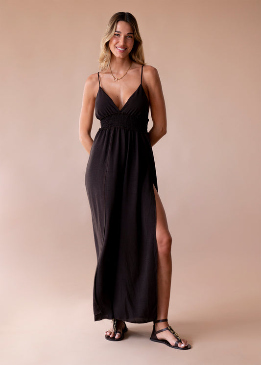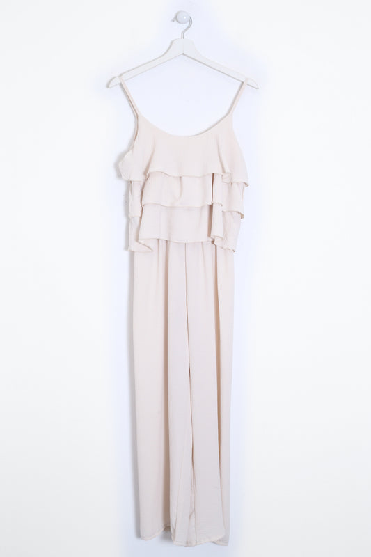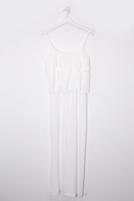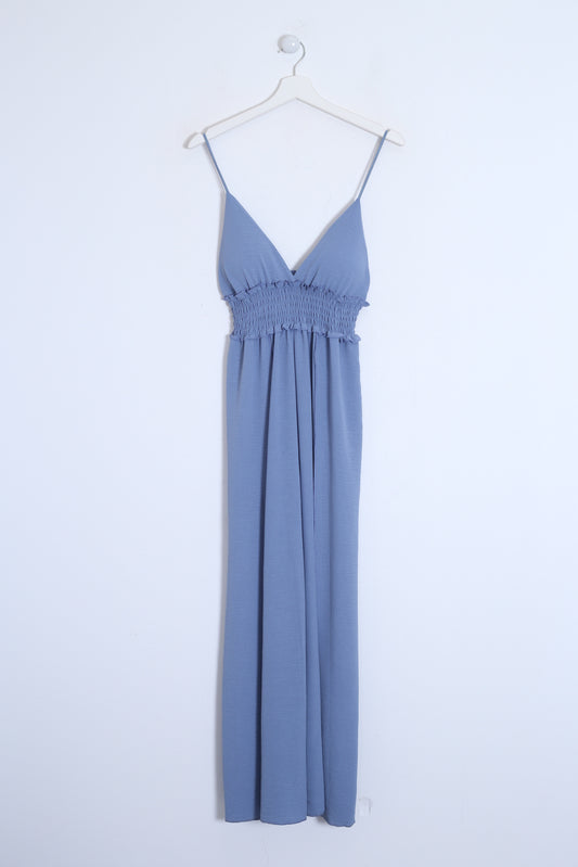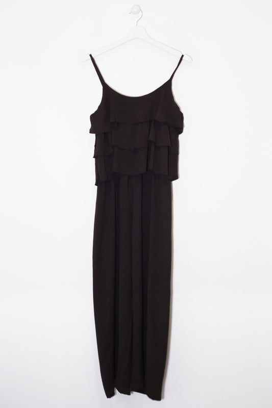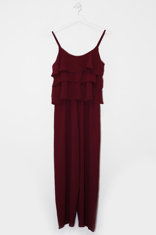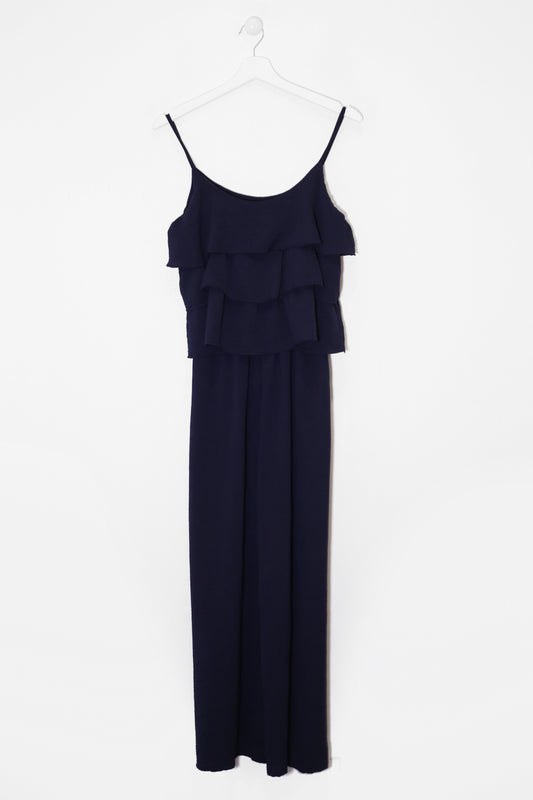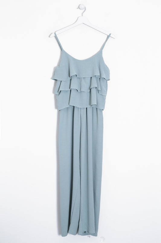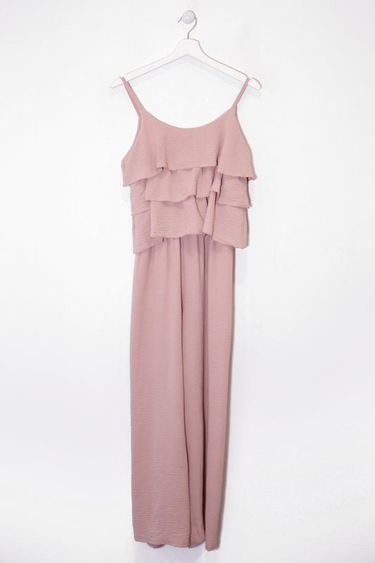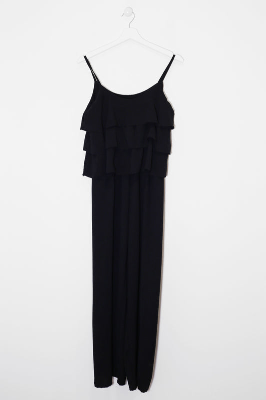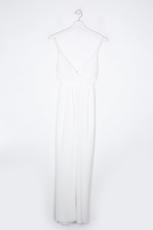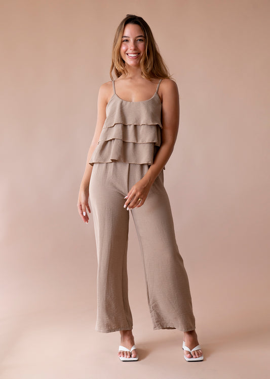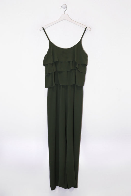 Mono de tirantes finos con detalle de abalorios, escote en pico y pierna ancha de corte fluido.