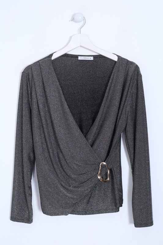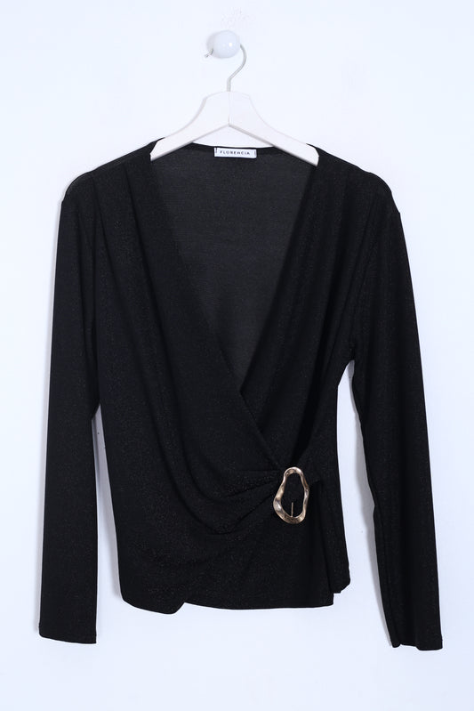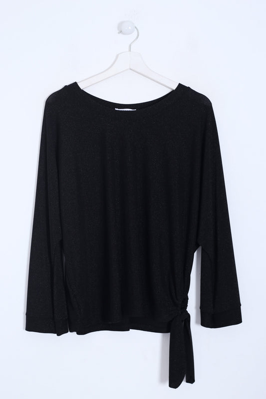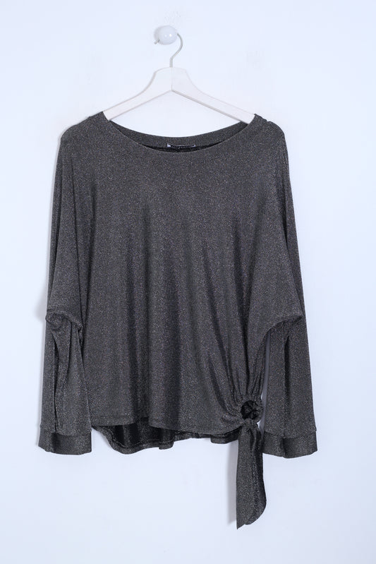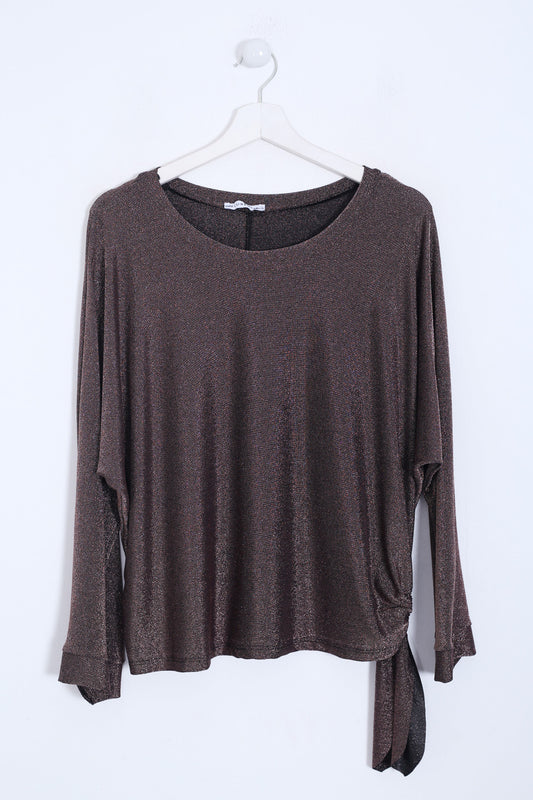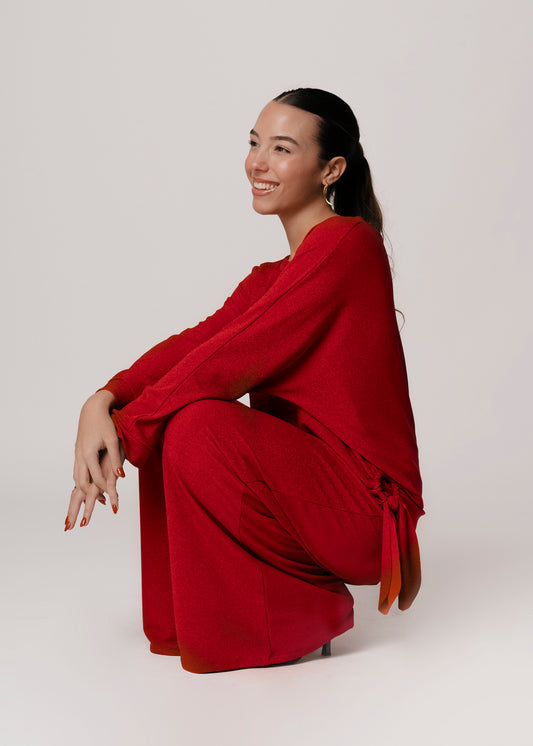 Pantalones tipo palazzo con cintura elástica y pierna ancha. Tejido con brillos de lurex.