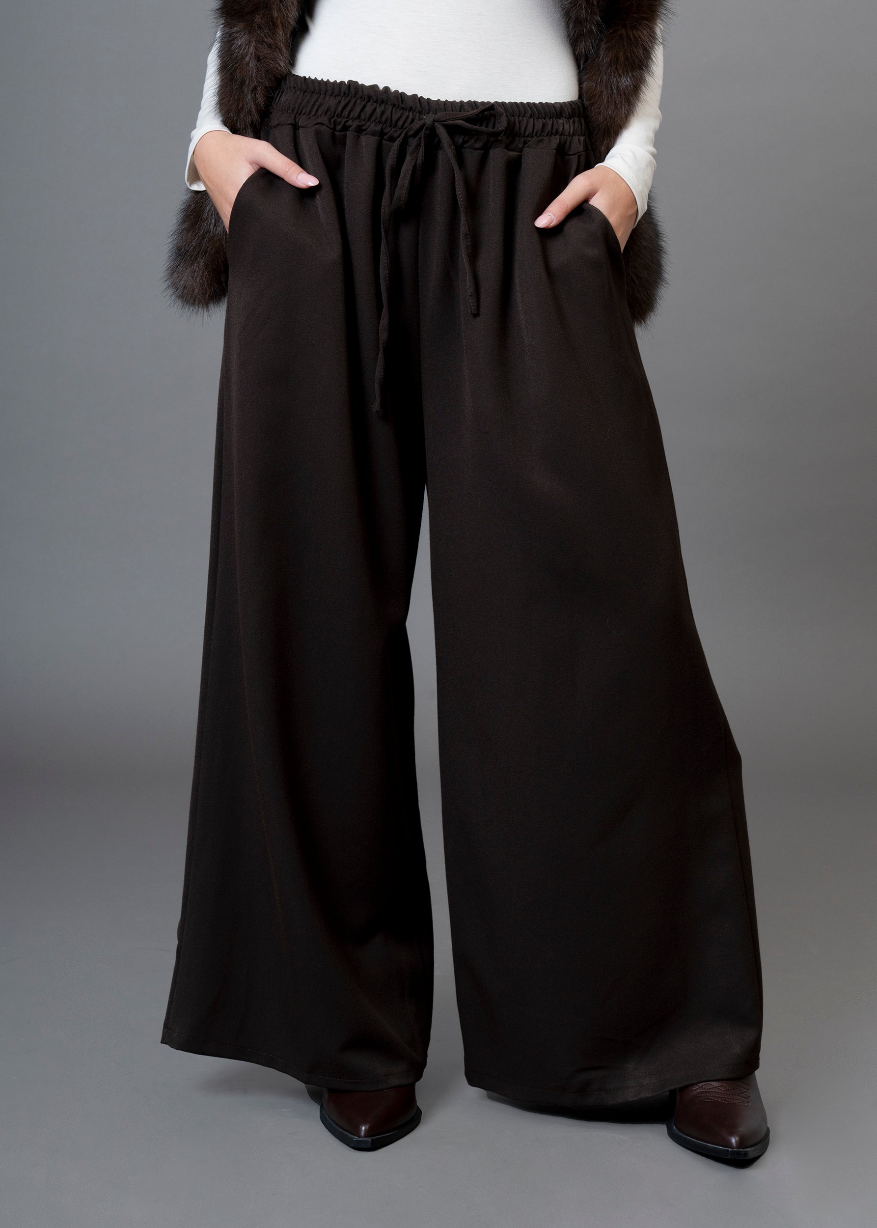 Pantalones de talle alto y cintura elástica con cordón decorativo. Bolsillos frontales. Pierna ancha y corte fluido.