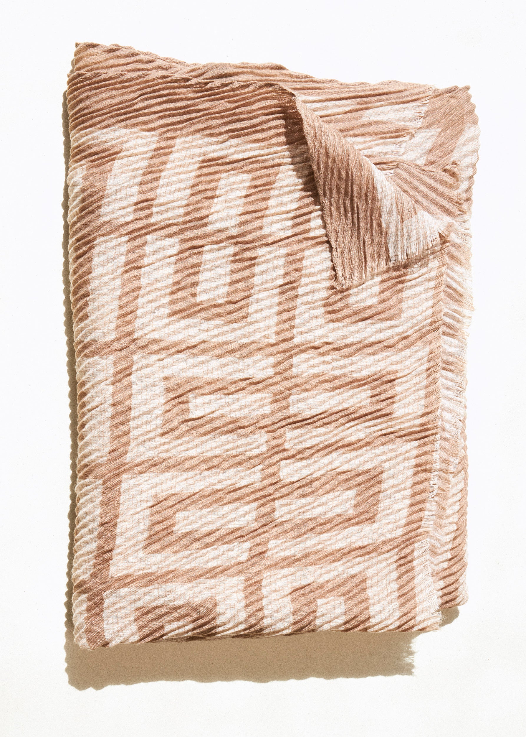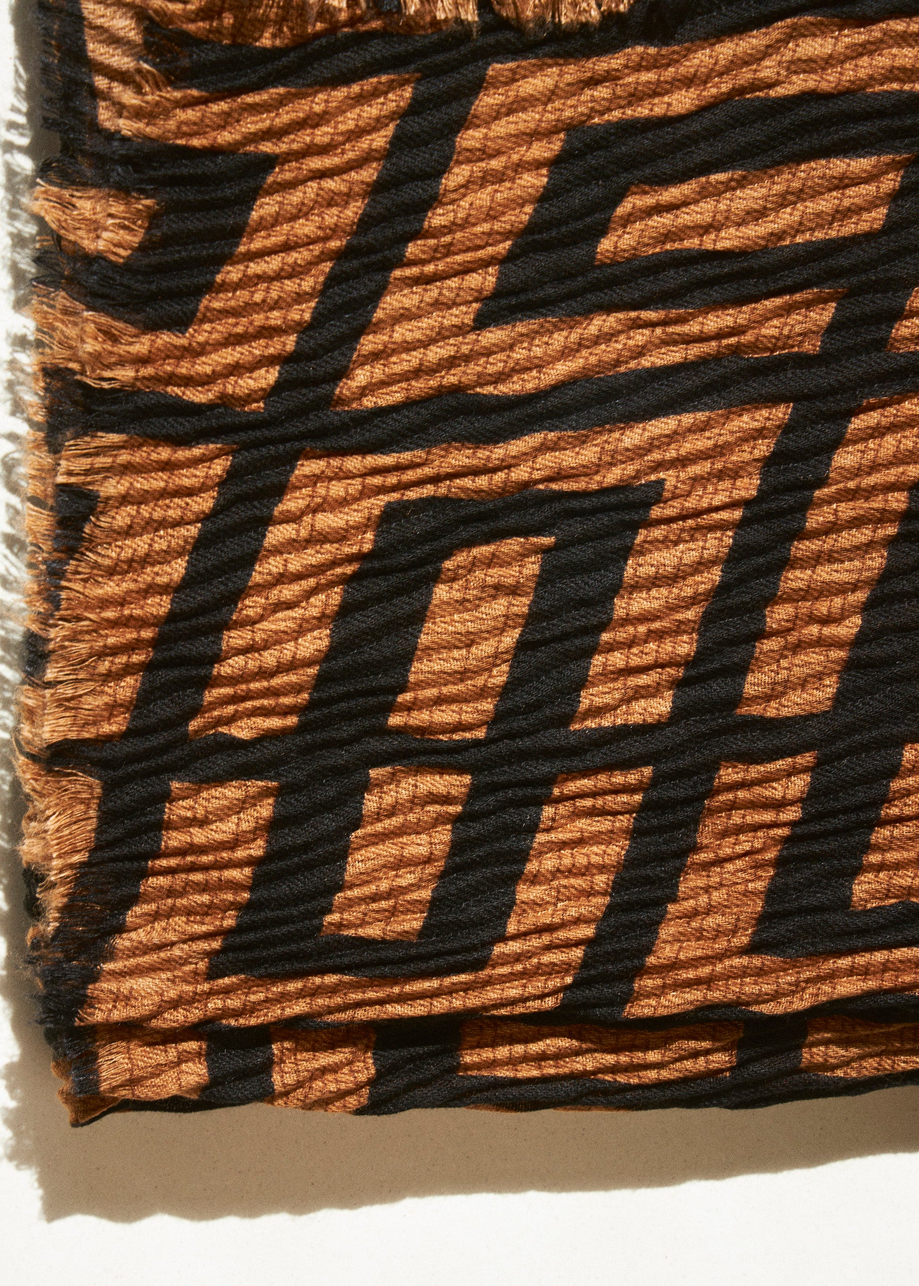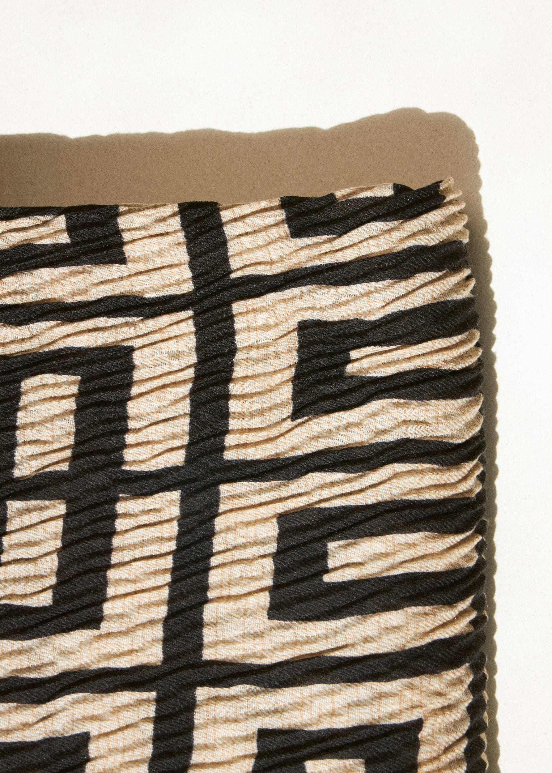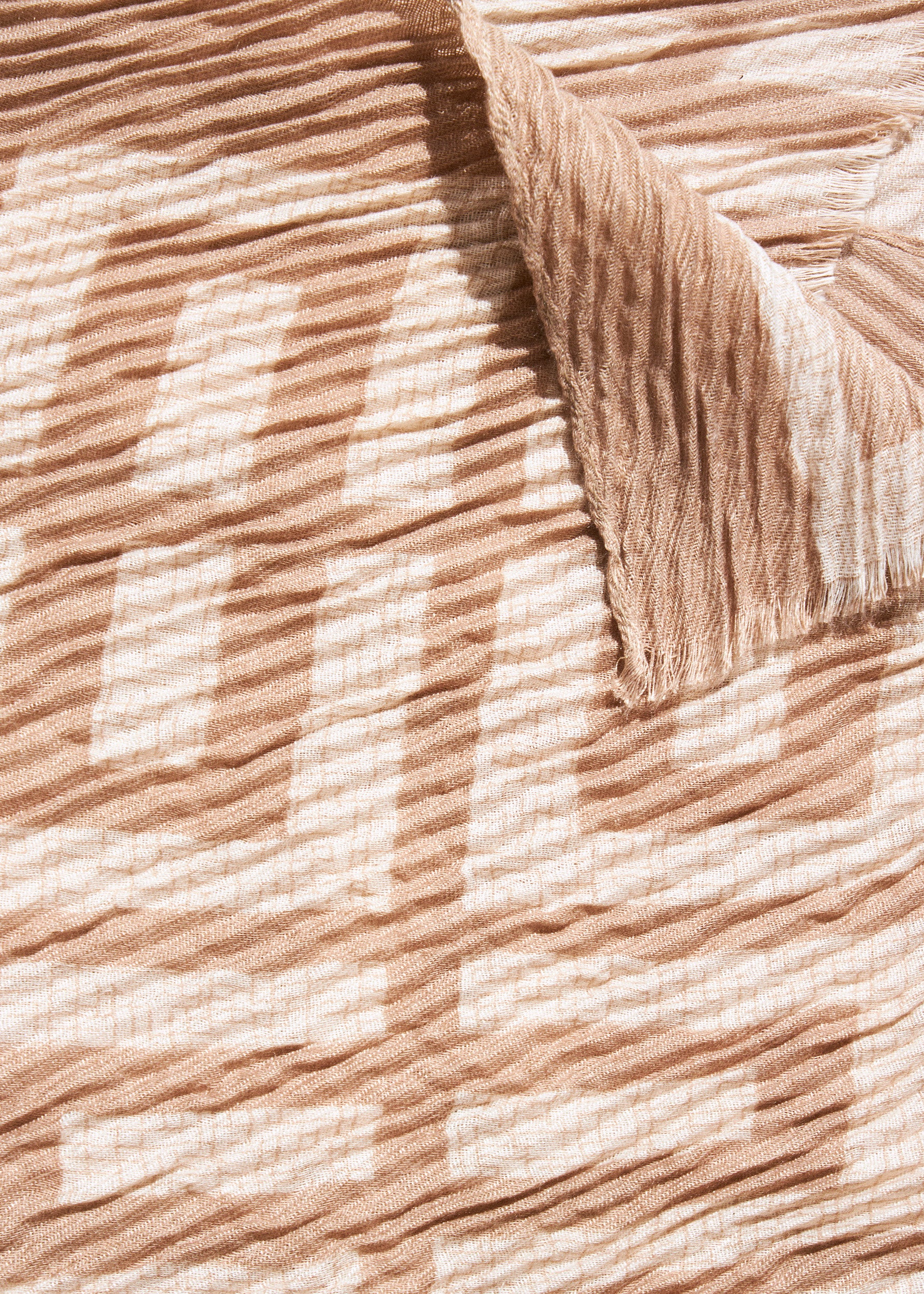 Pañuelo con estampado geométrico. Acabados desflecados. Textura plisada. Formato rectangular.