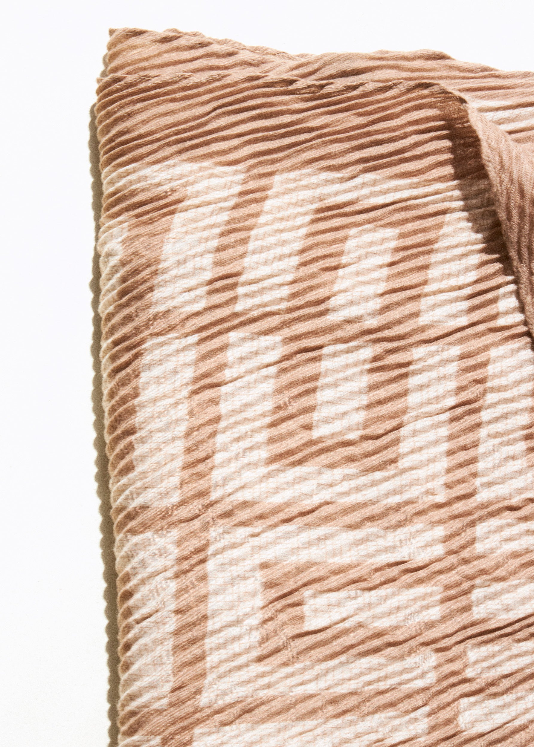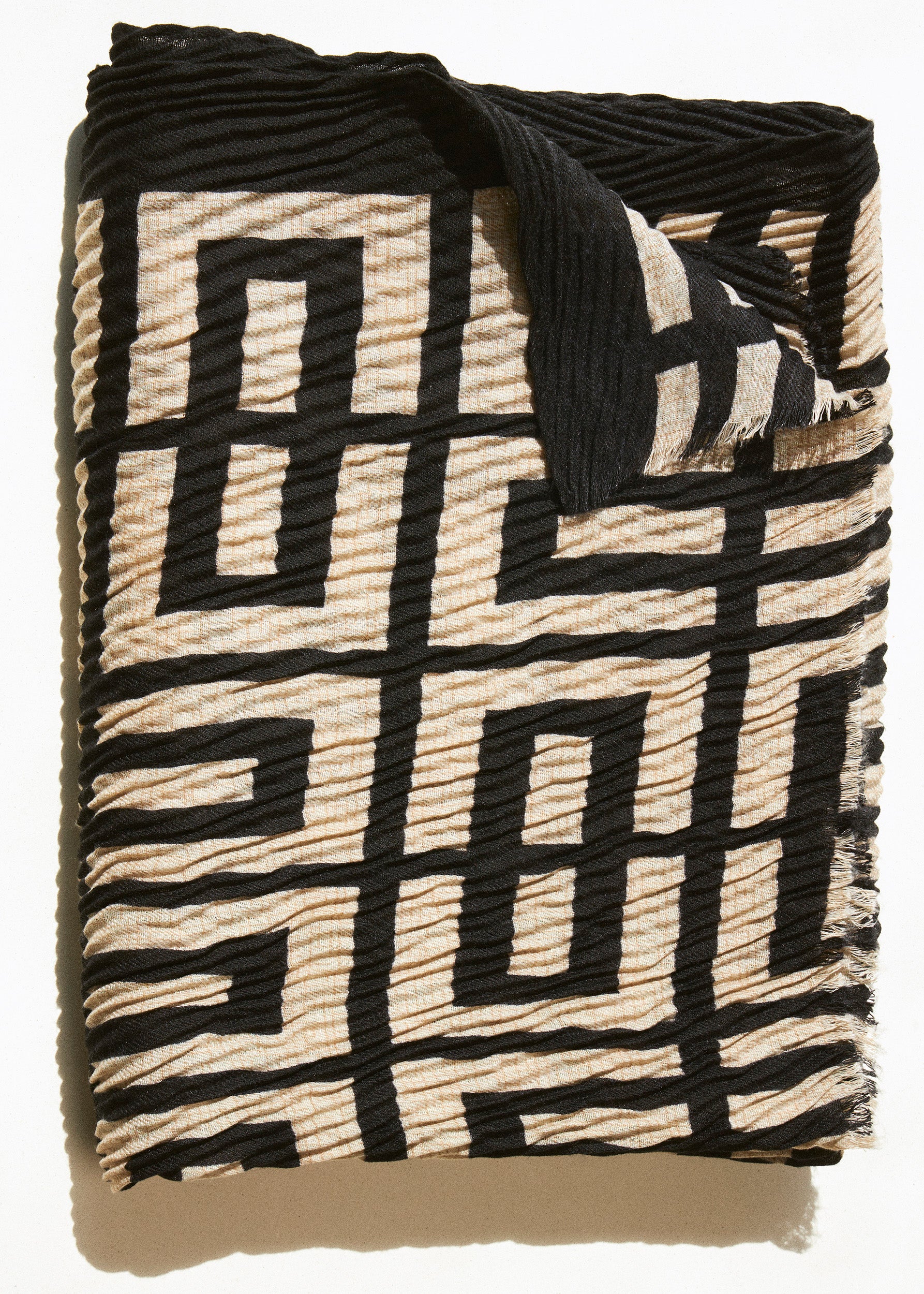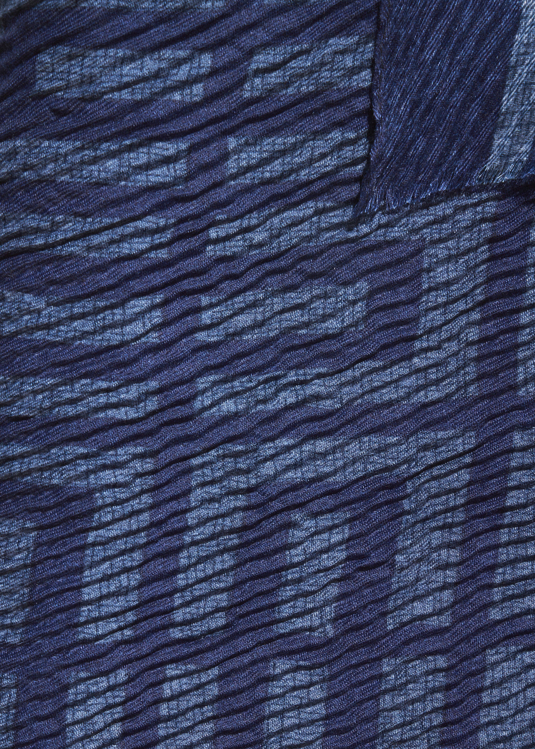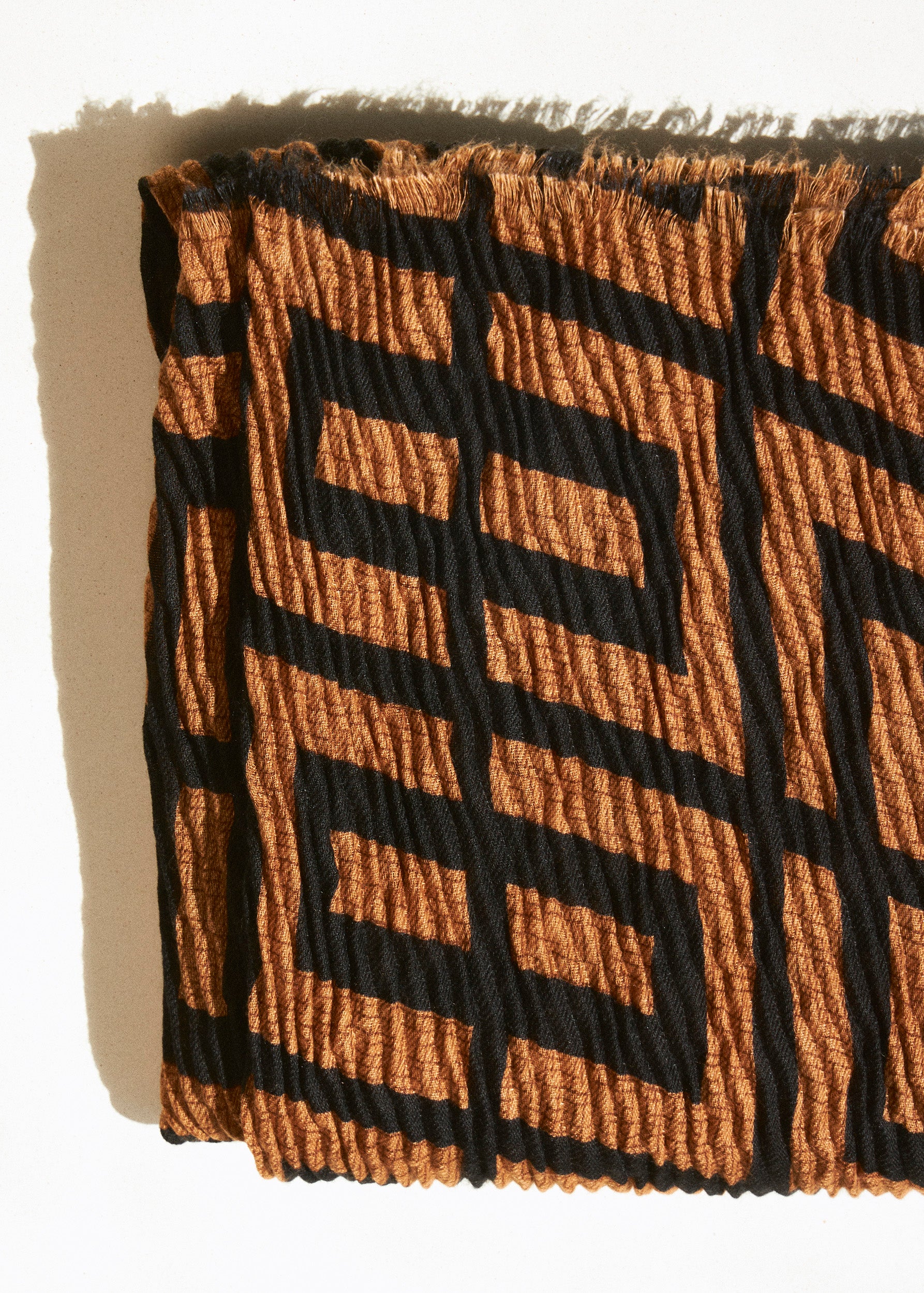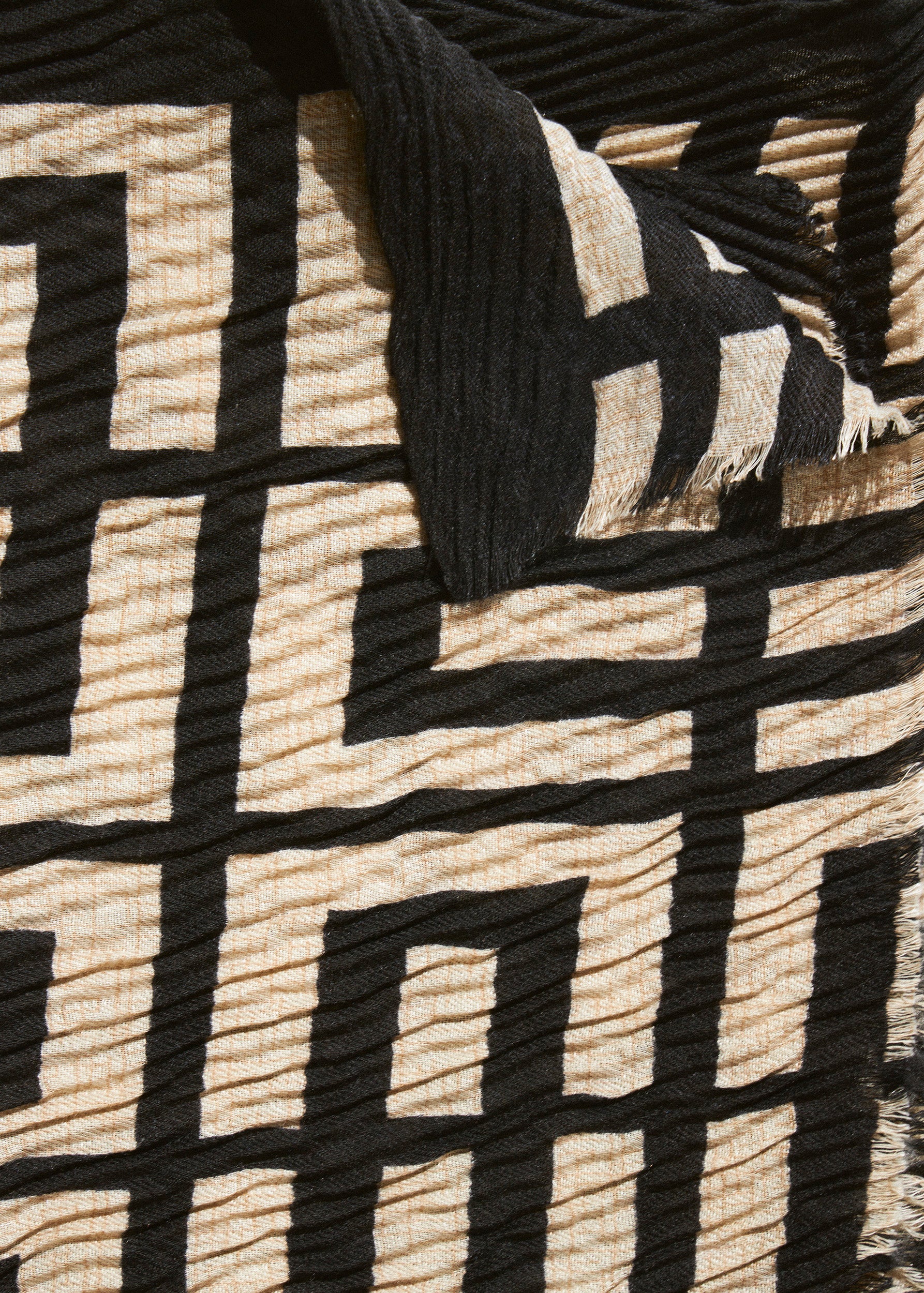 Pañuelo con estampado geométrico. Acabados desflecados. Textura plisada. Formato rectangular.