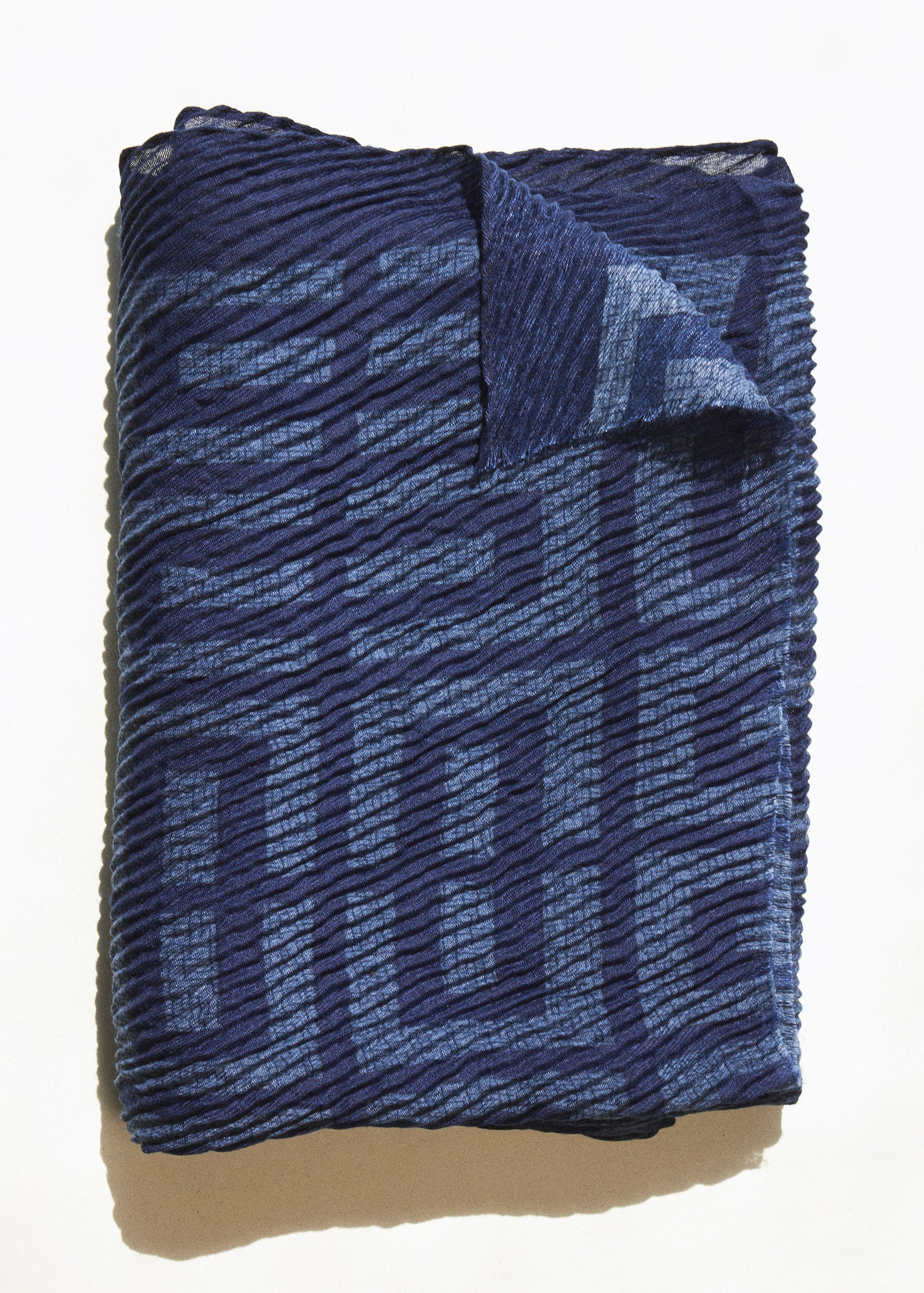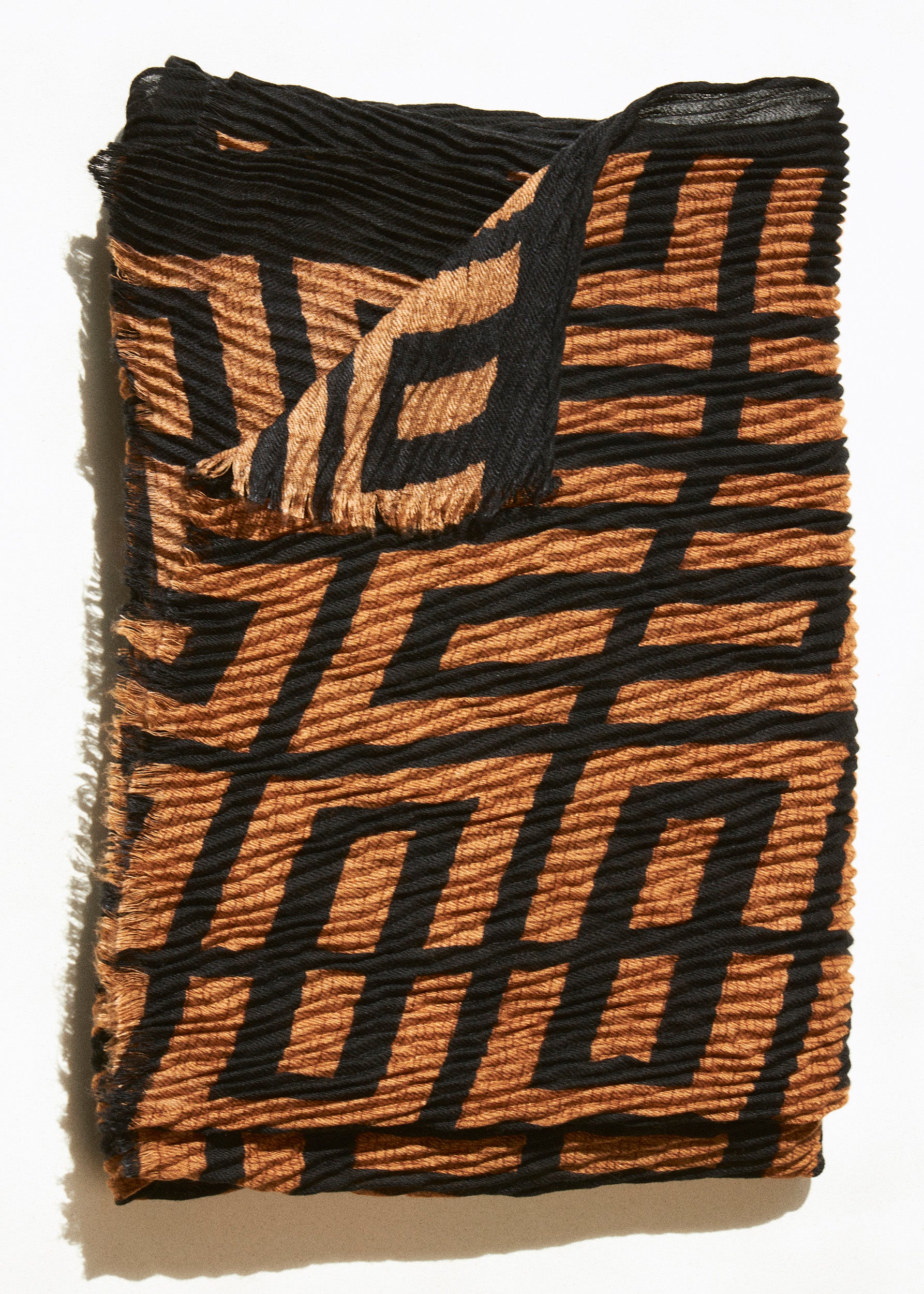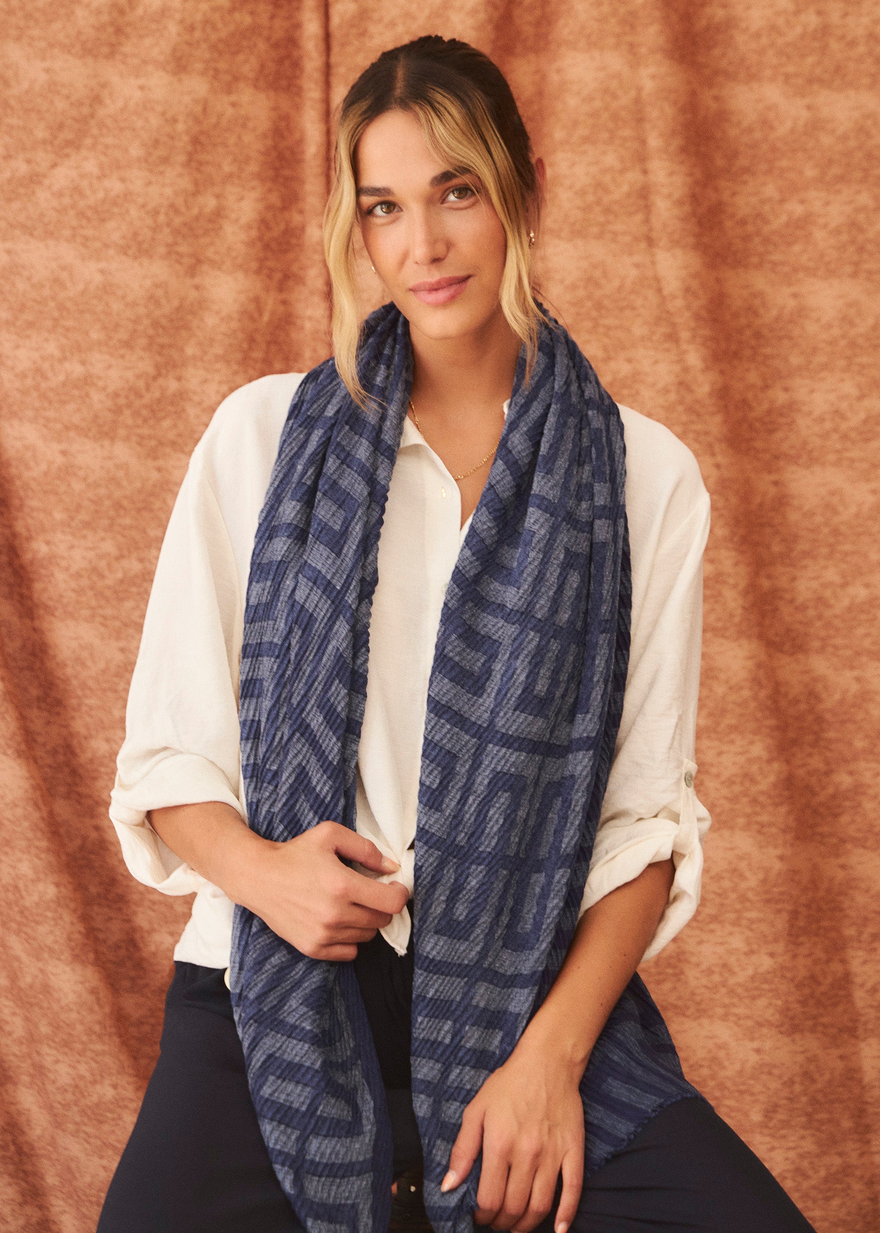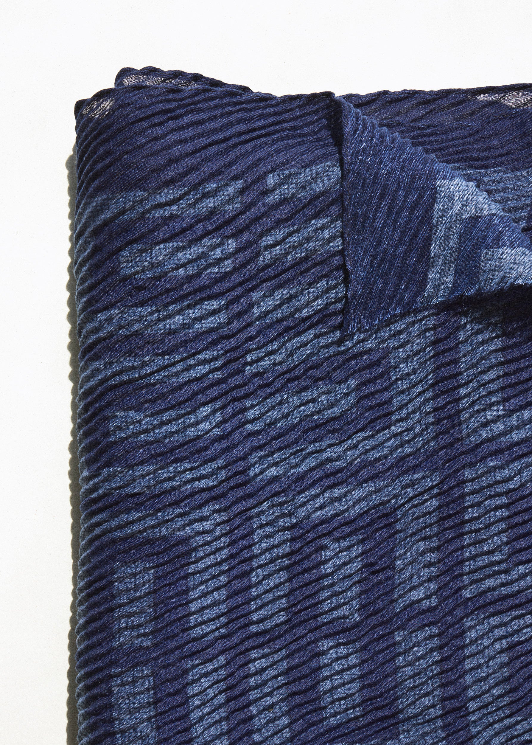 Pañuelo con estampado geométrico. Acabados desflecados. Textura plisada. Formato rectangular.