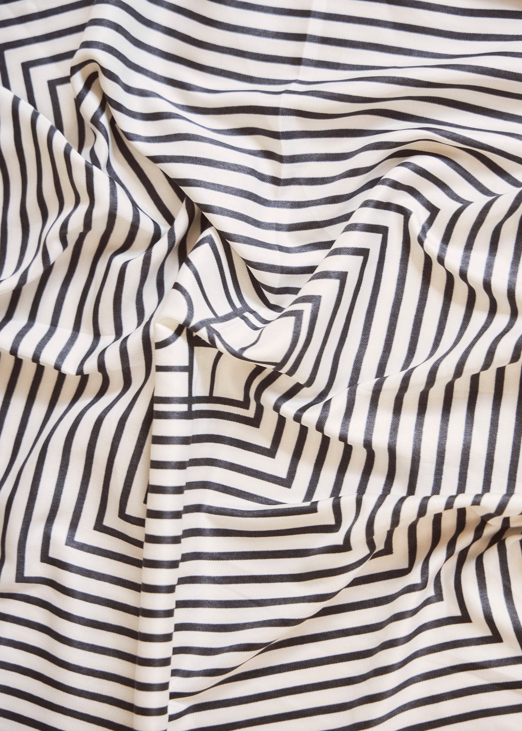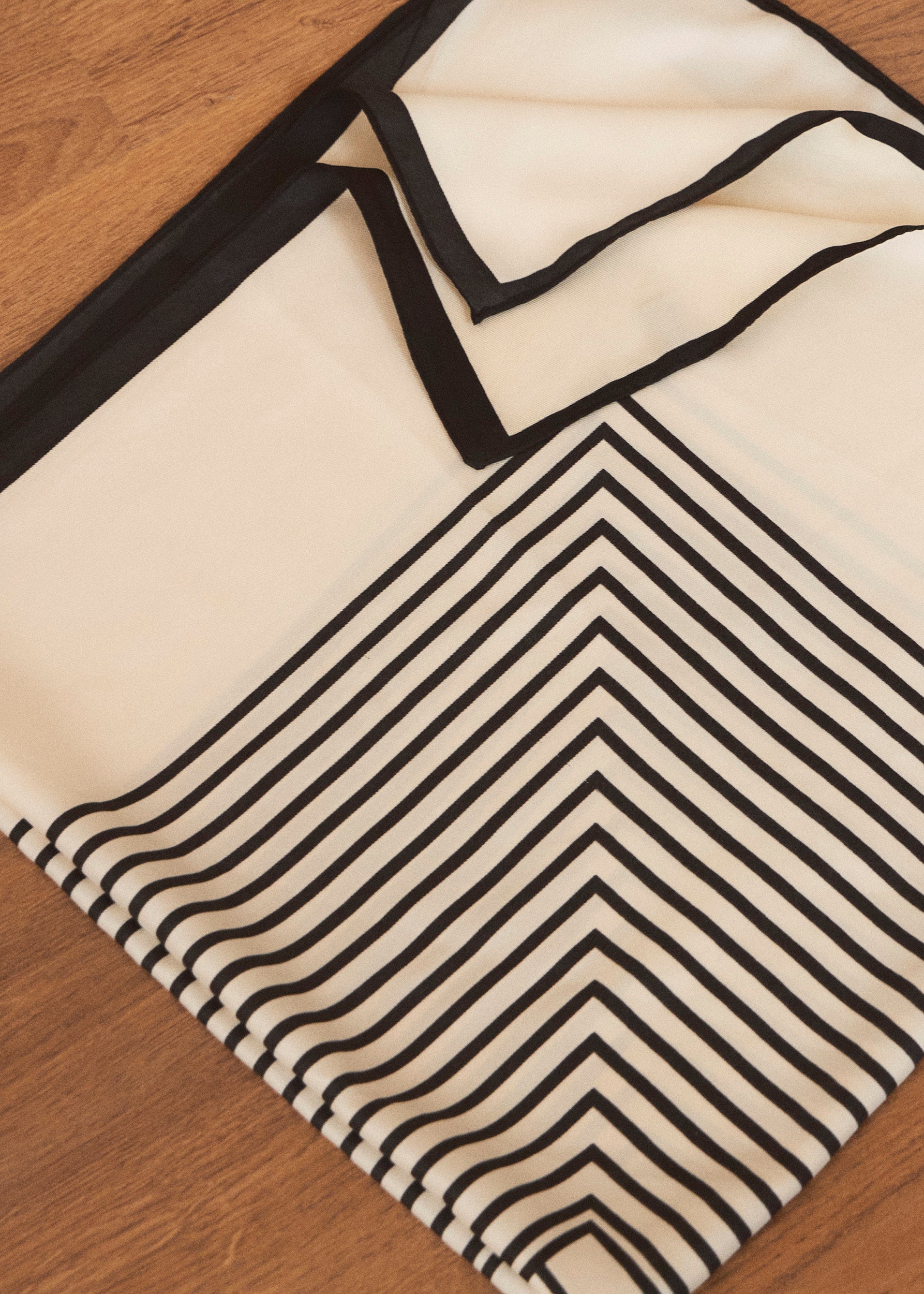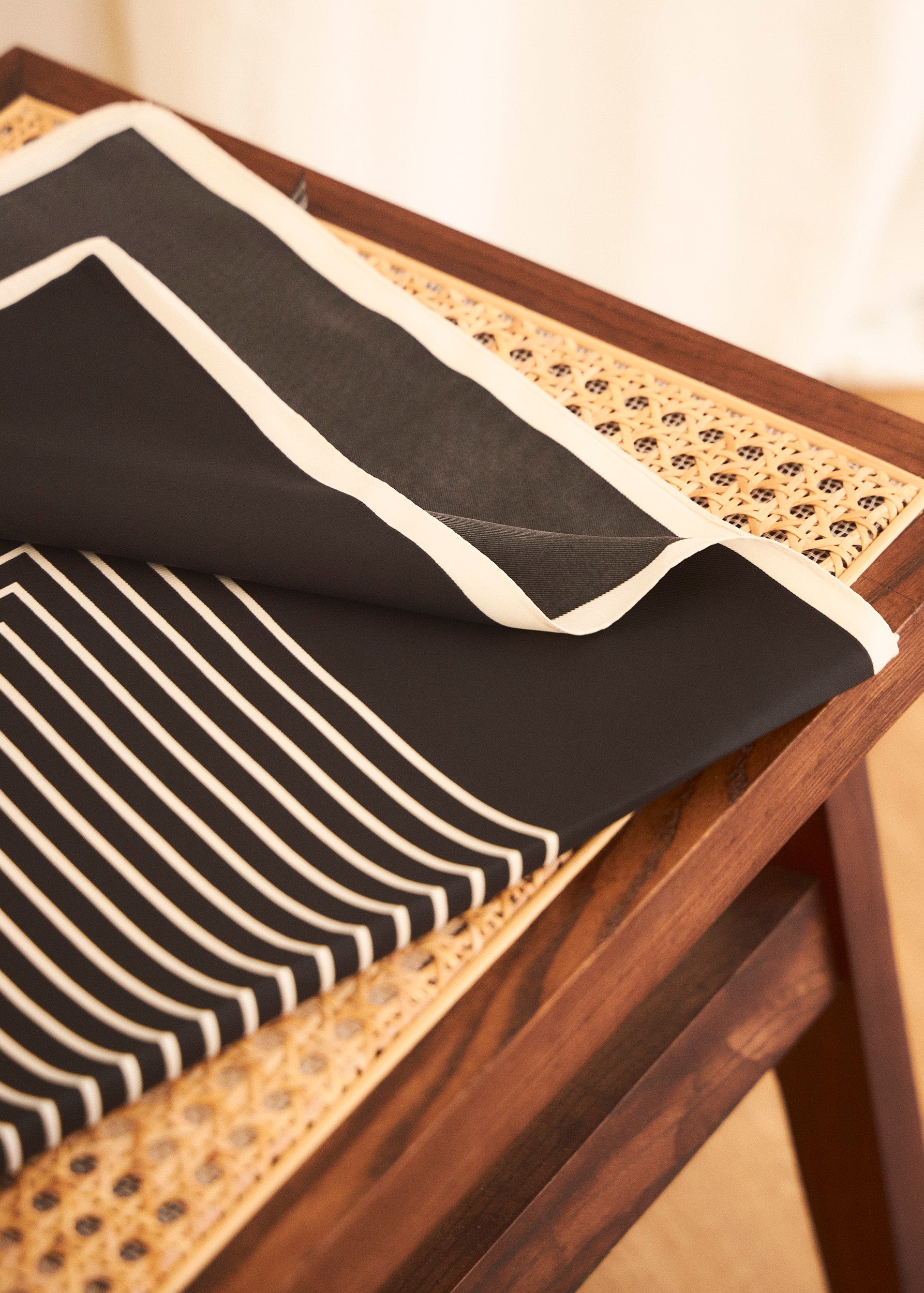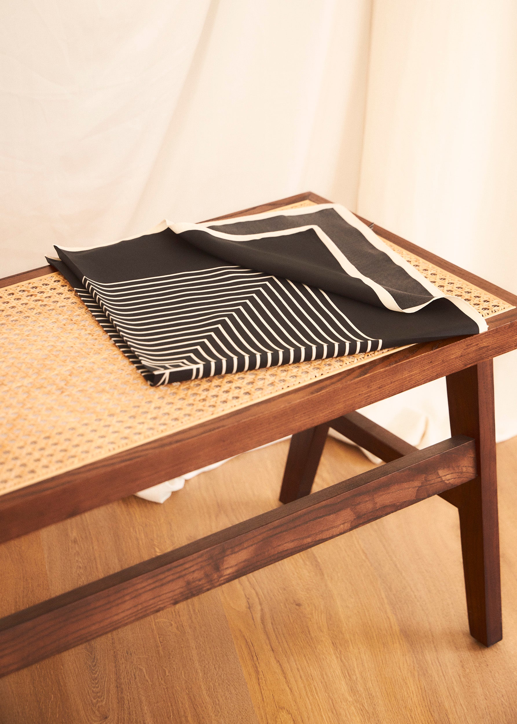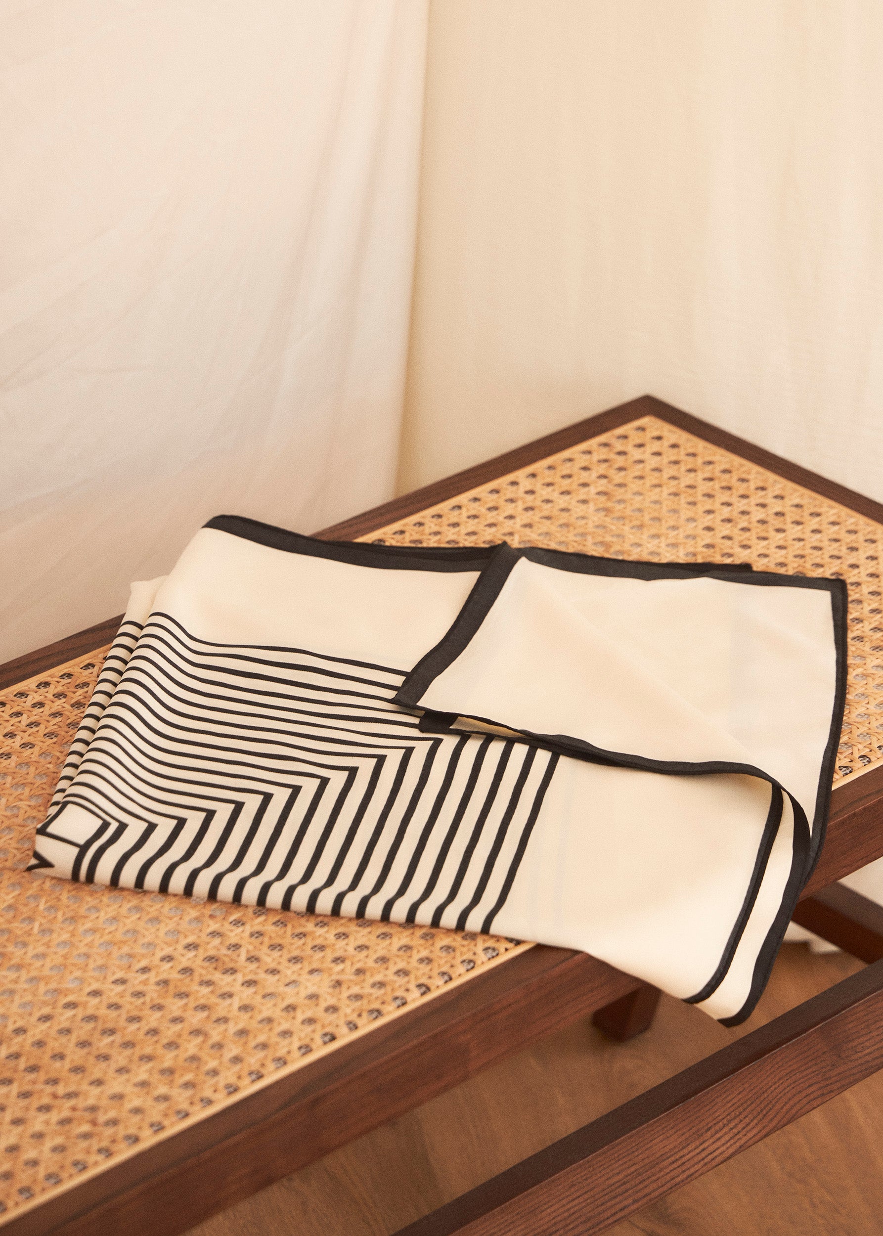Pañuelo cuadrado estampado de cuadrados concéntricos y detalle de letras en centro.