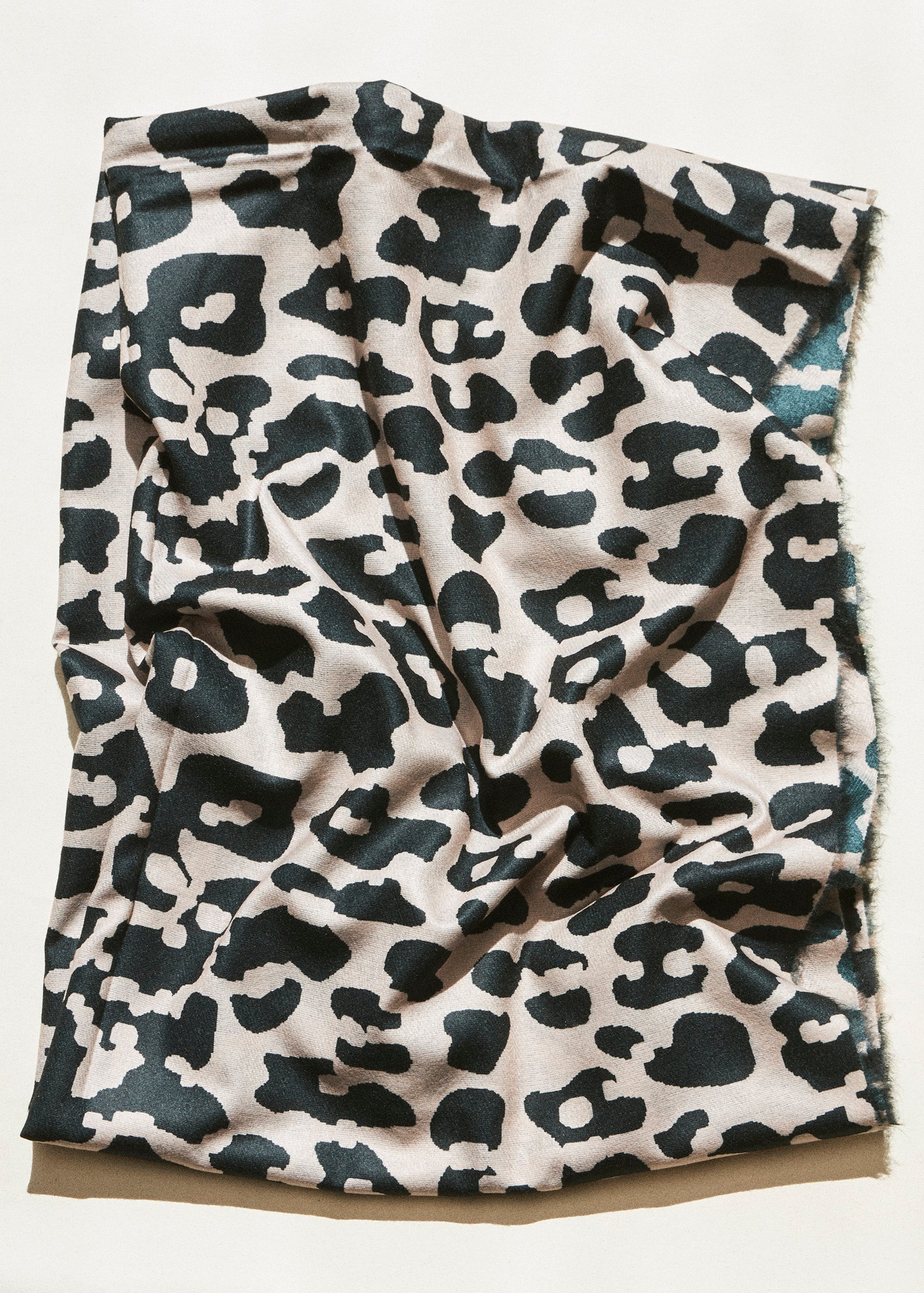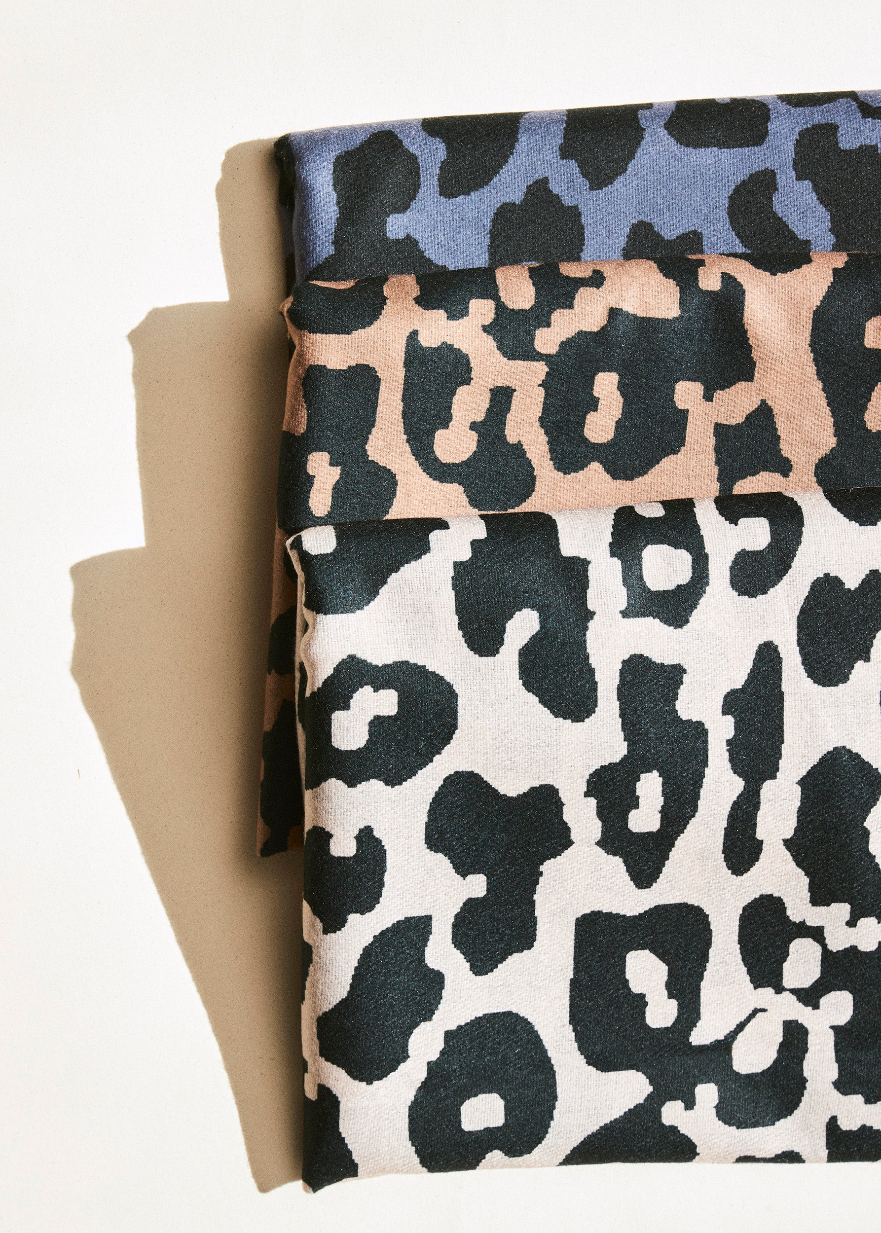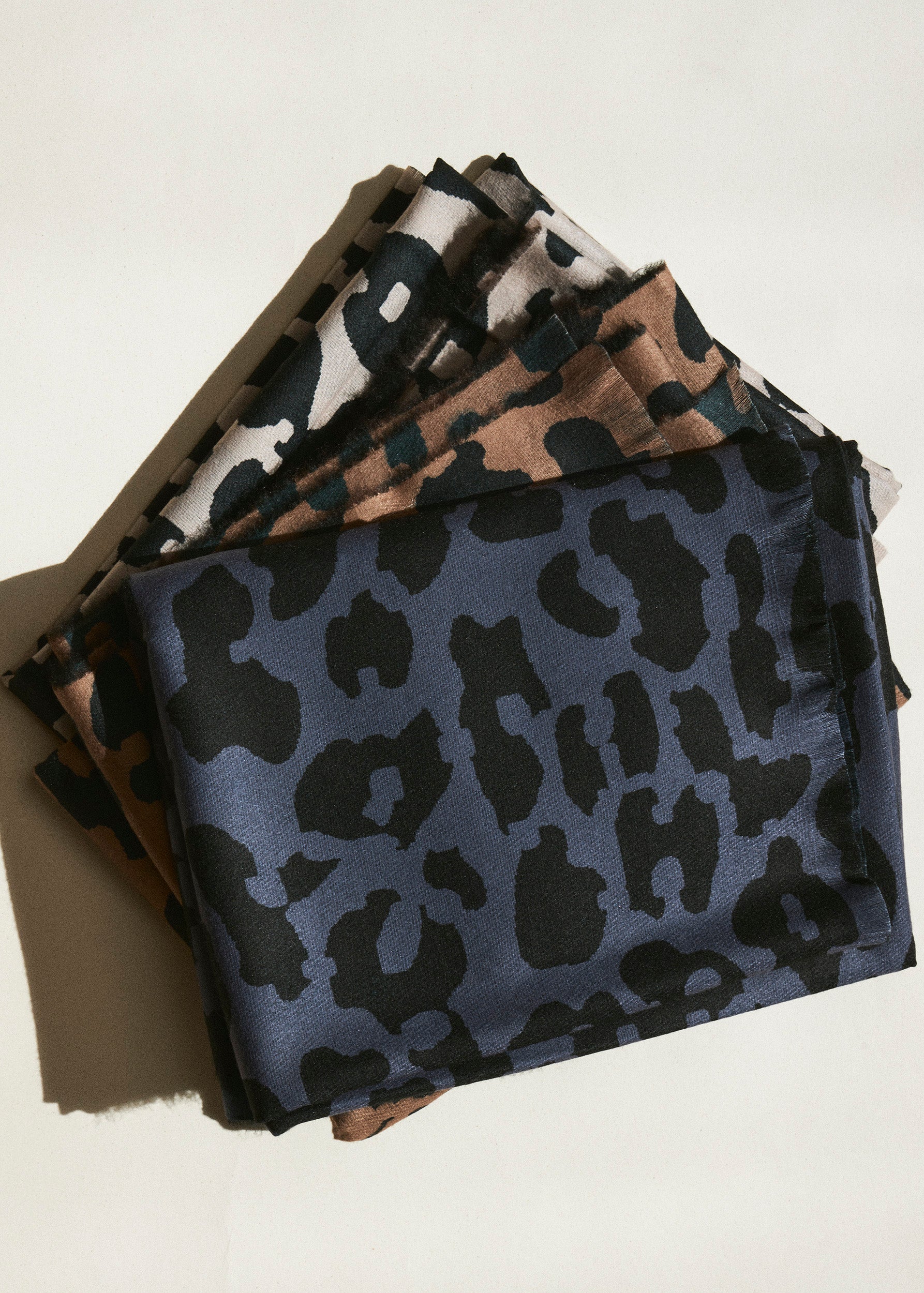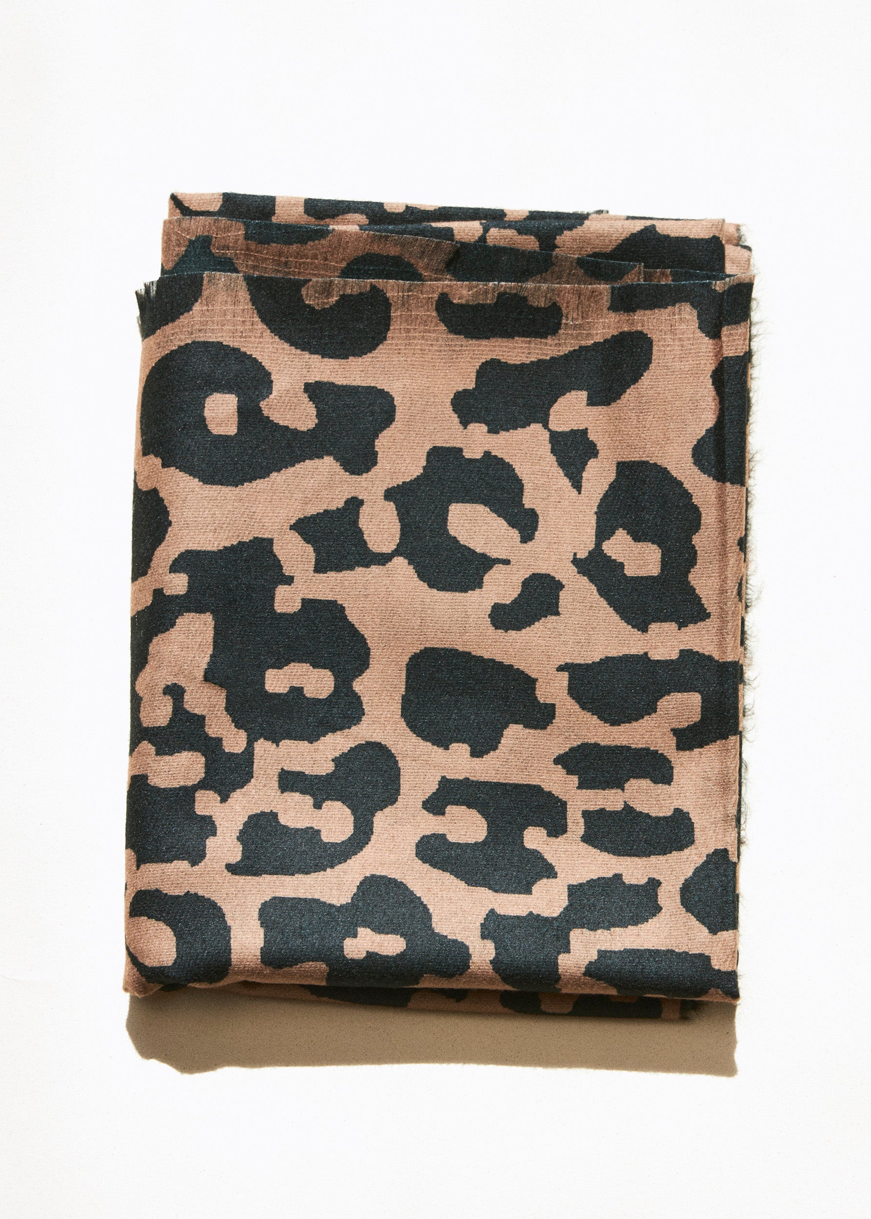 Pañuelo con estampado leopardo bicolor. Formato rectangular. Acabados desflecados.