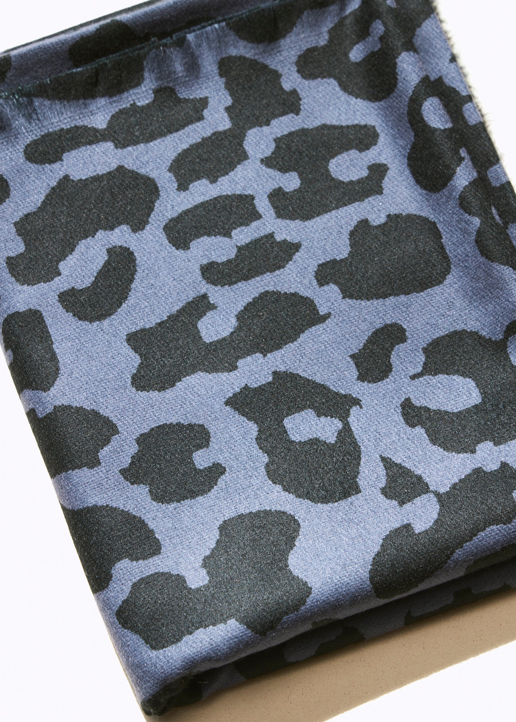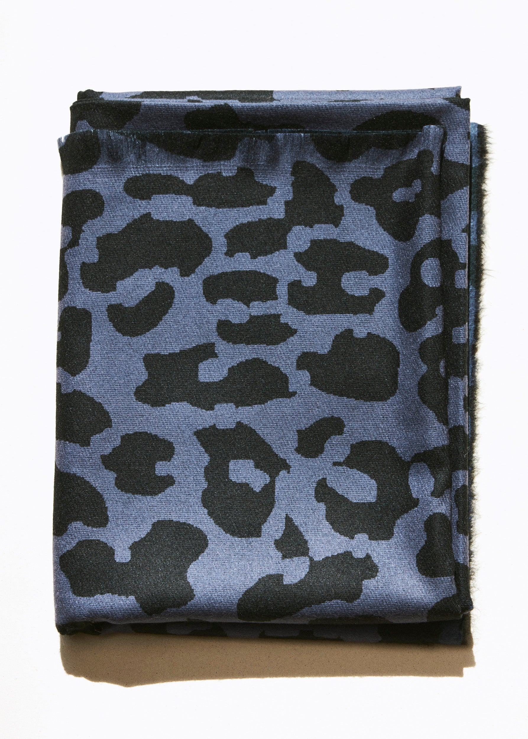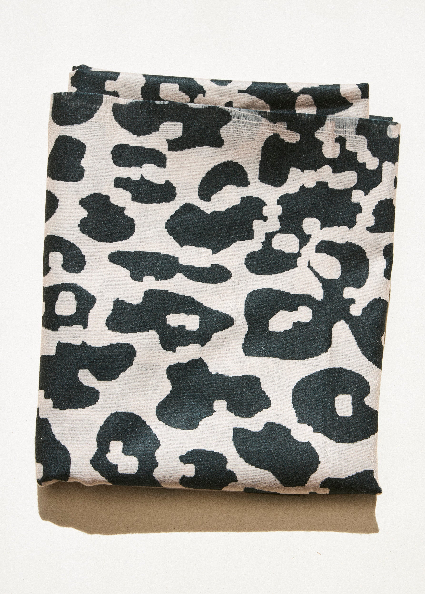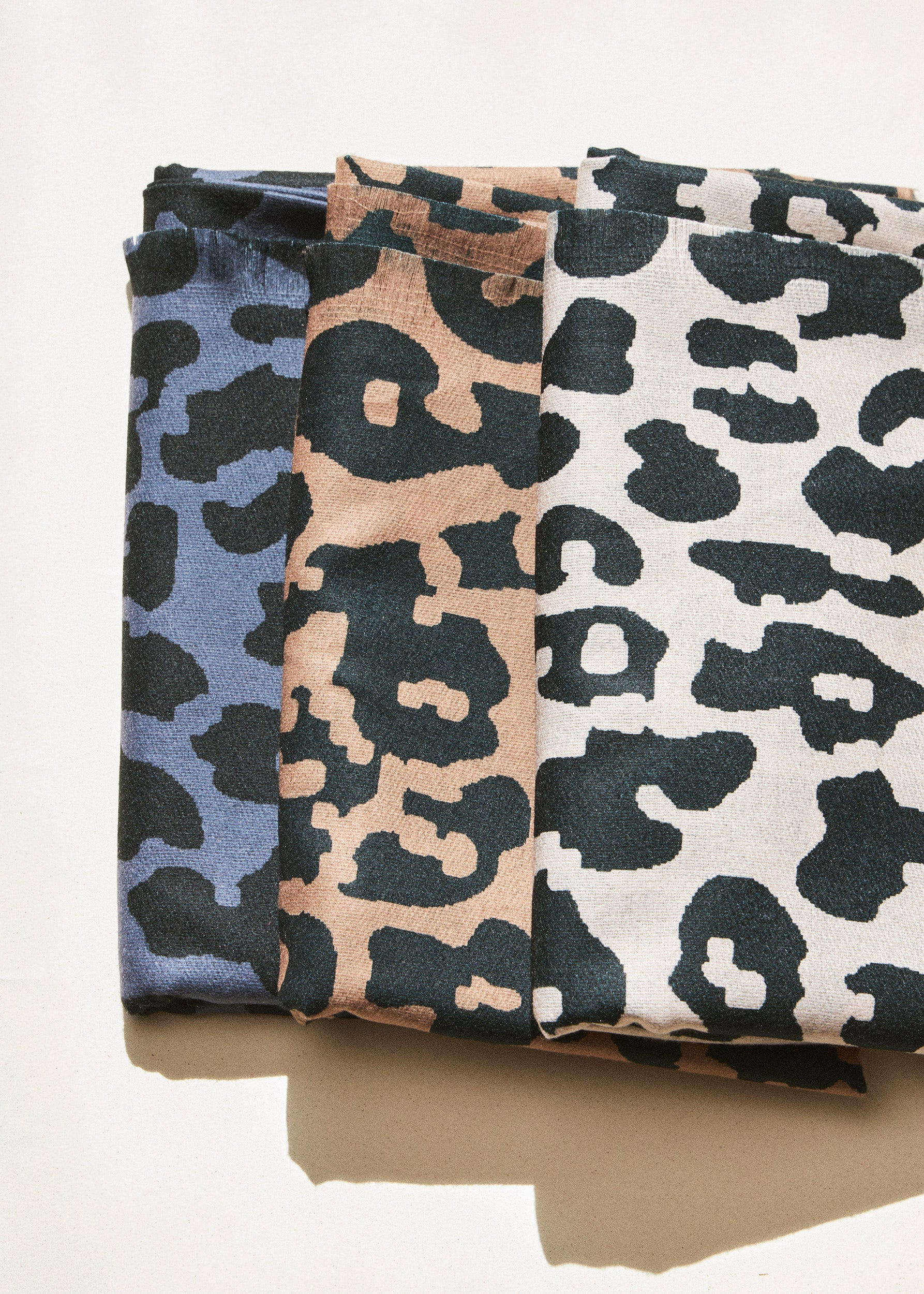 Pañuelo con estampado leopardo bicolor. Formato rectangular. Acabados desflecados.