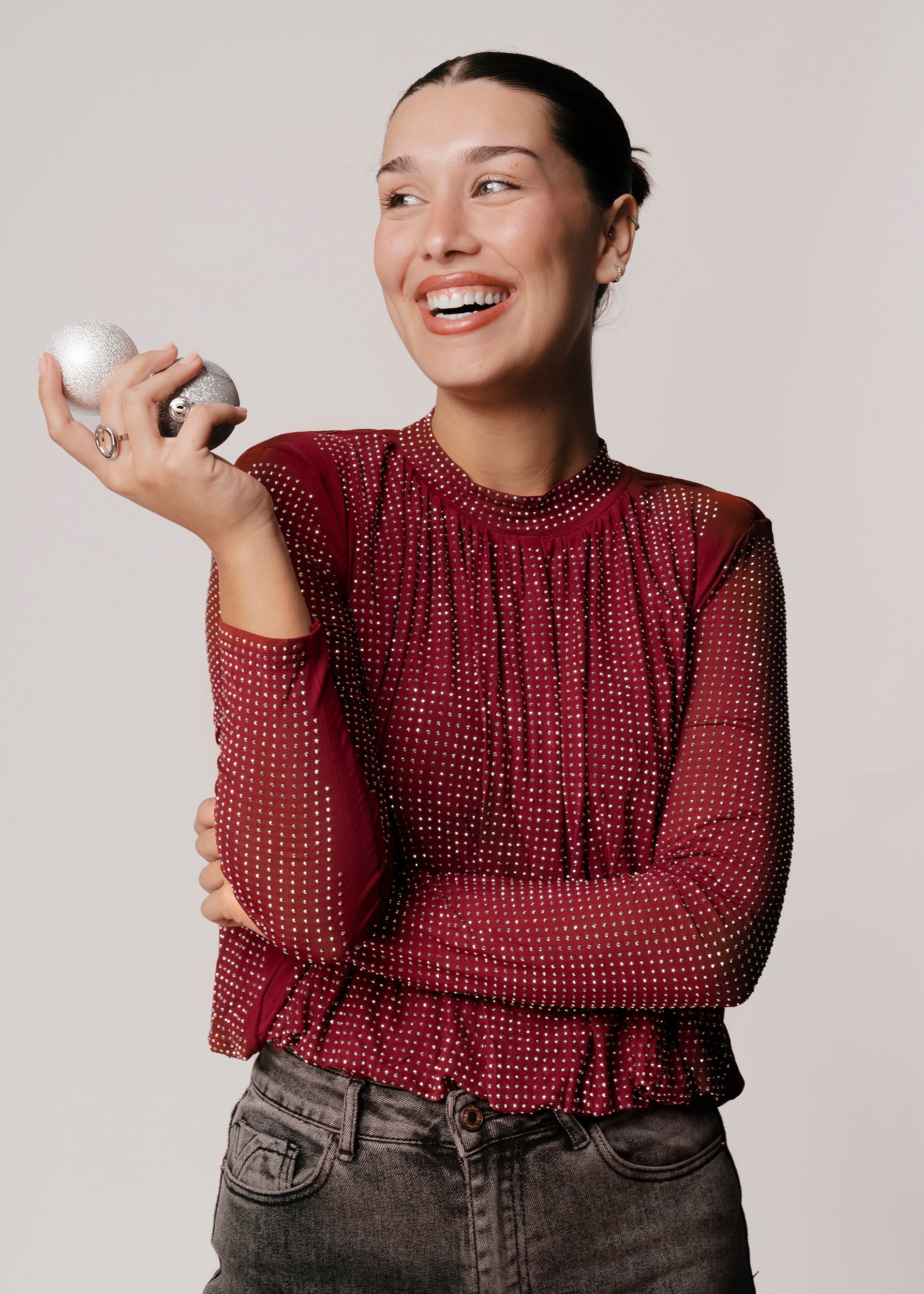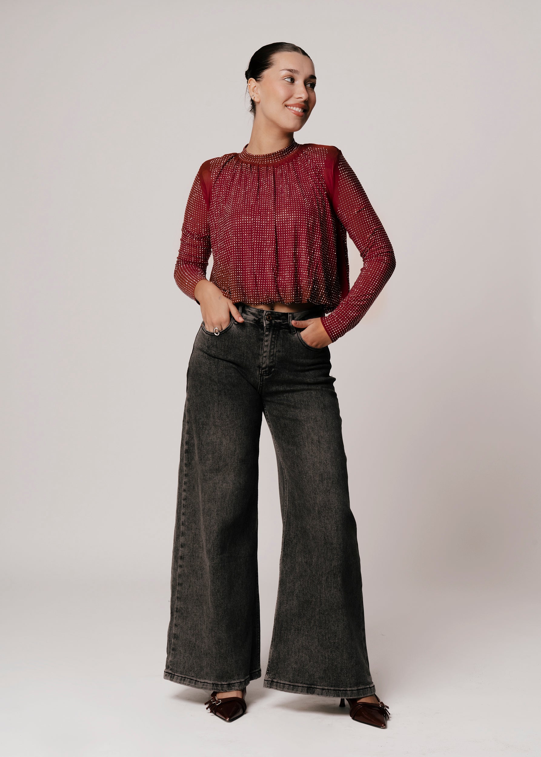 Camiseta de cuello subido y janga larga. Detalle de aplicación de brillos a contraste. Bajo abullonado. Cierre en espalda.