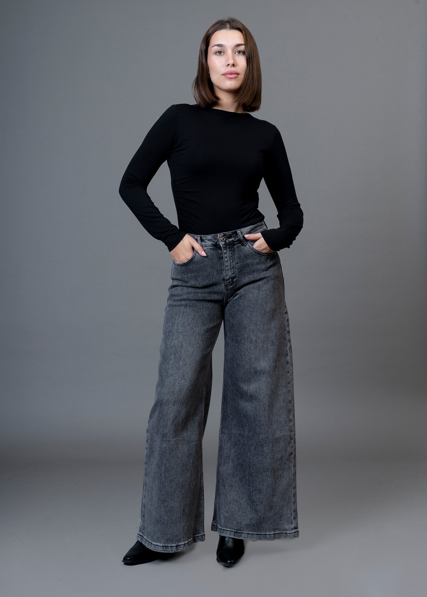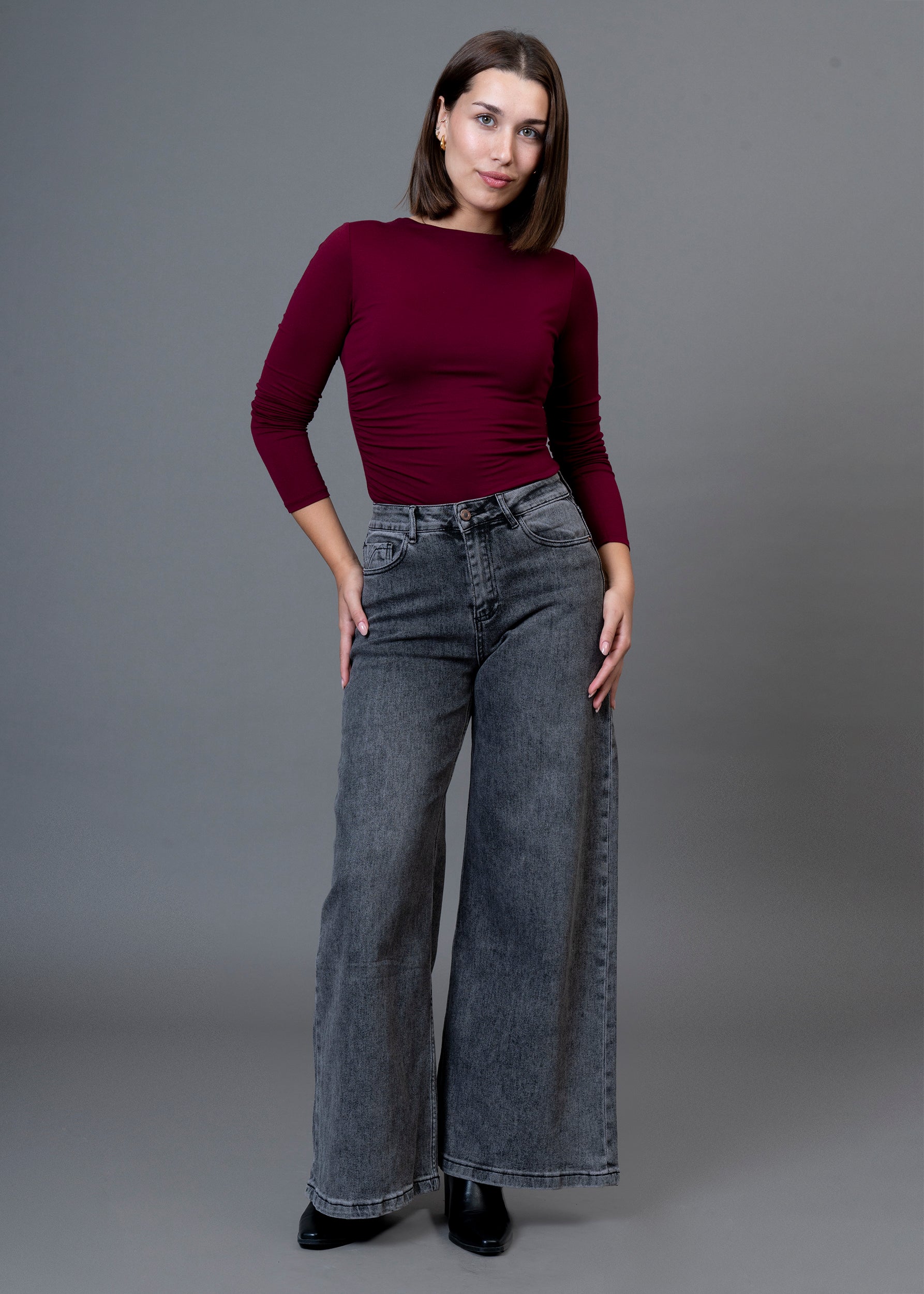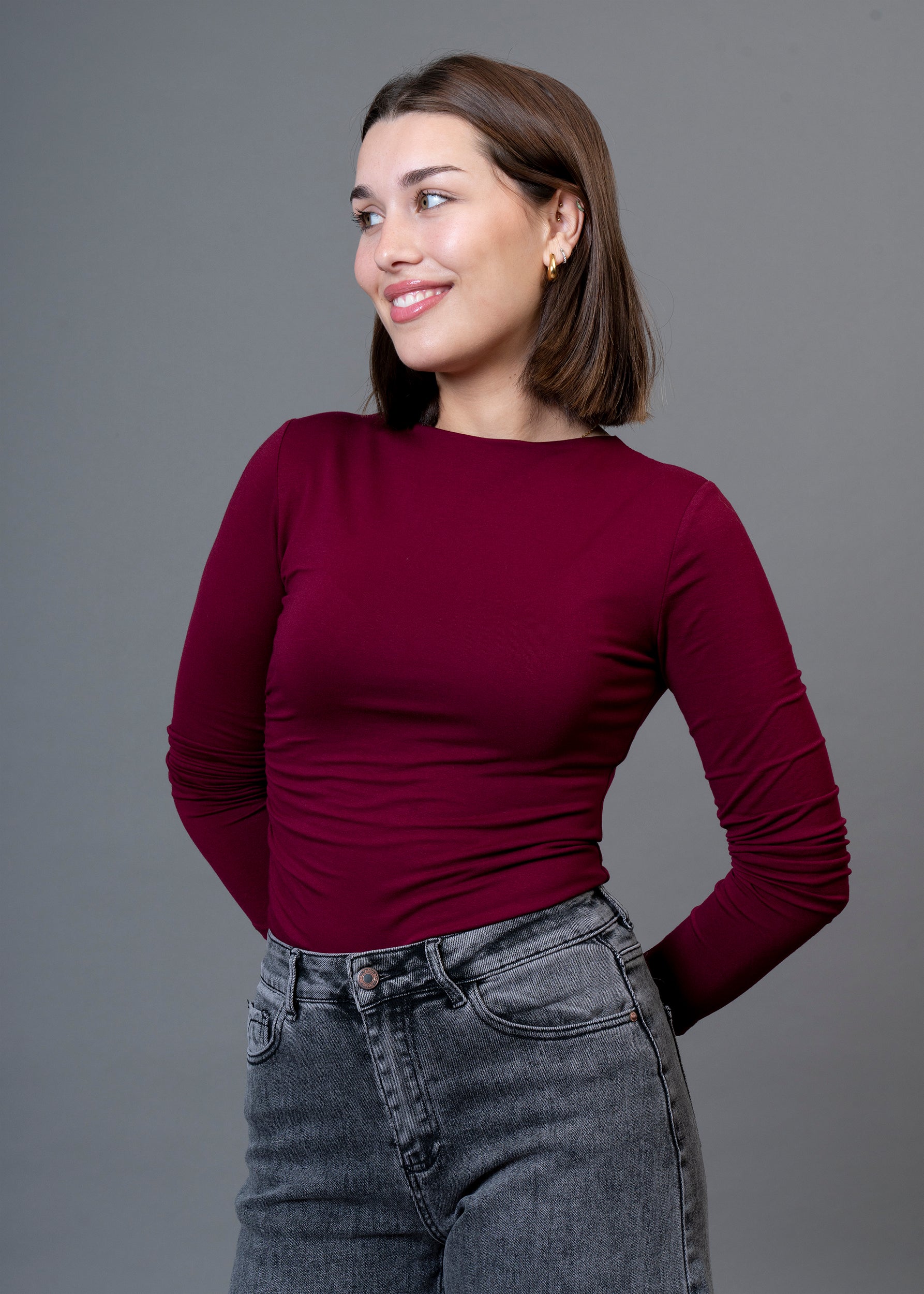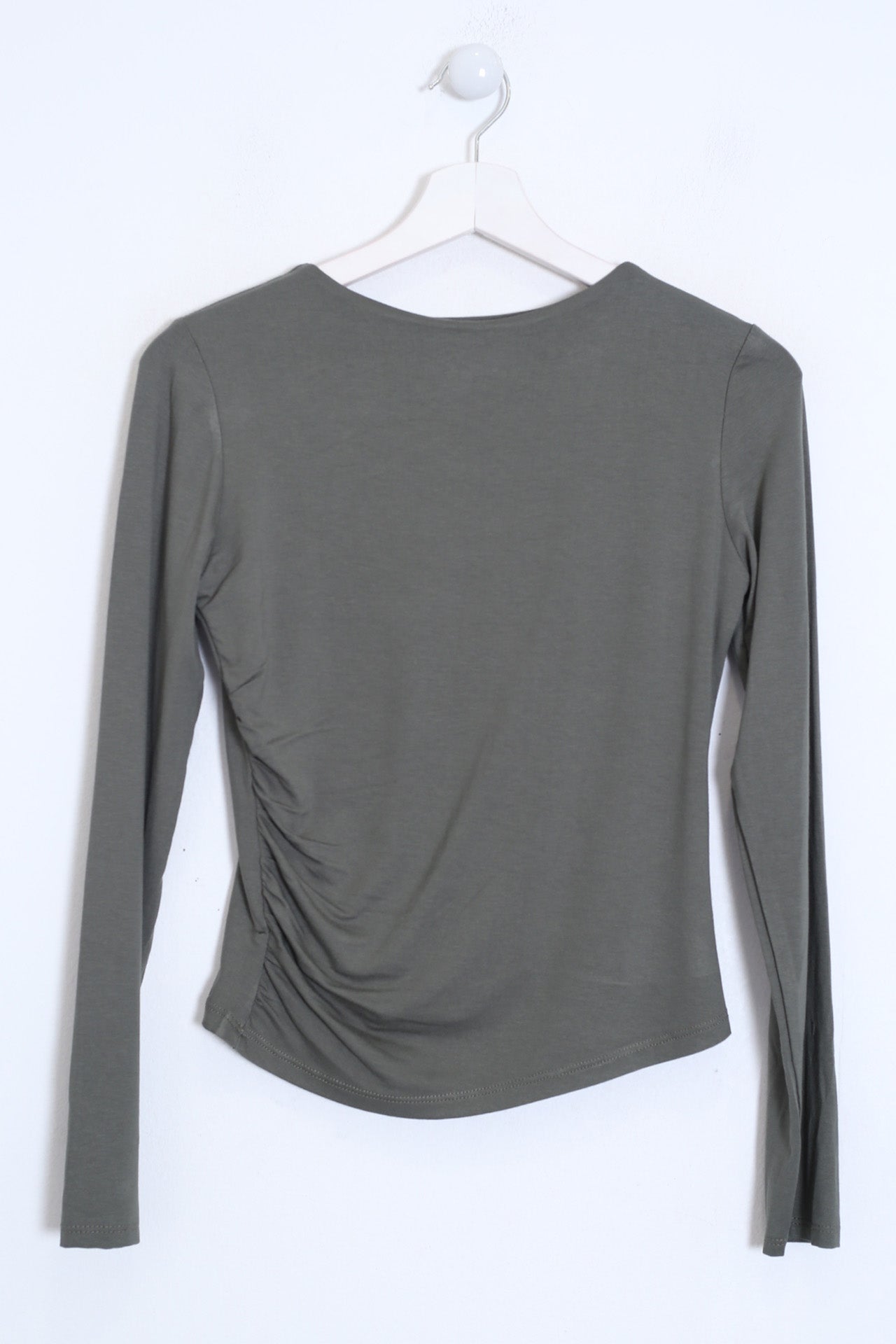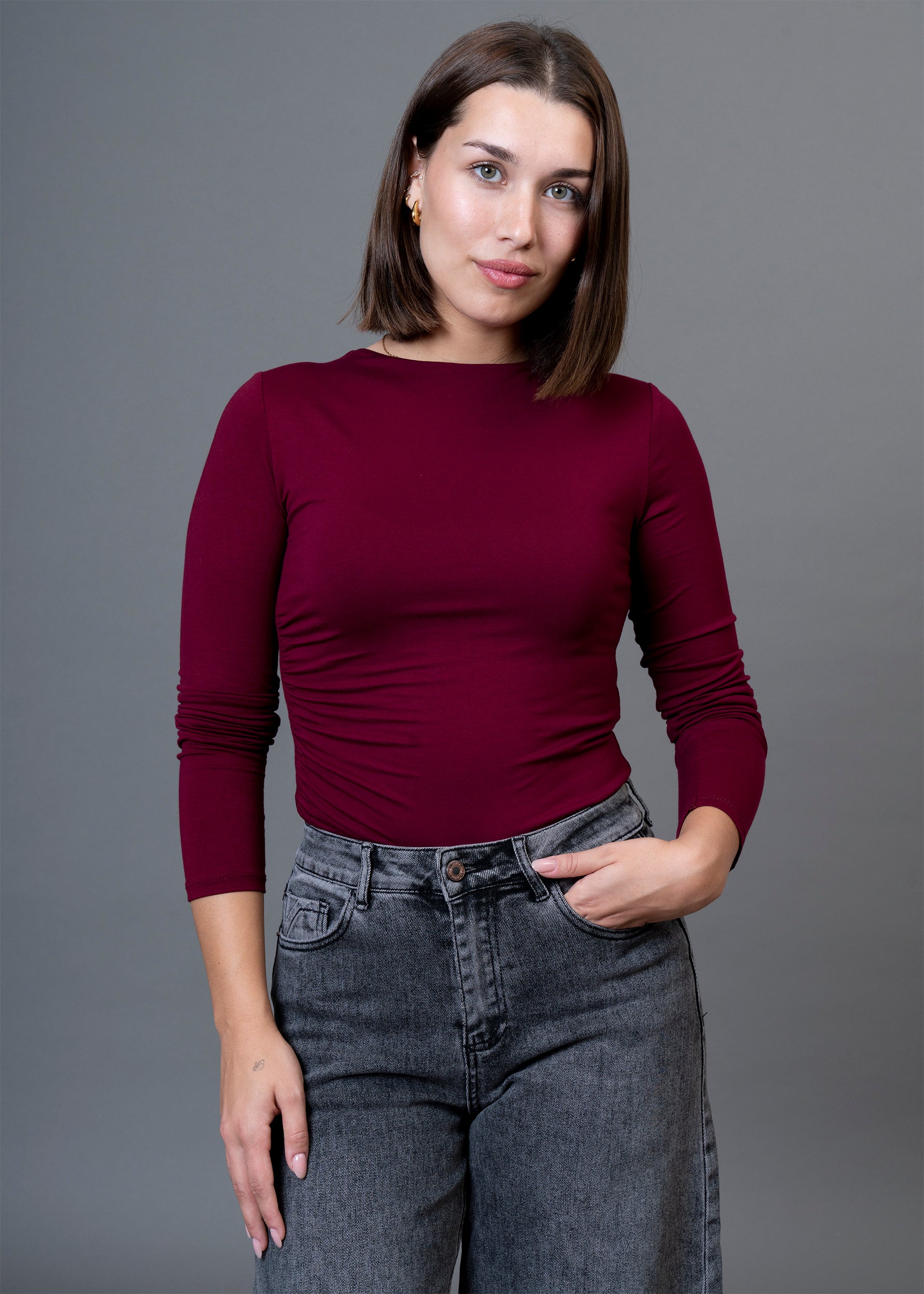Camiseta de cuello redondo y manga larga. Detalle drapeado en lateral. Tejido elástico.