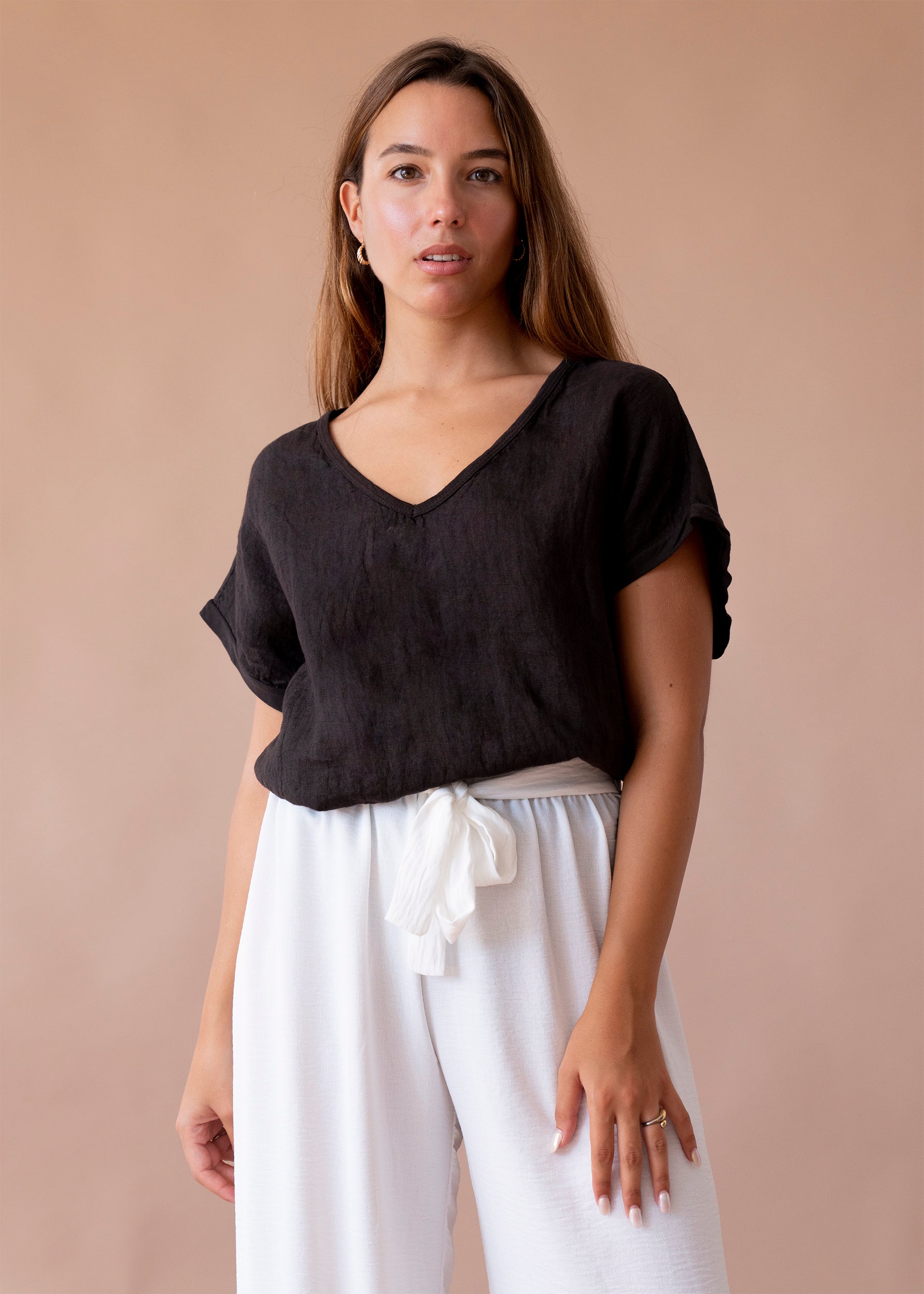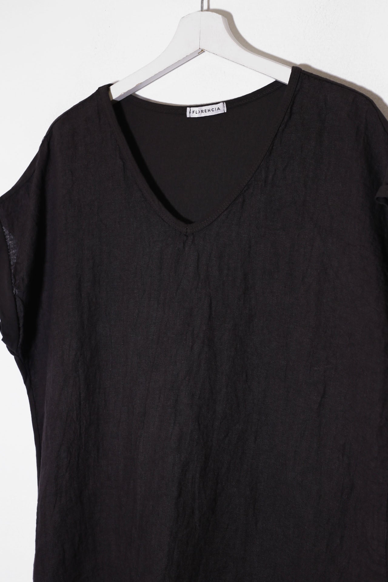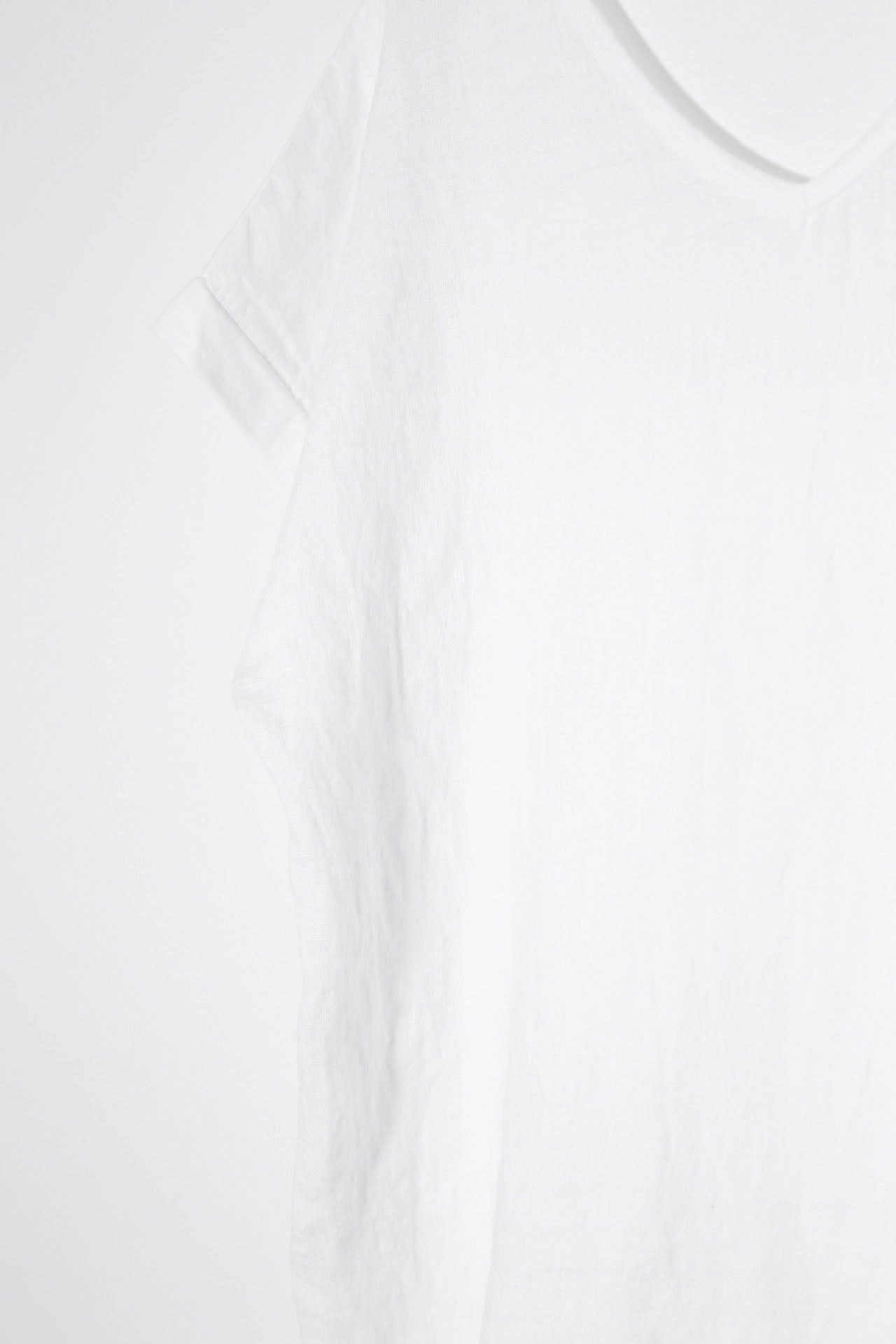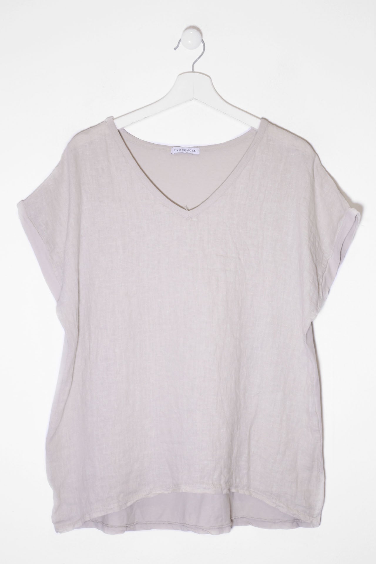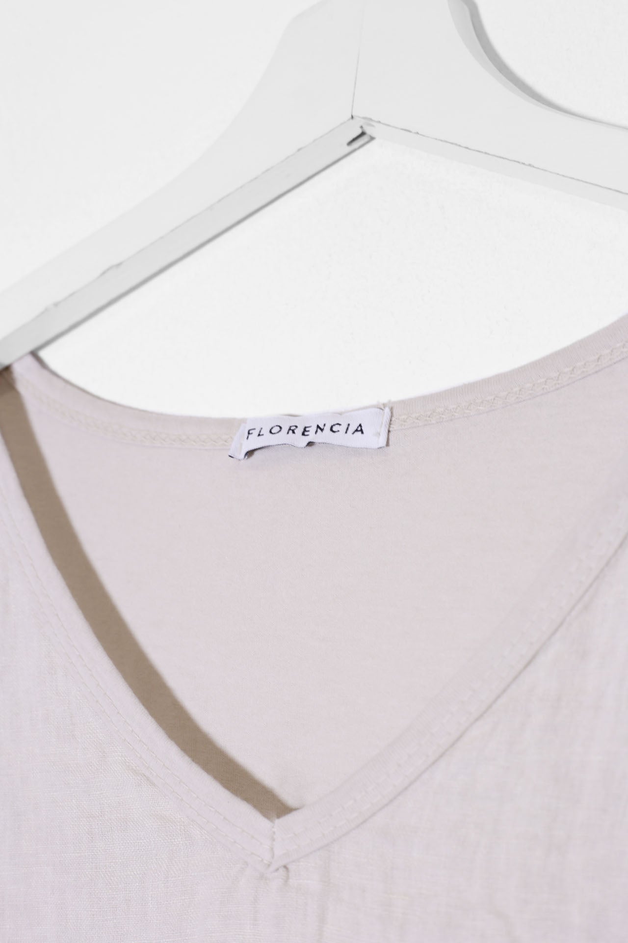 Camiseta de cuello en punta y manga corta. Parte frontal en lino y parte trasera, acabado de las mangas y rib del cuello en algodón. Corte amplio.