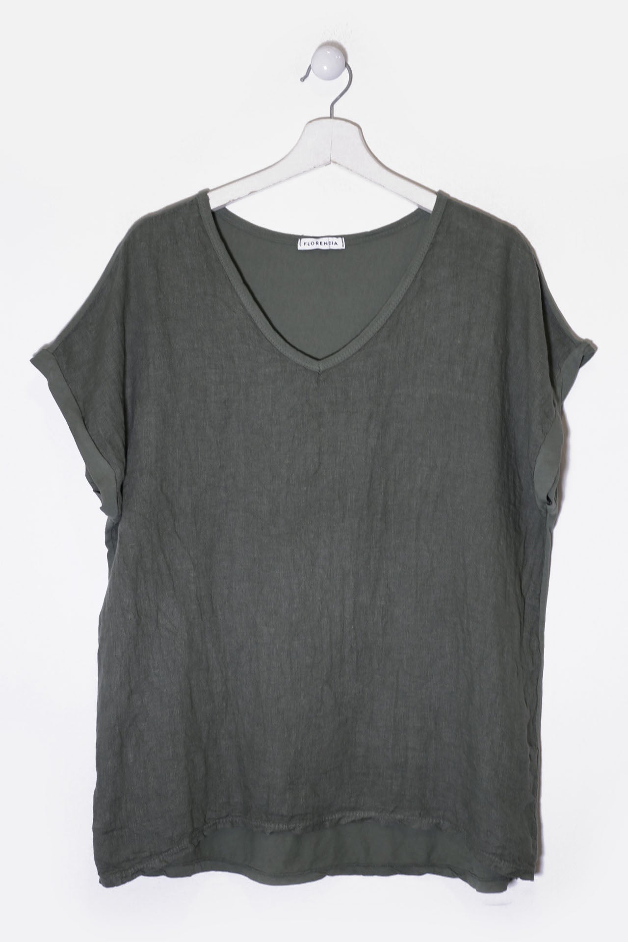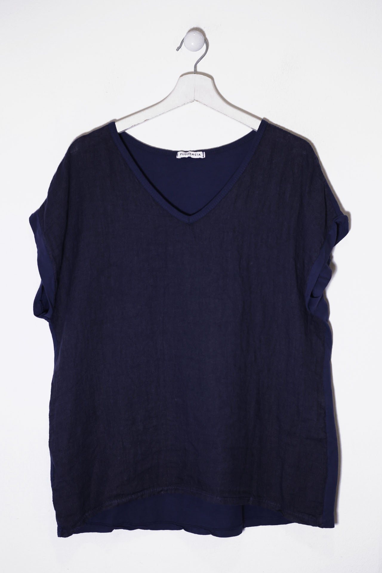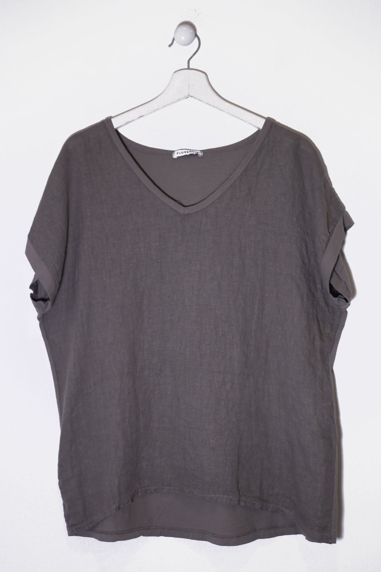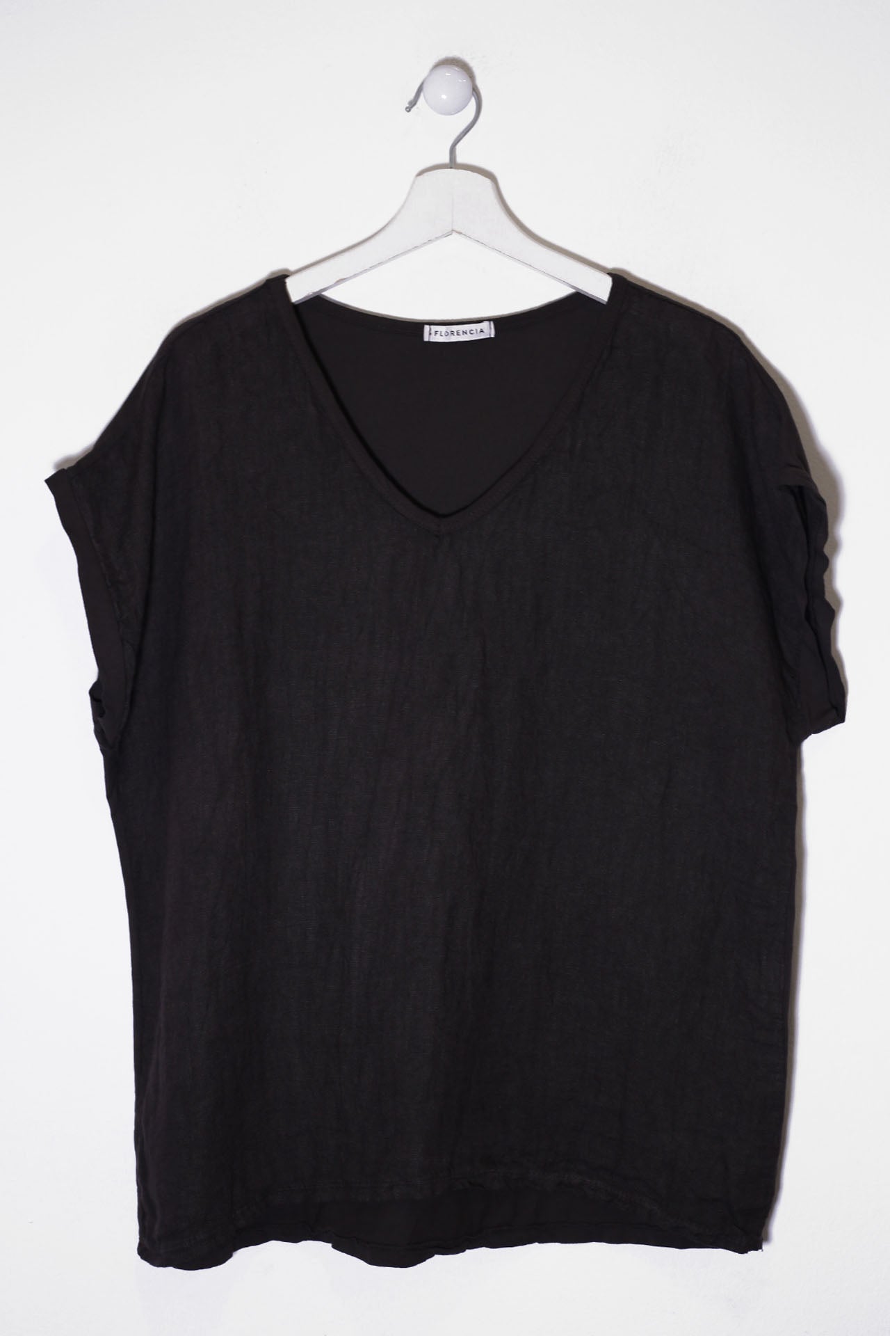 Camiseta de cuello en punta y manga corta. Parte frontal en lino y parte trasera, acabado de las mangas y rib del cuello en algodón. Corte amplio.