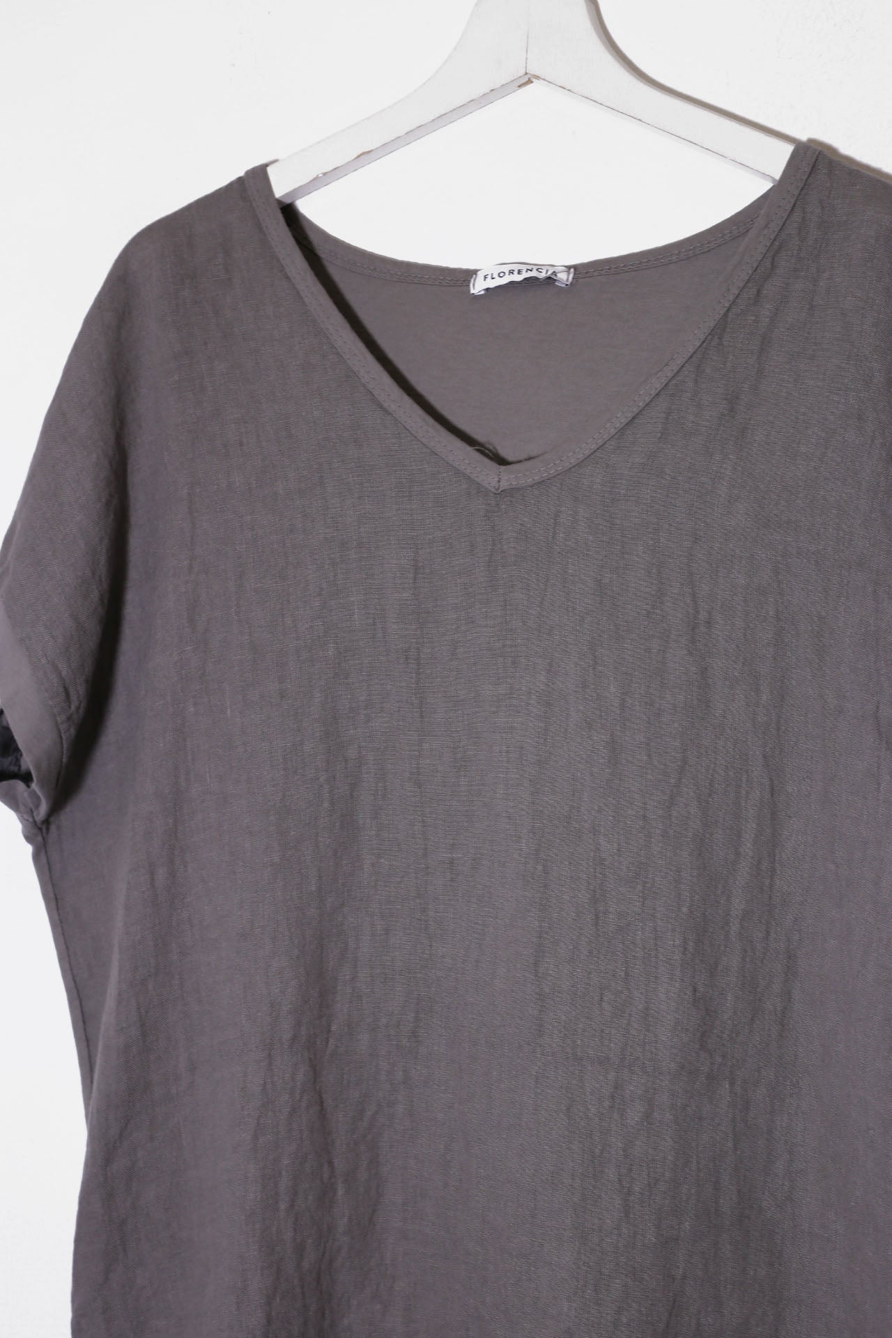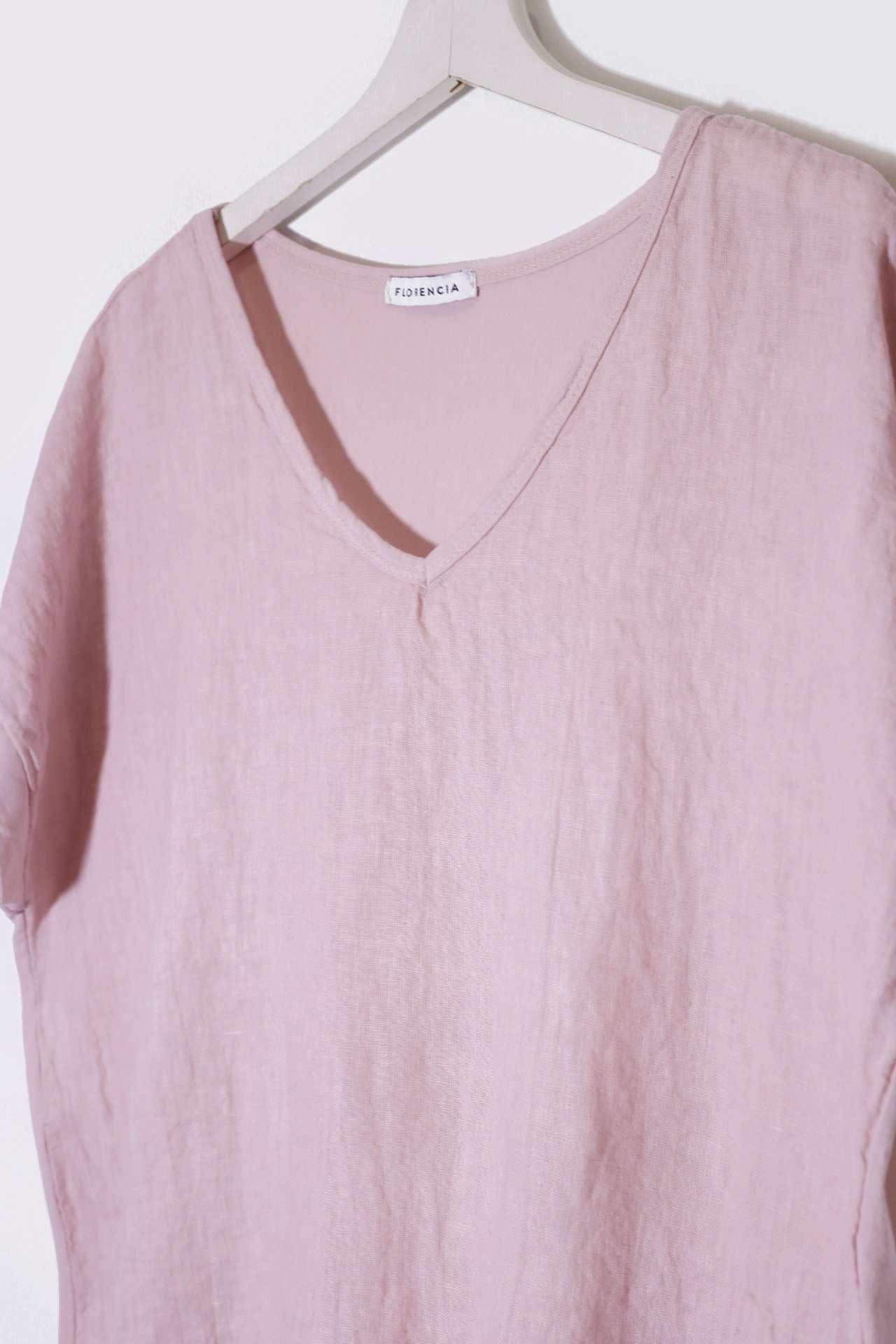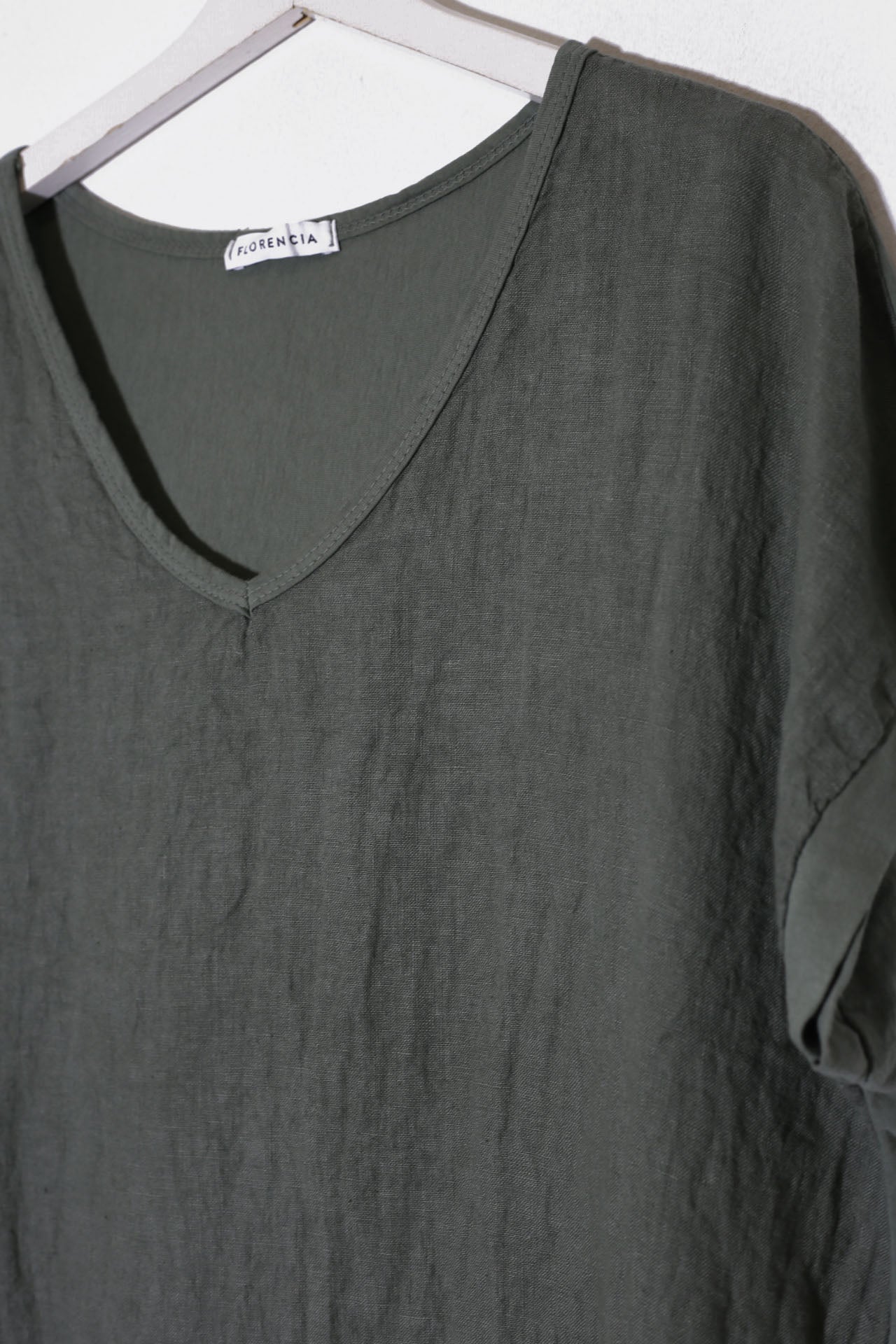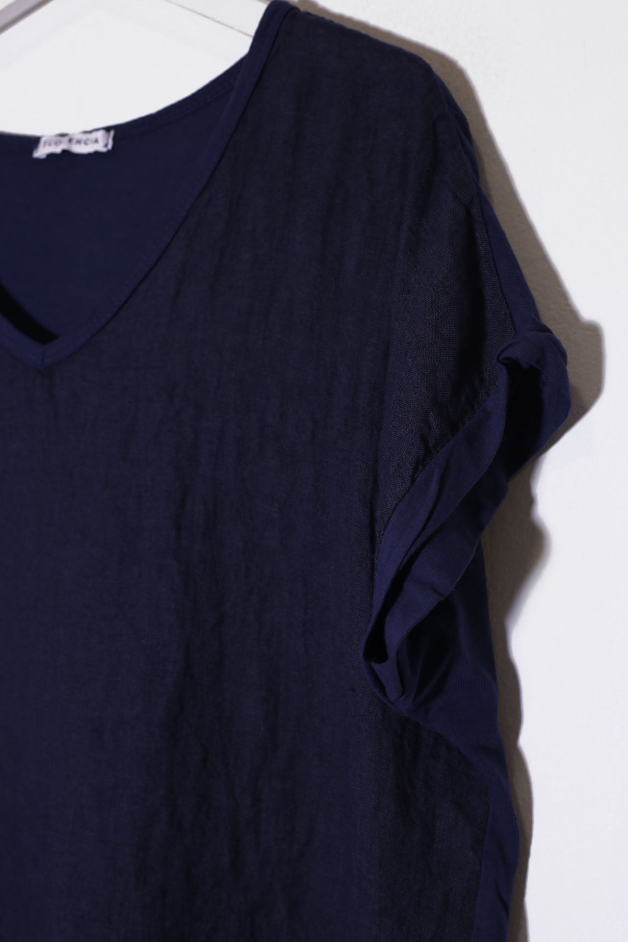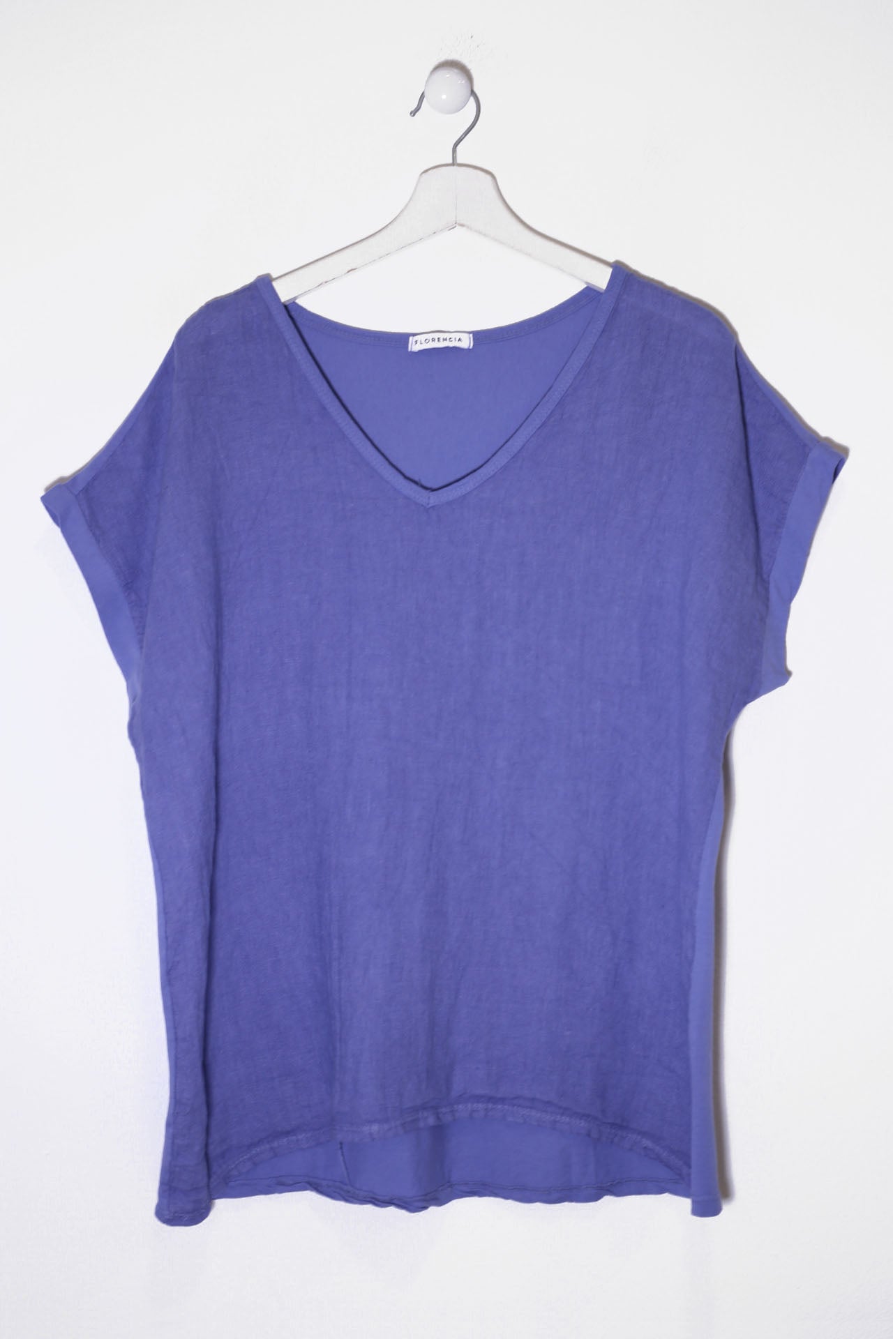 Camiseta de cuello en punta y manga corta. Parte frontal en lino y parte trasera, acabado de las mangas y rib del cuello en algodón. Corte amplio.