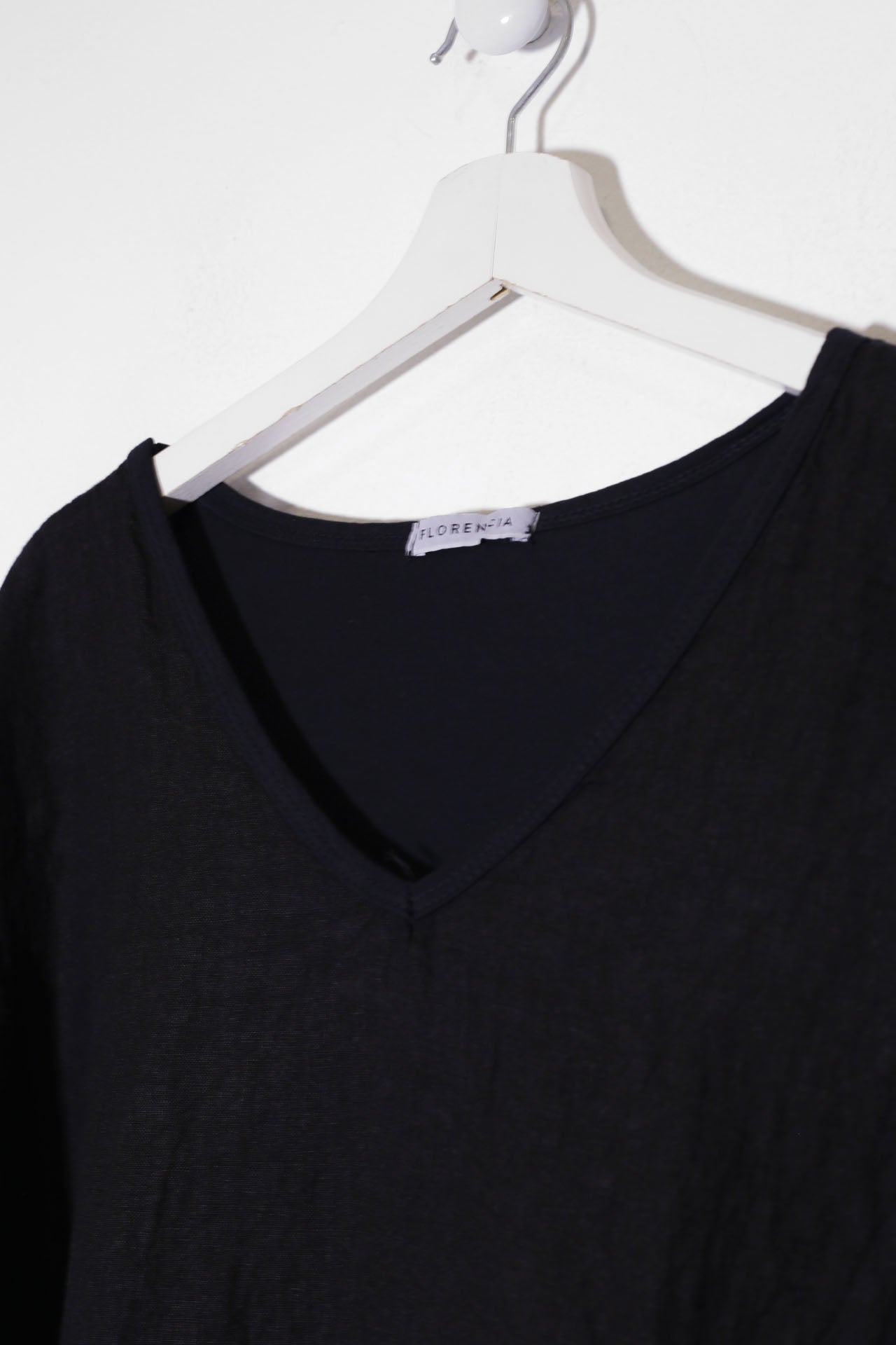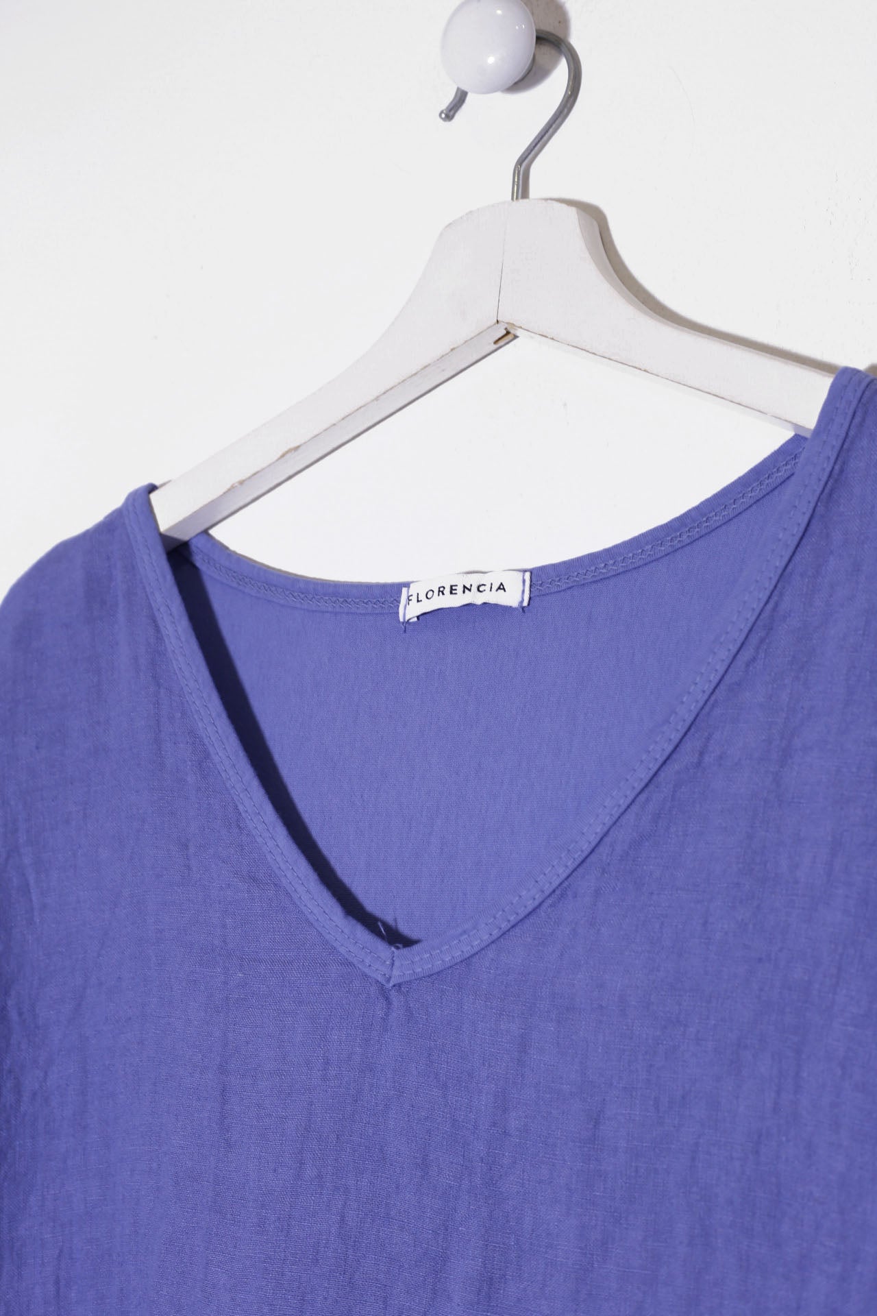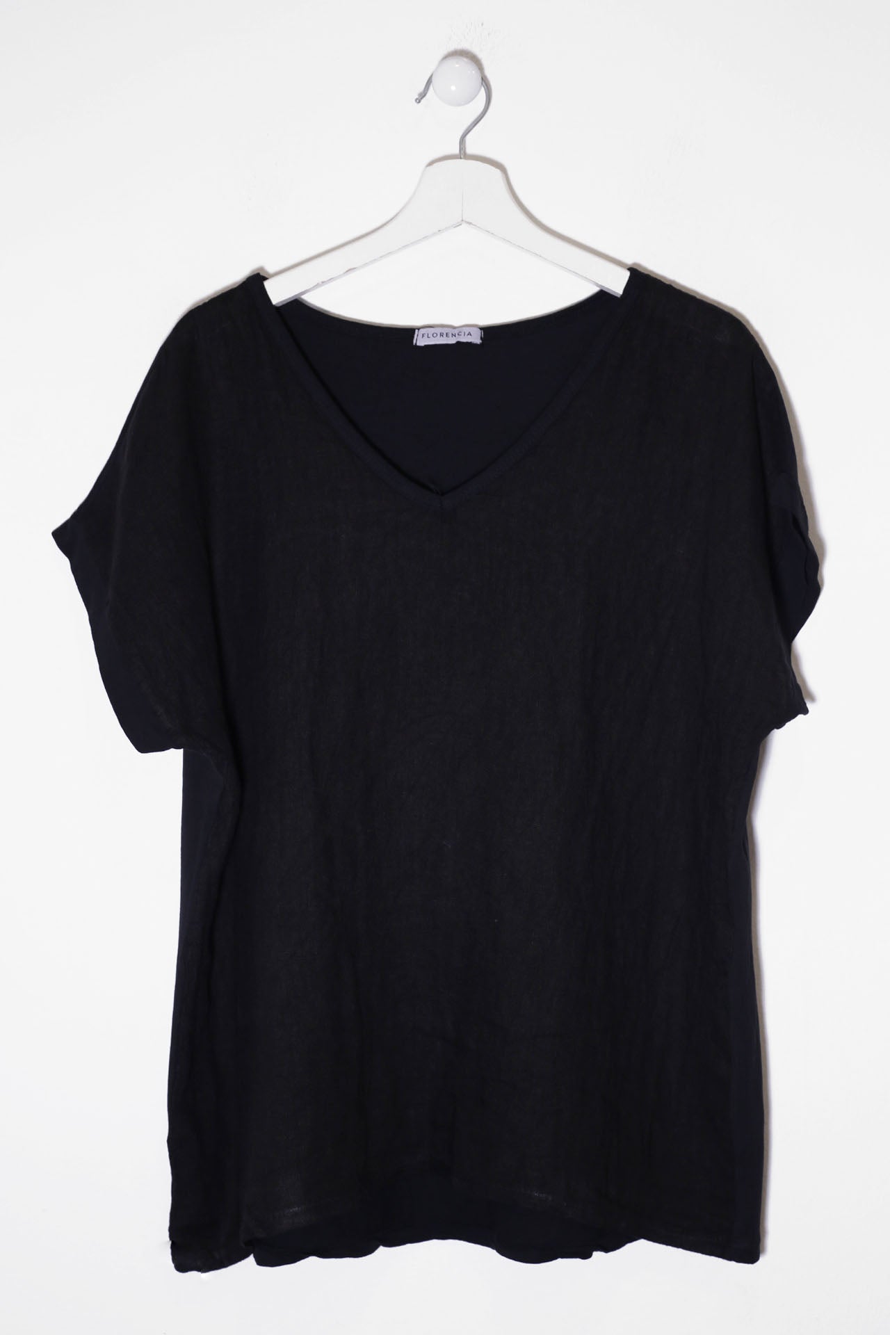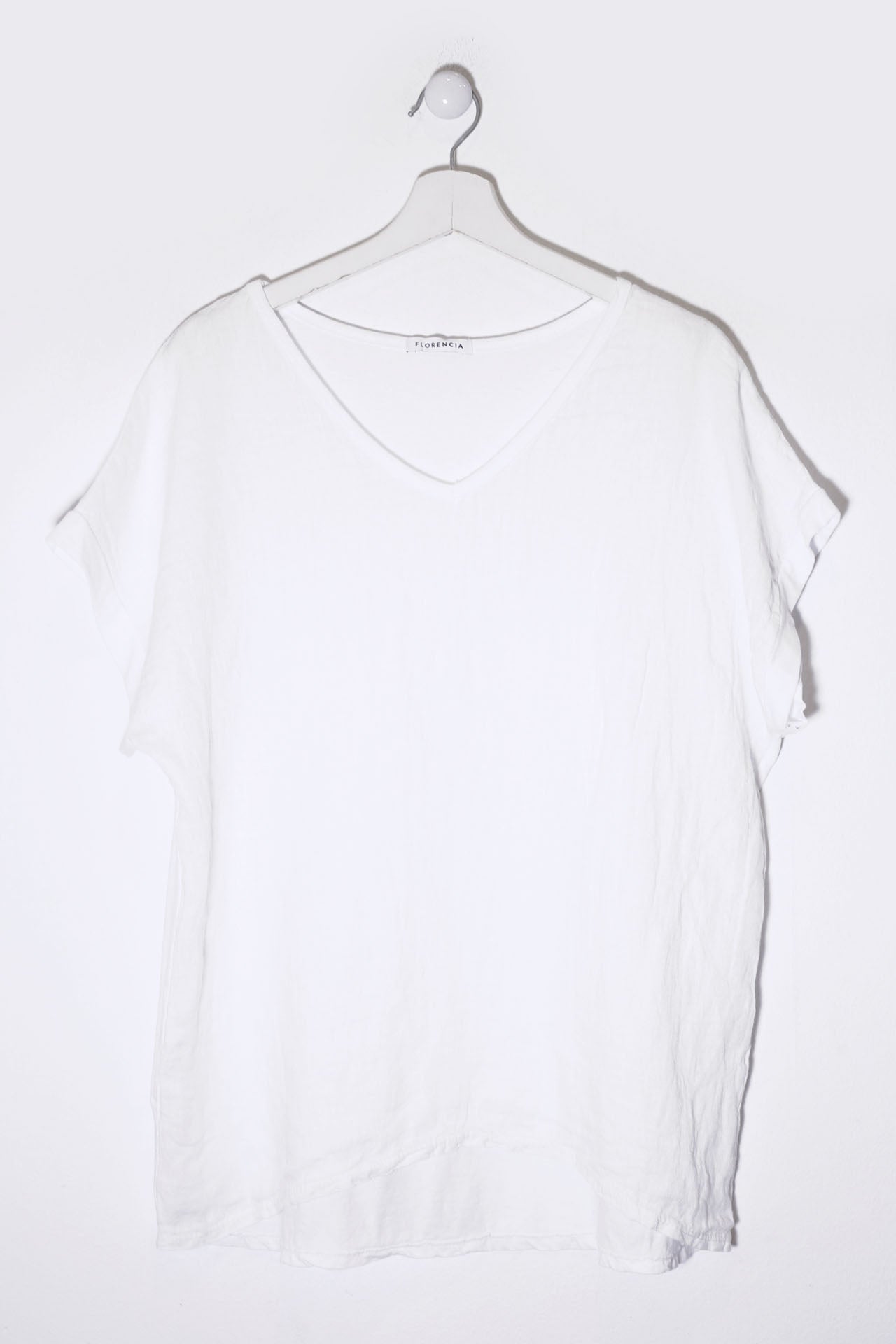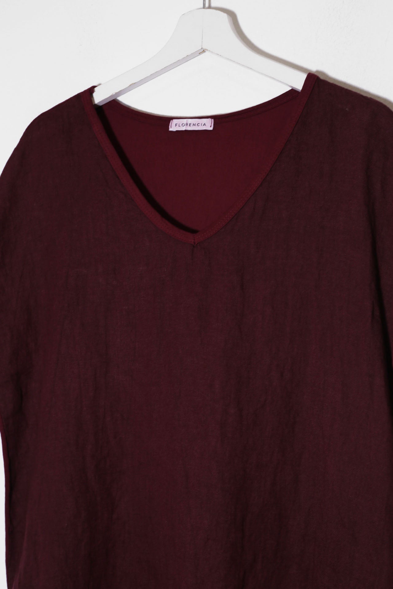 Camiseta de cuello en punta y manga corta. Parte frontal en lino y parte trasera, acabado de las mangas y rib del cuello en algodón. Corte amplio.