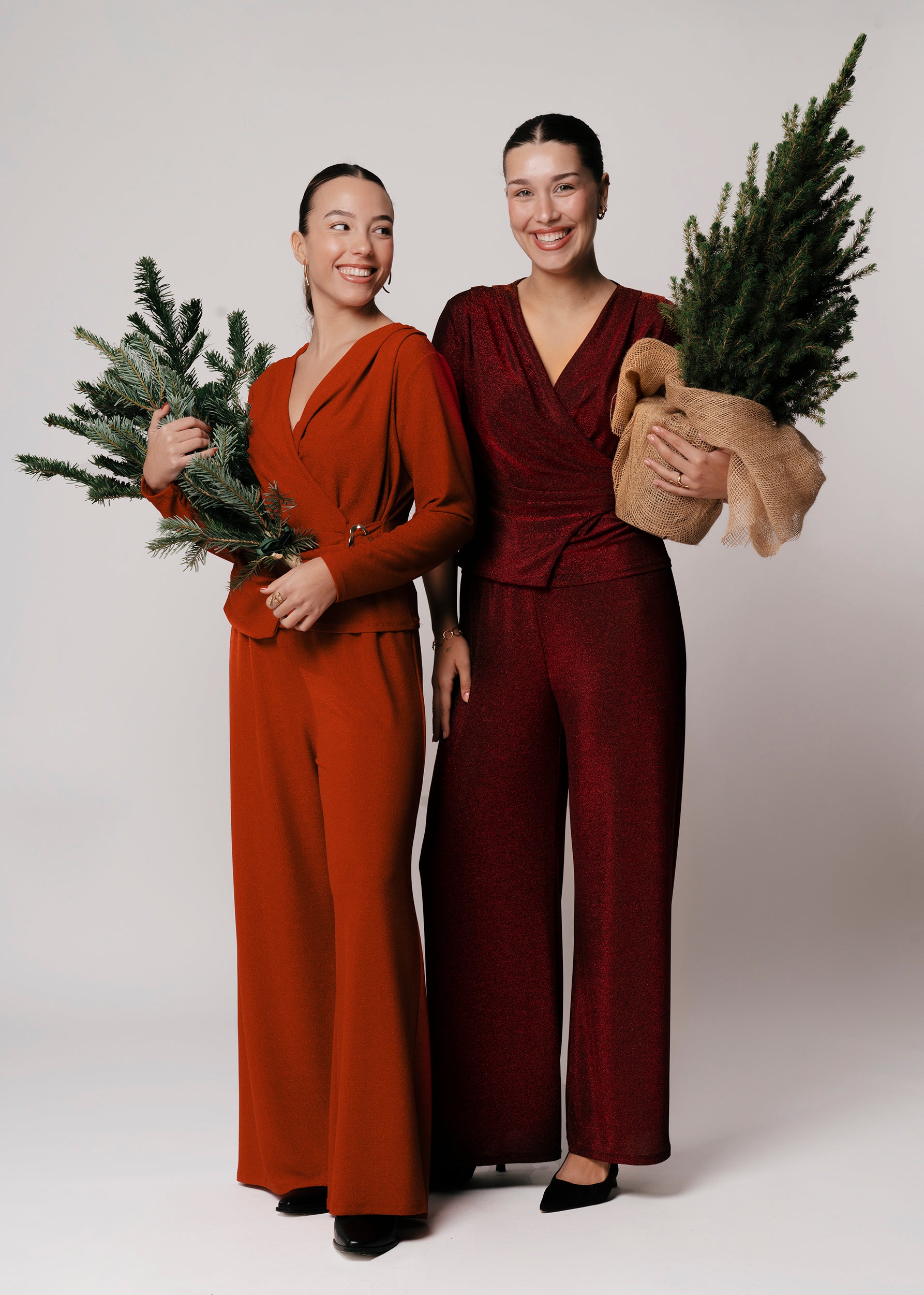Camiseta con manga larga y escote en punta cruzado con detalle de hebilla dorada. Tejido de lurex elástico y con brillos.