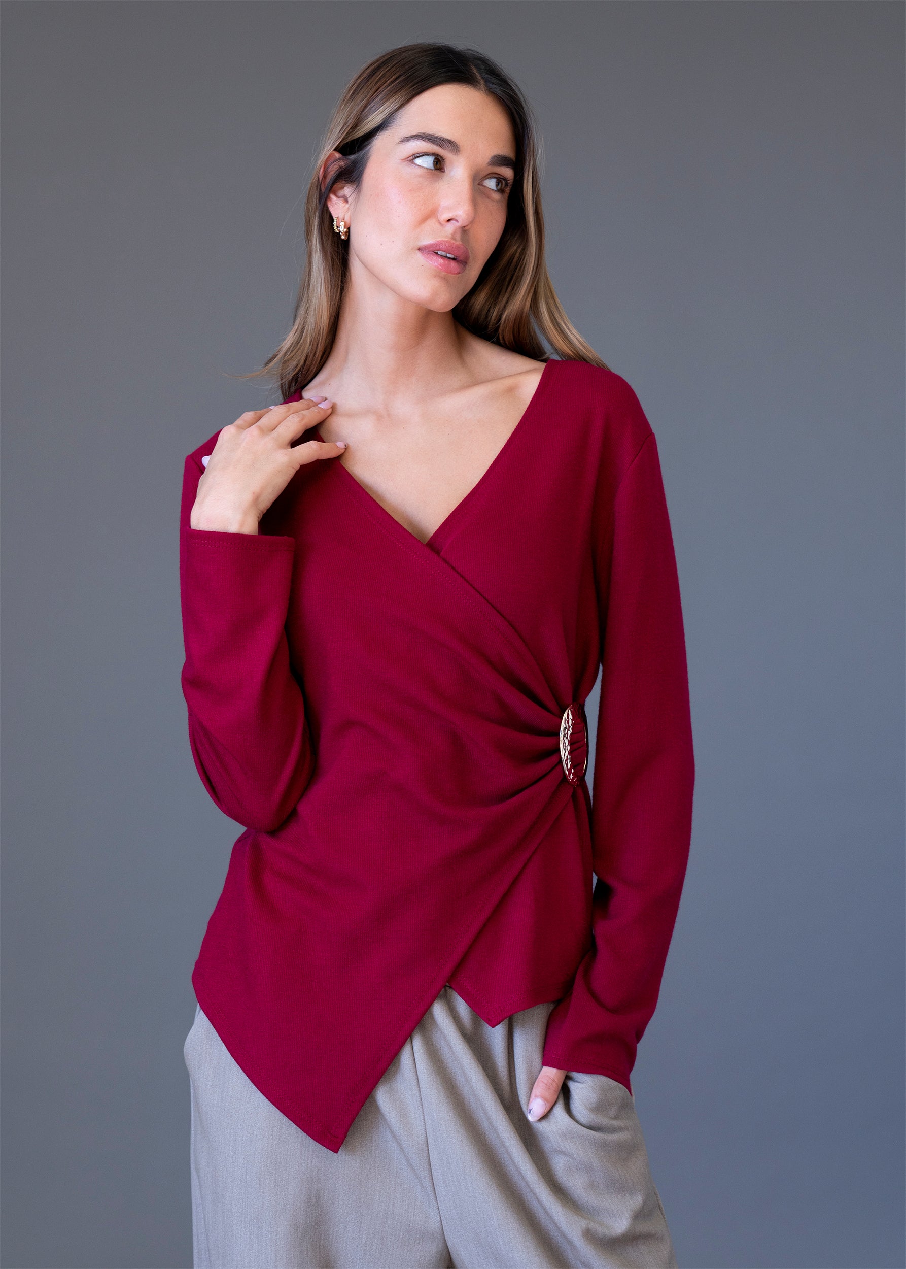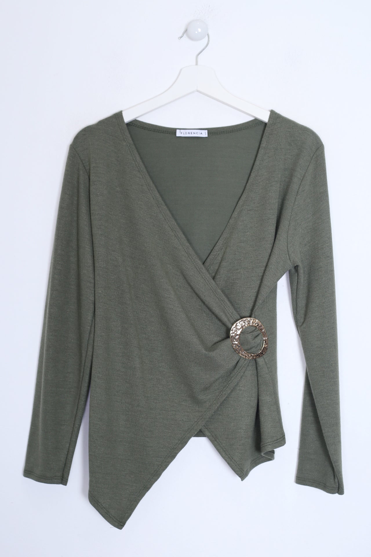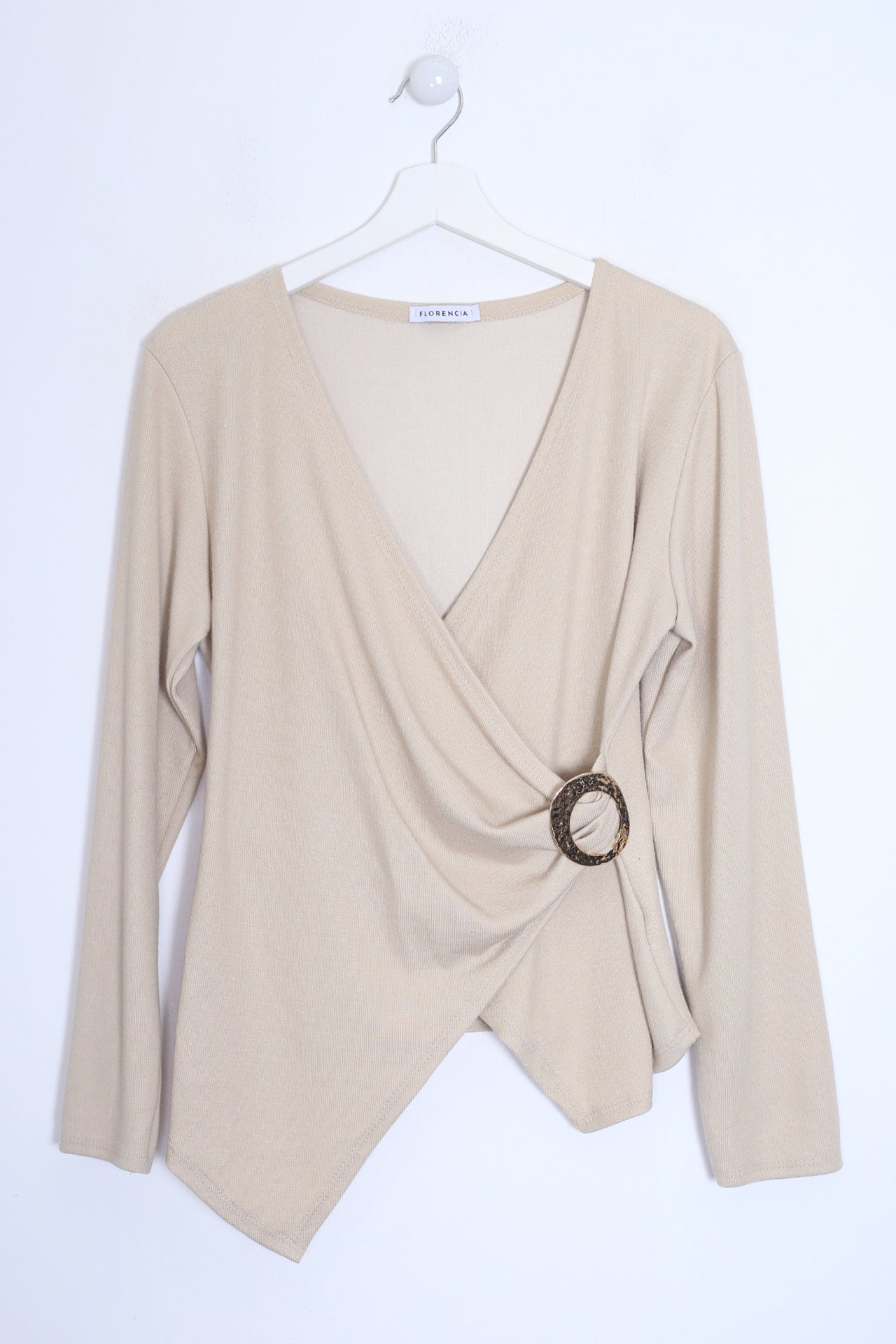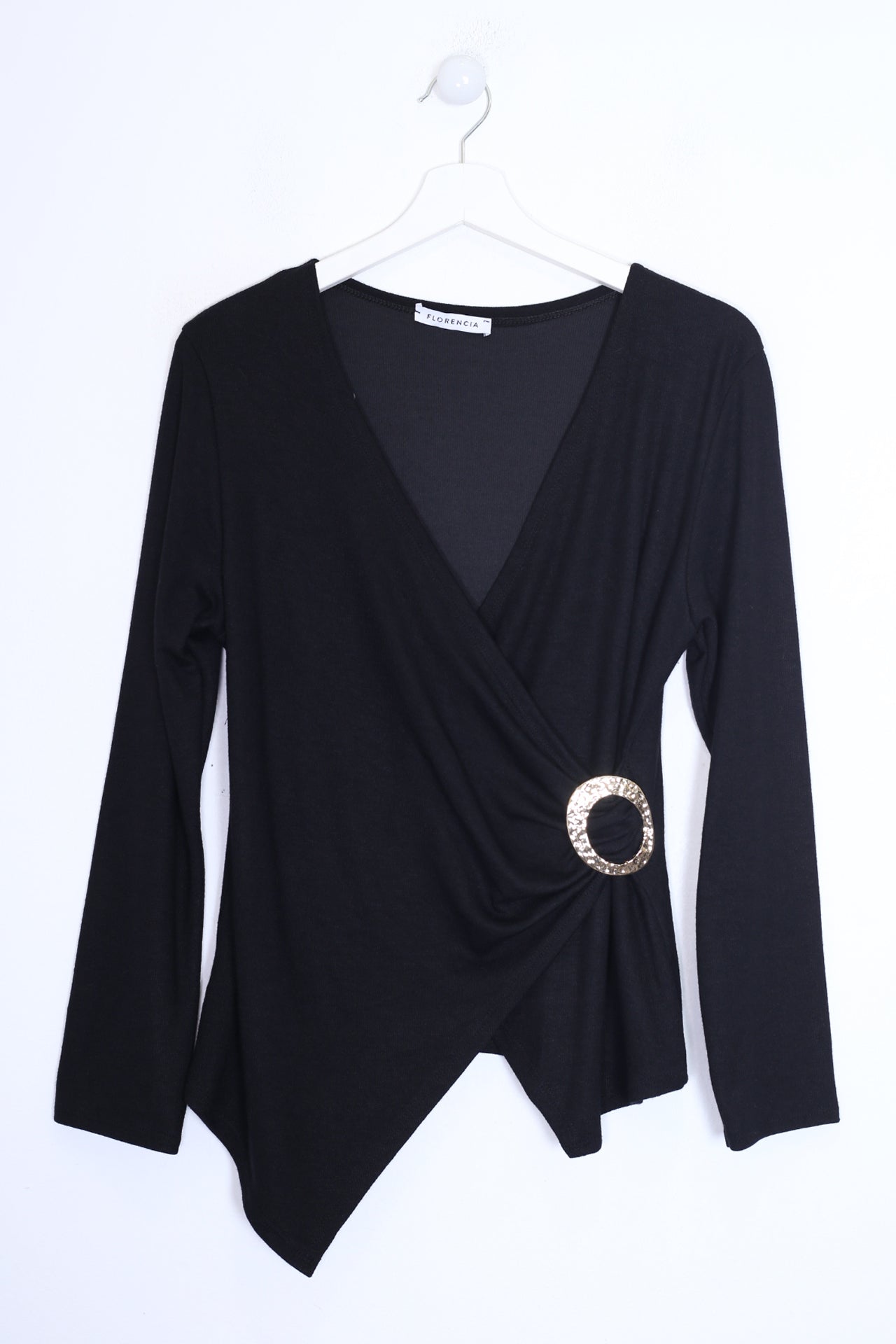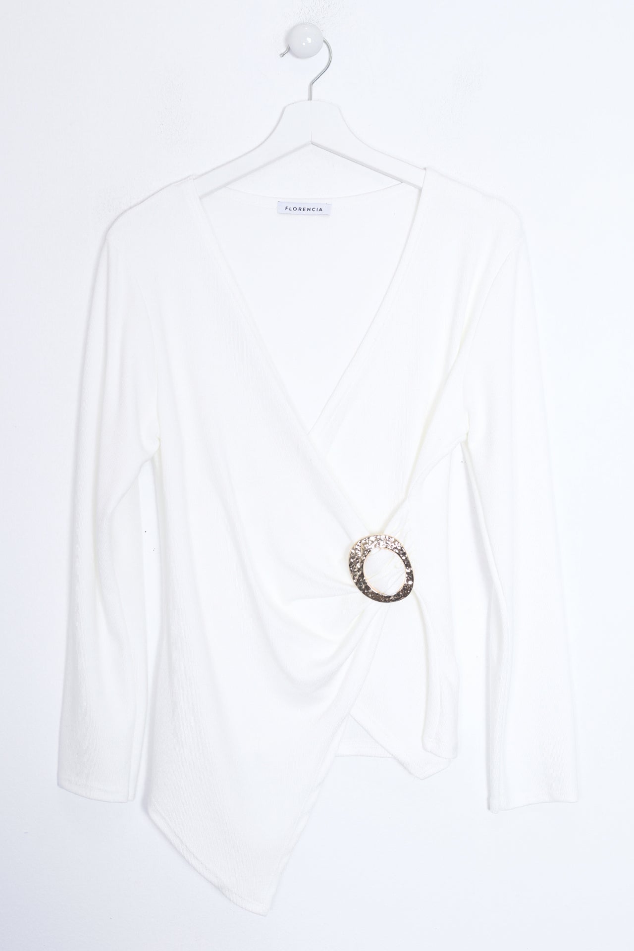 Camiseta con escote en punta cruzado y detalle de hebilla ovalada texturada. Manga larga. Bajo asimétrico acabado en punta en delantero.