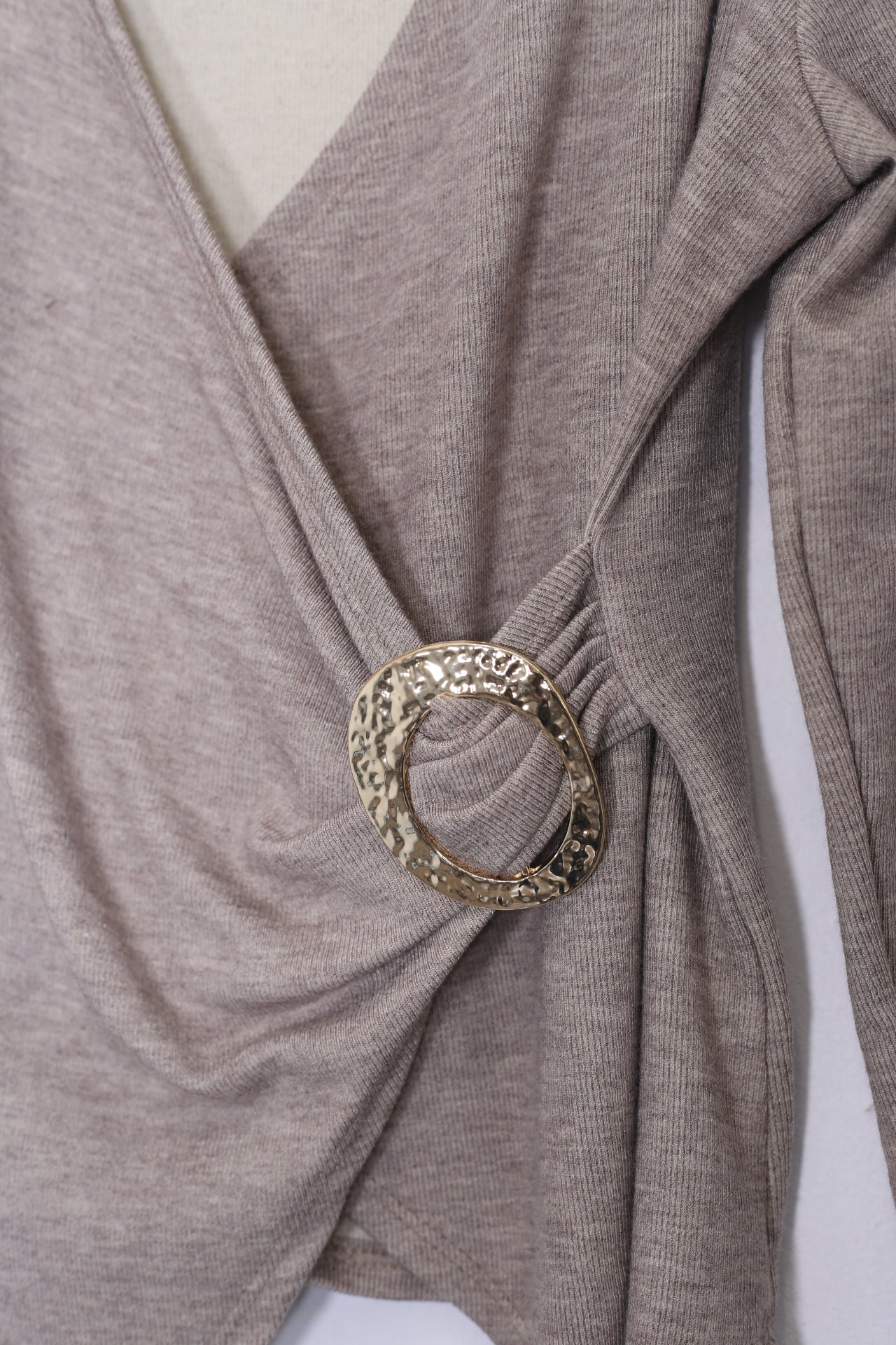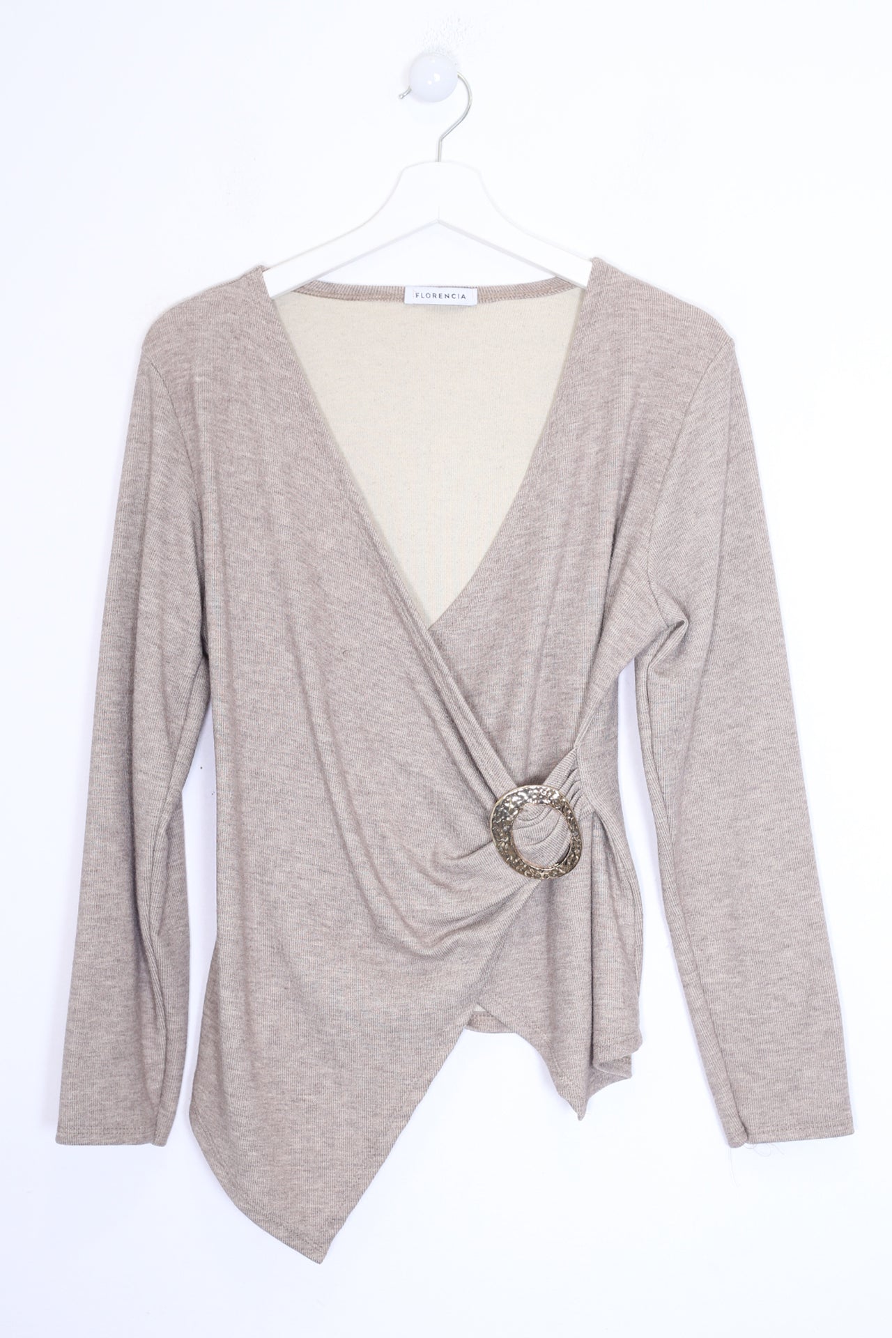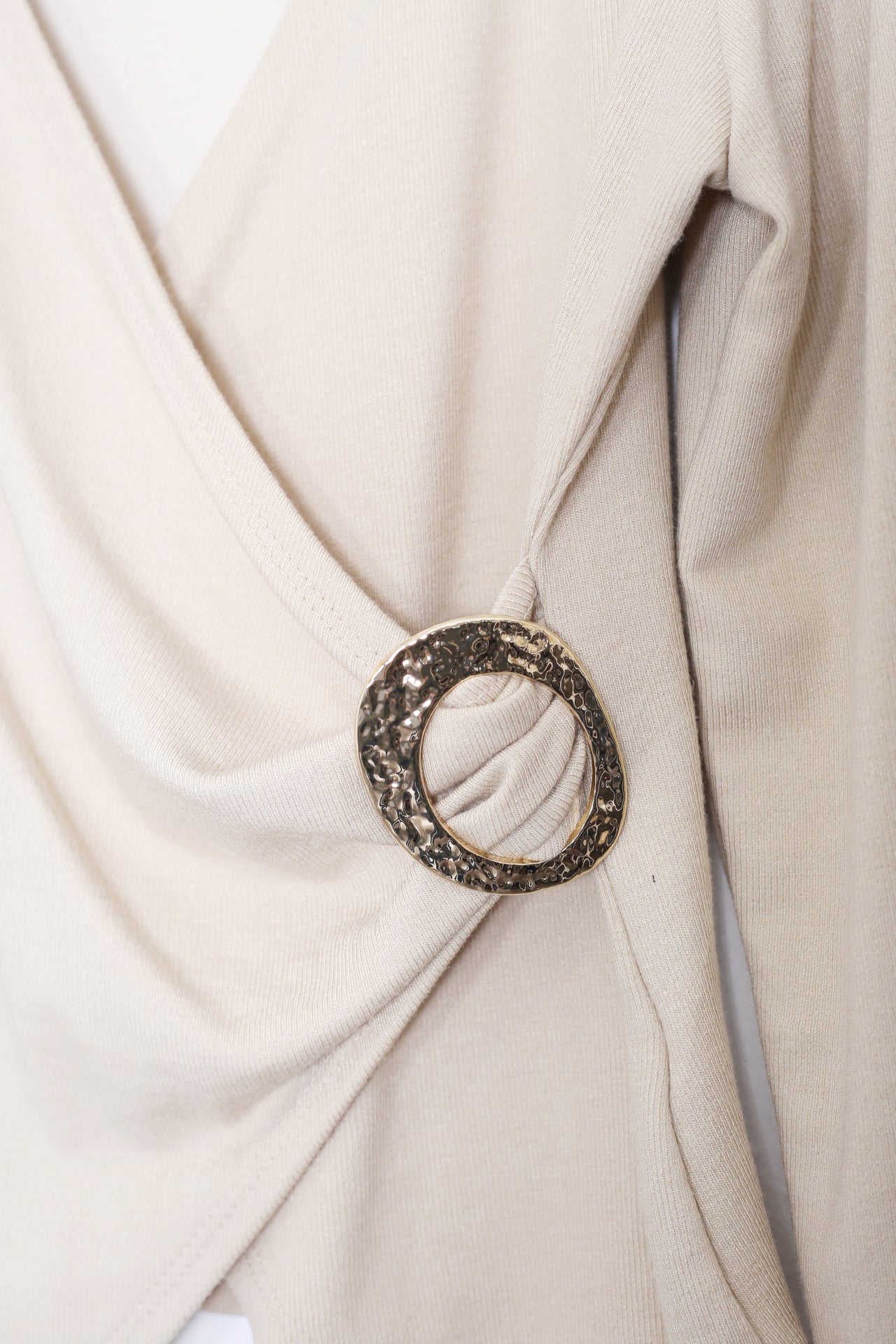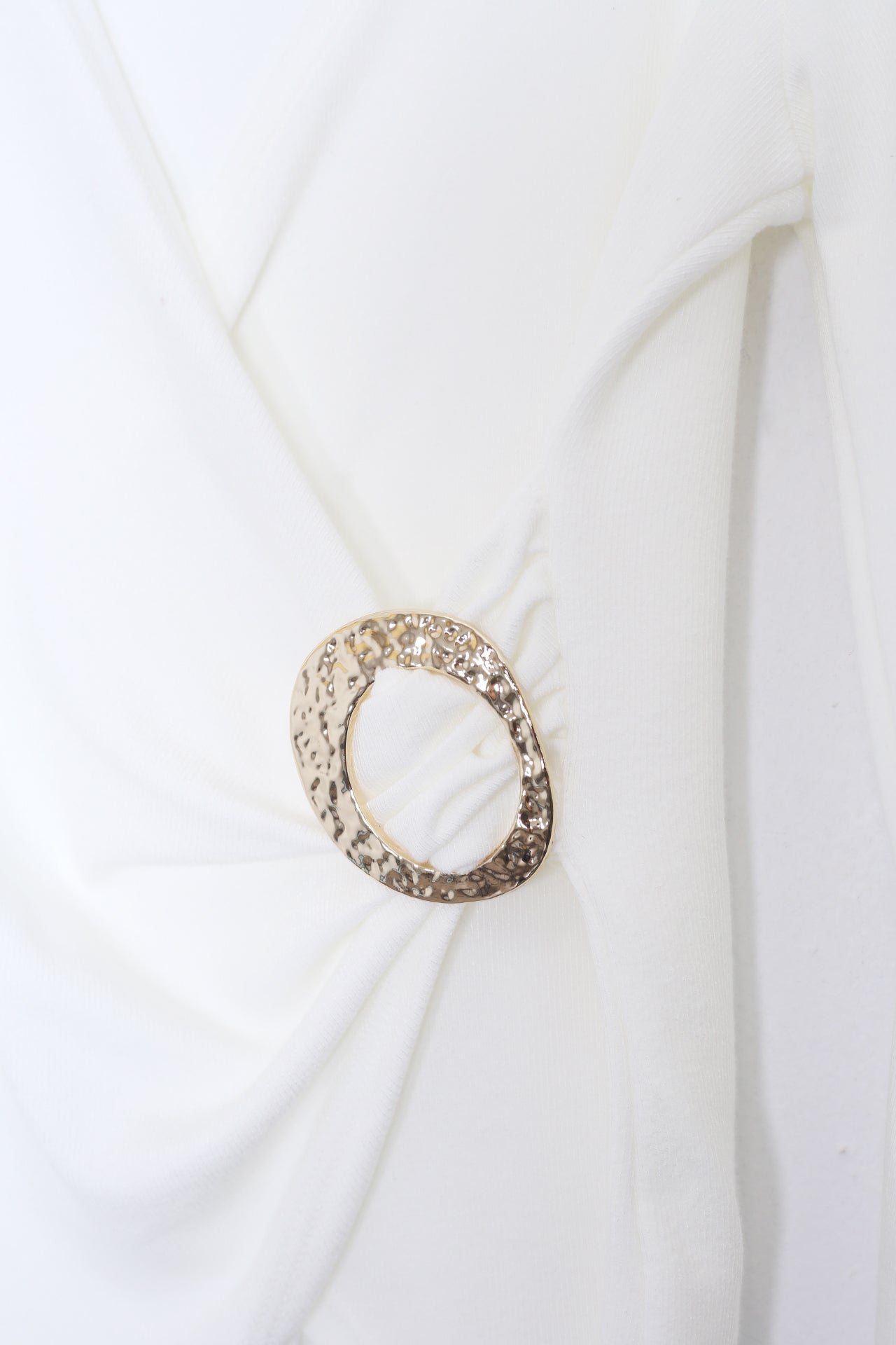 Camiseta con escote en punta cruzado y detalle de hebilla ovalada texturada. Manga larga. Bajo asimétrico acabado en punta en delantero.