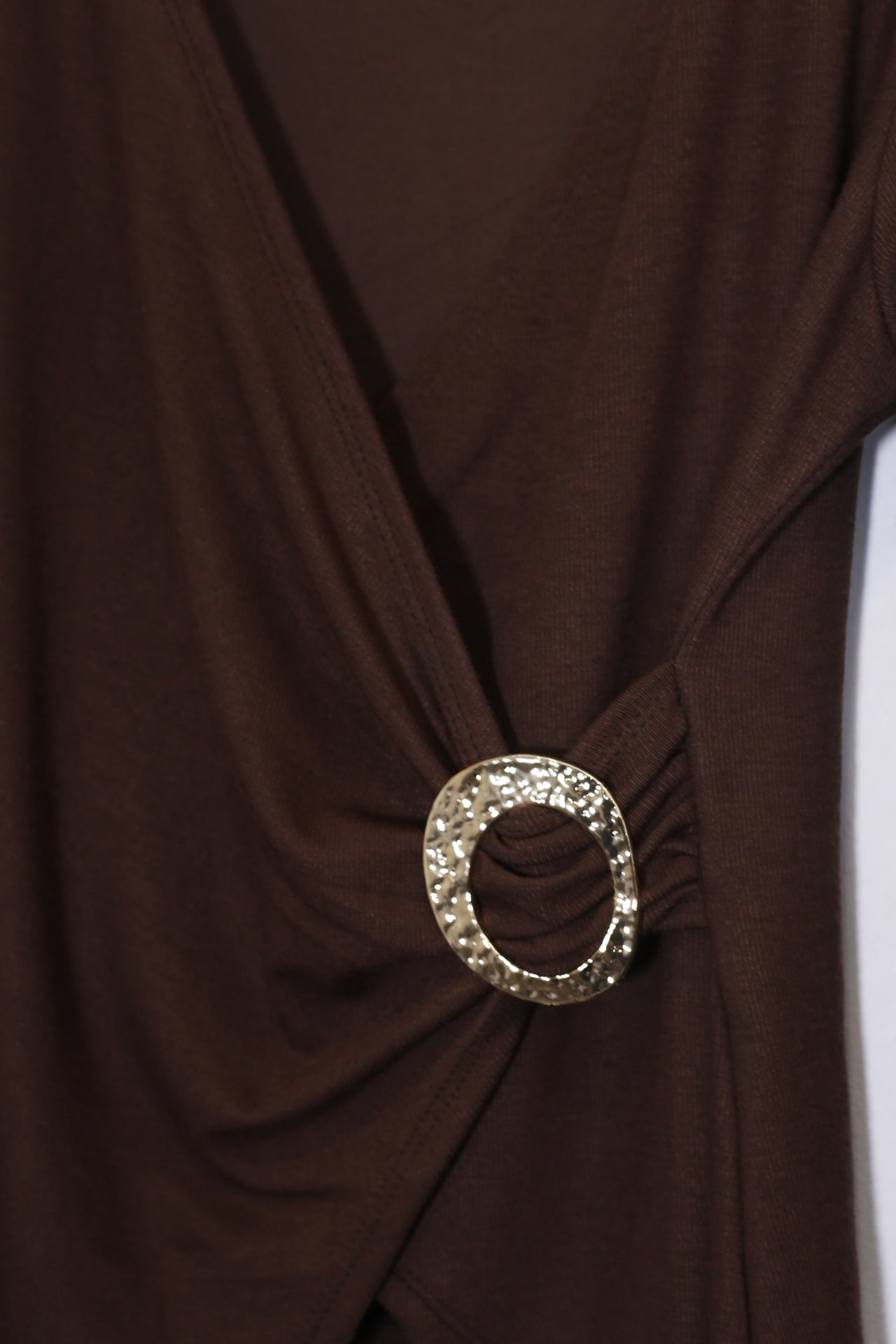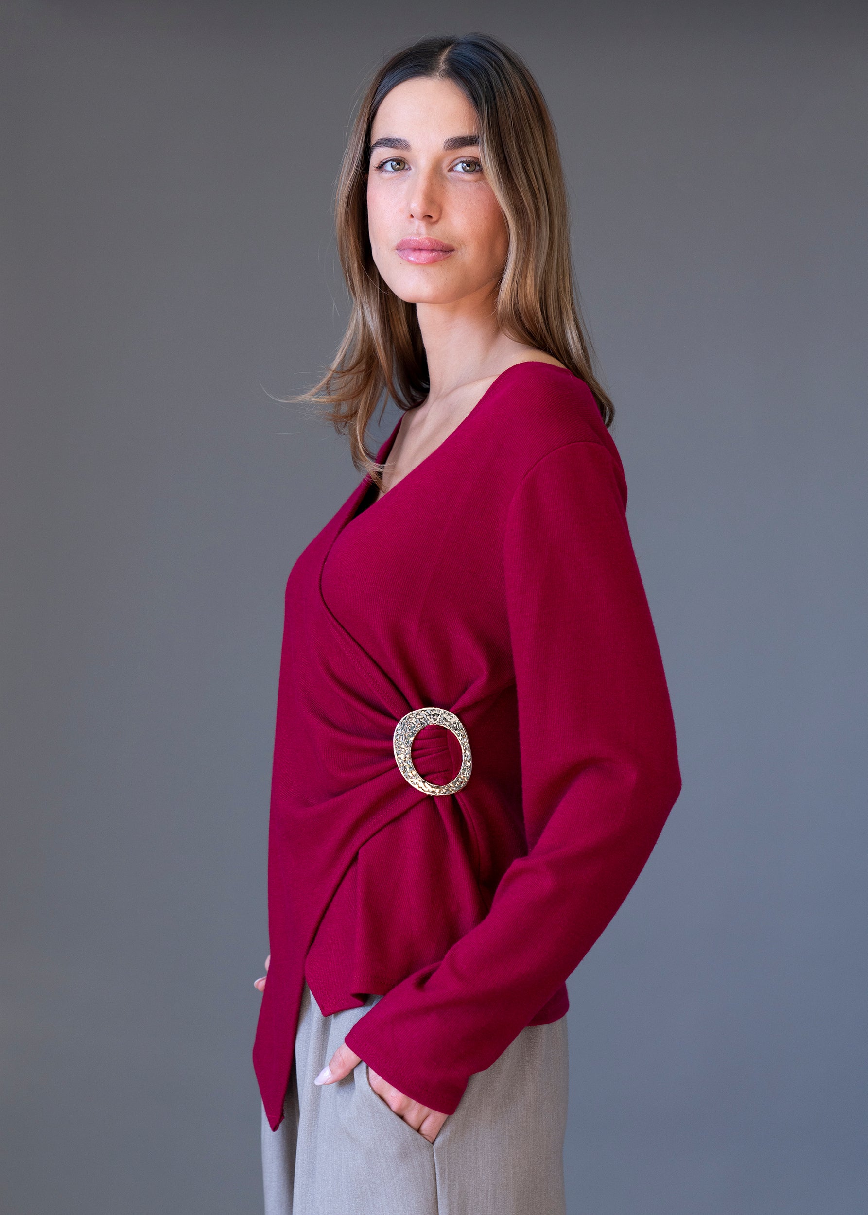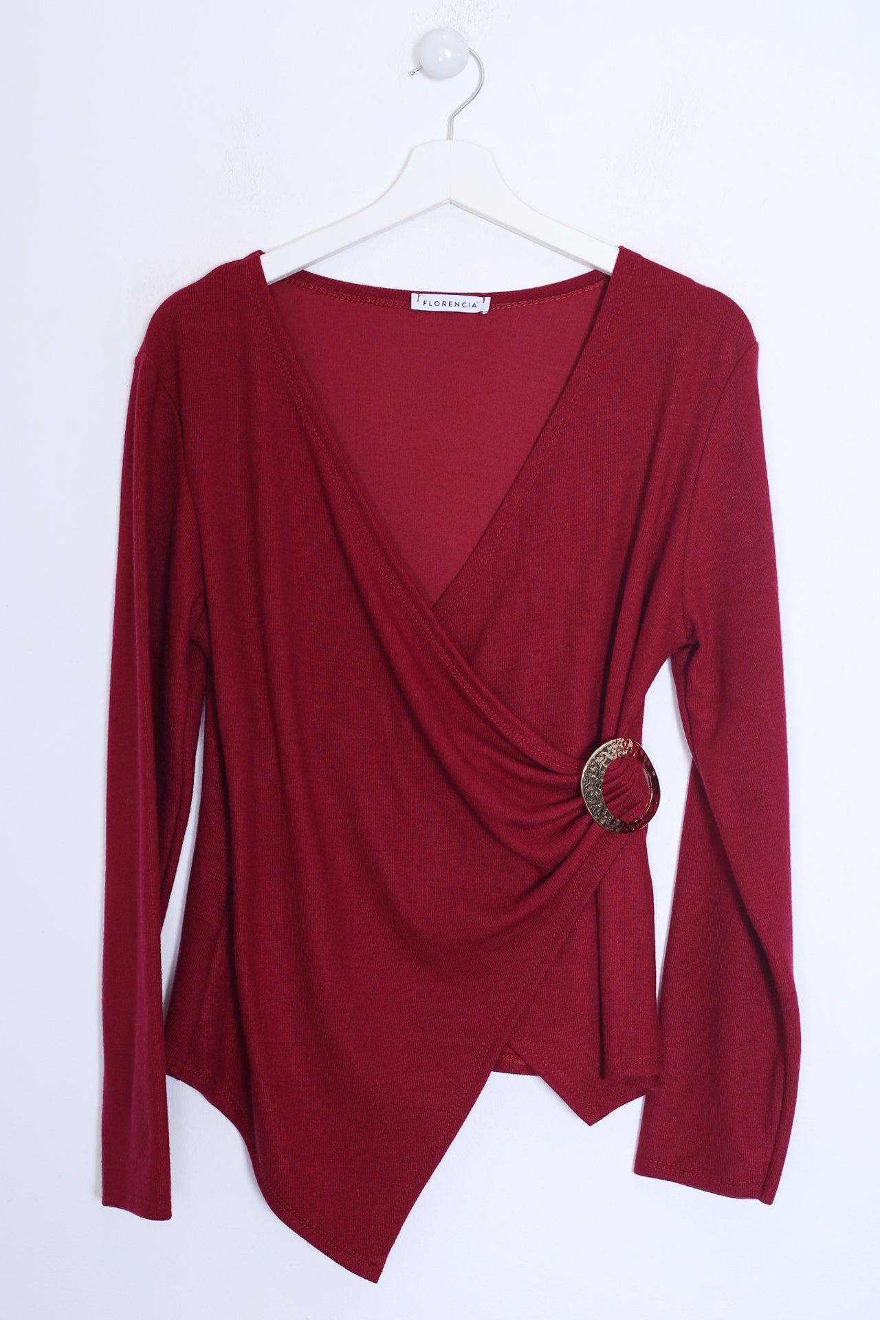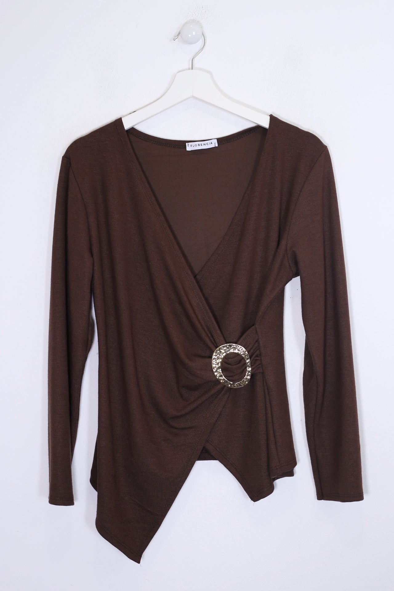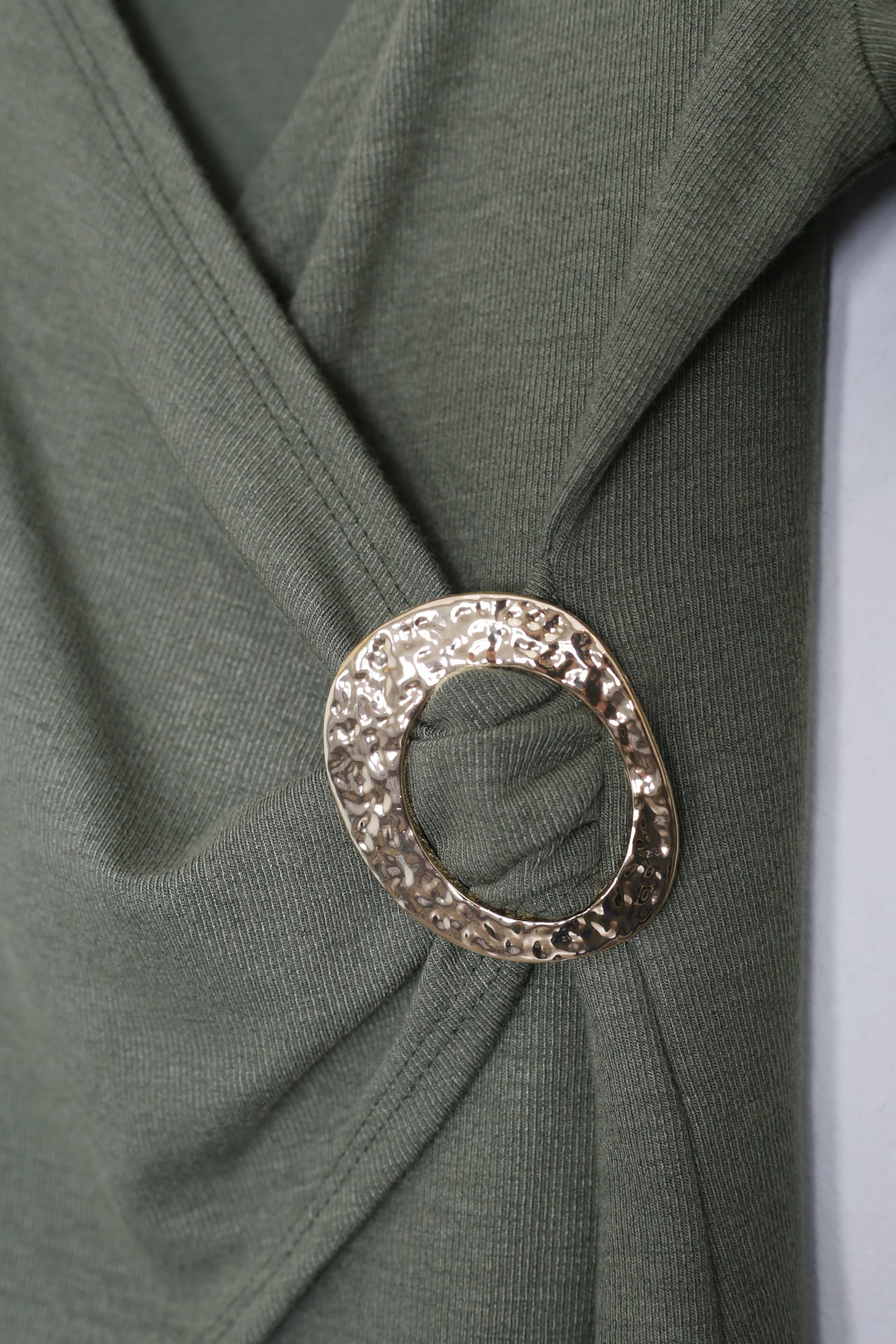 Camiseta con escote en punta cruzado y detalle de hebilla ovalada texturada. Manga larga. Bajo asimétrico acabado en punta en delantero.