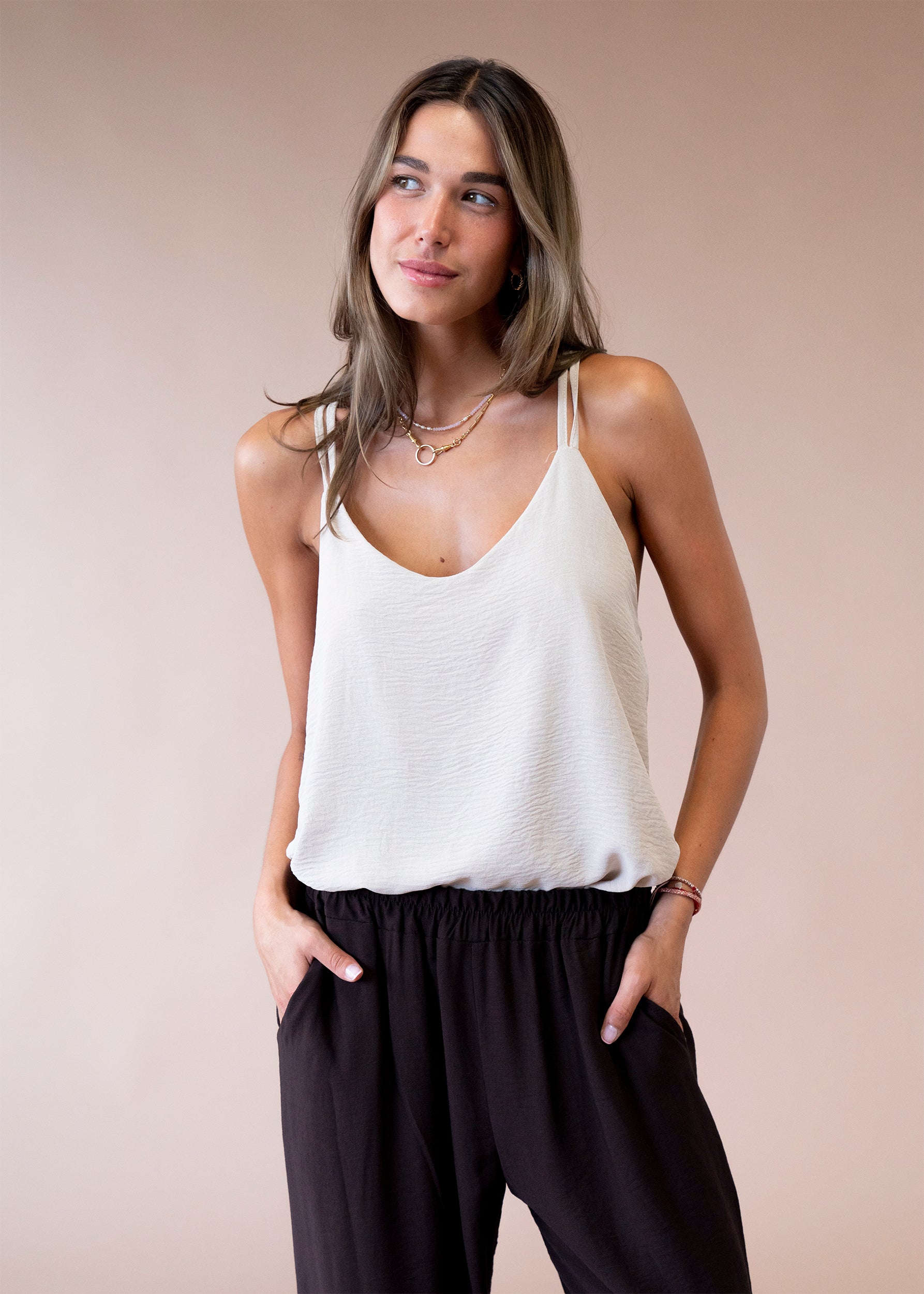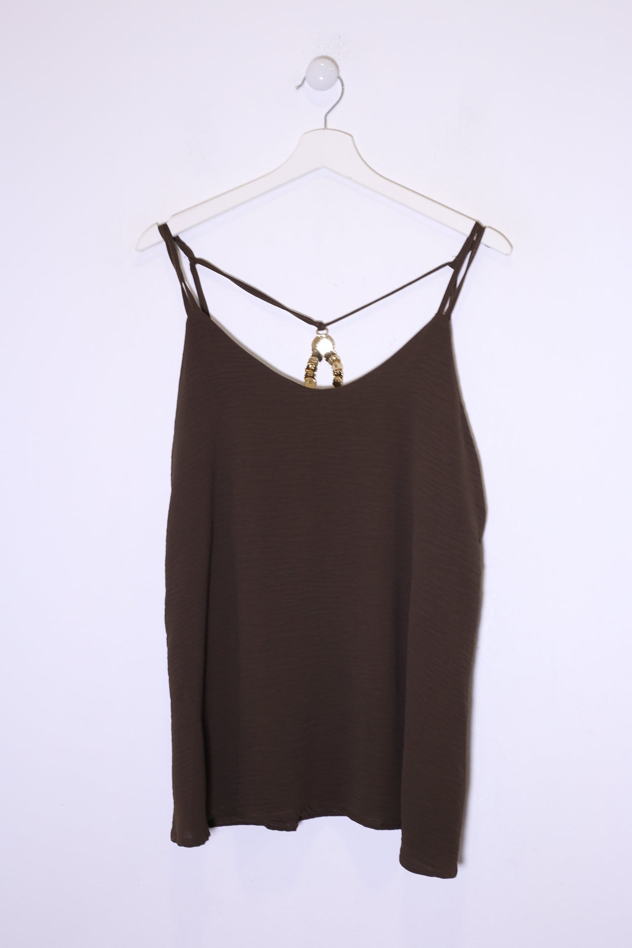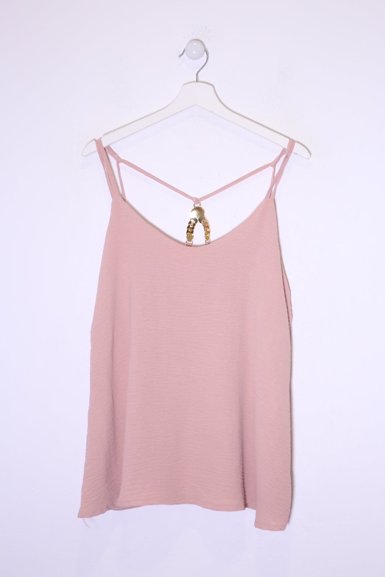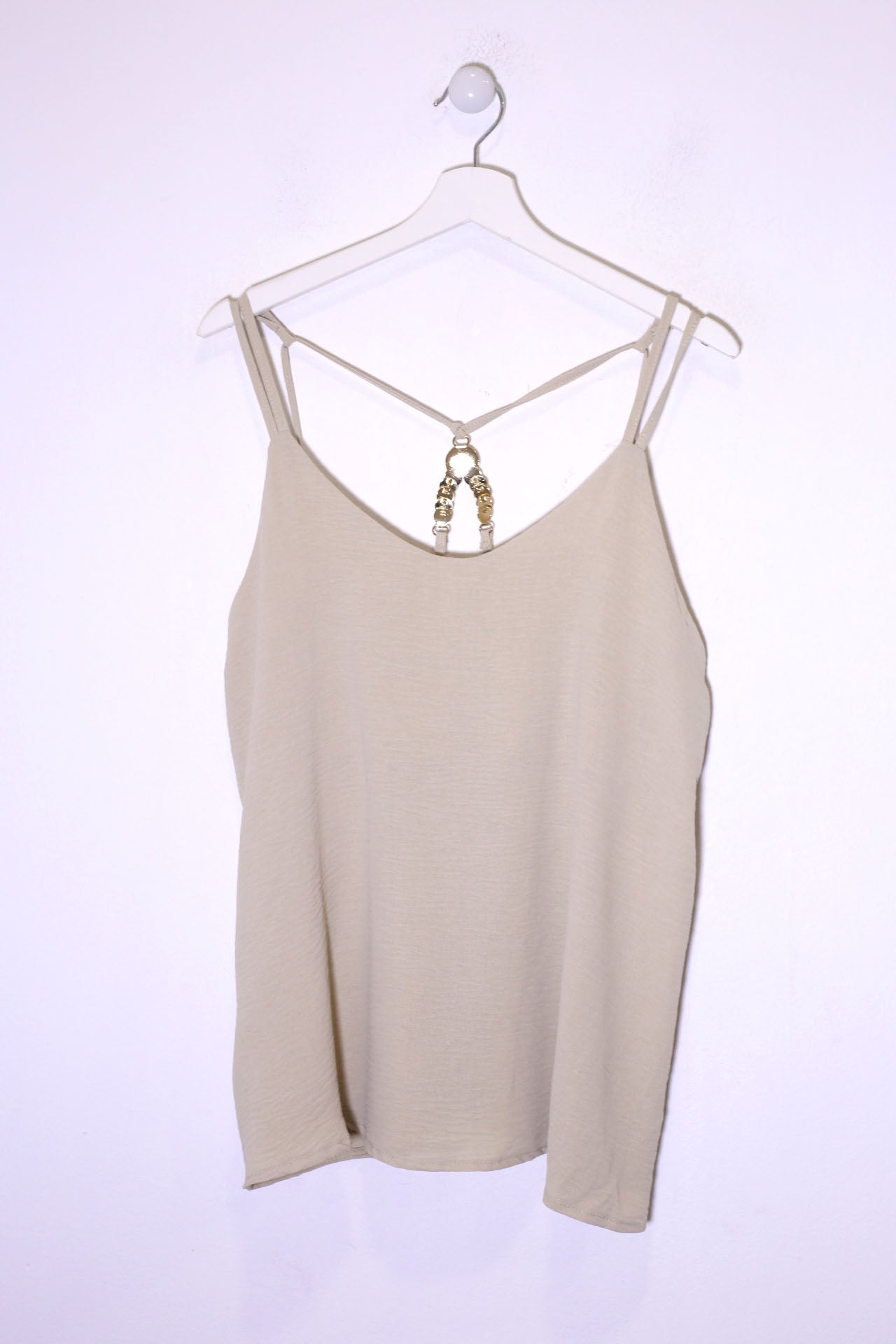 Top de tirantes dobles cruzados en la espalda con detalle de abalorios decorativos en los tirantes, escote redondo, elástico posterior y tejido con textura sutil.