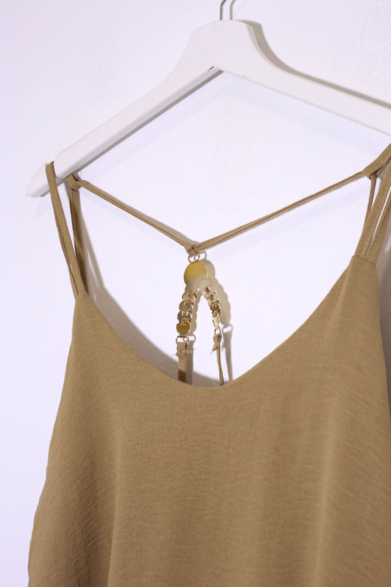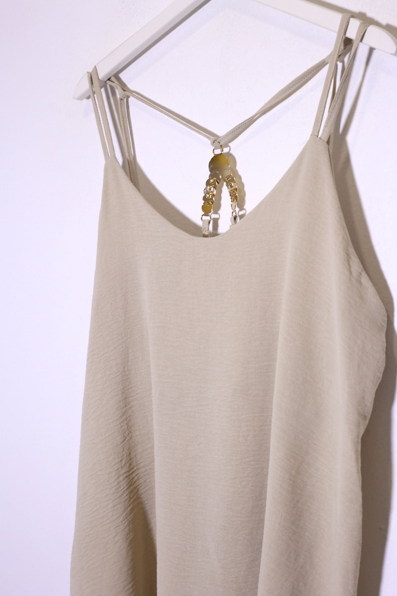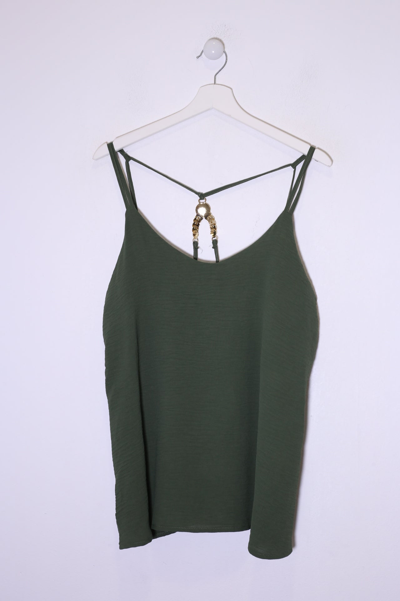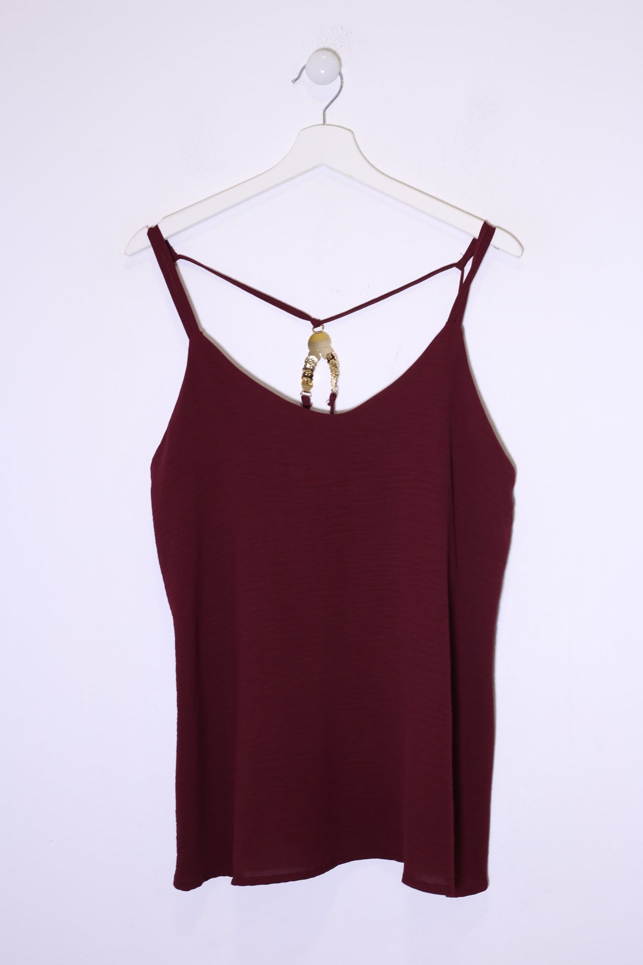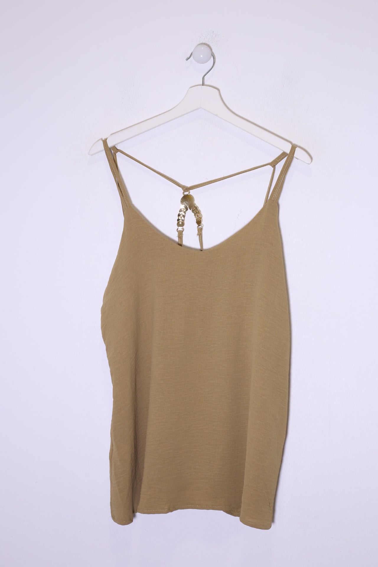 Top de tirantes dobles cruzados en la espalda con detalle de abalorios decorativos en los tirantes, escote redondo, elástico posterior y tejido con textura sutil.