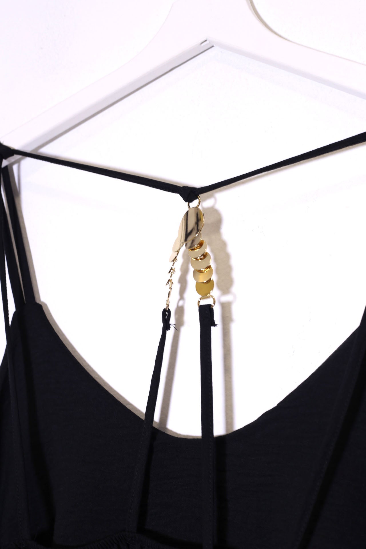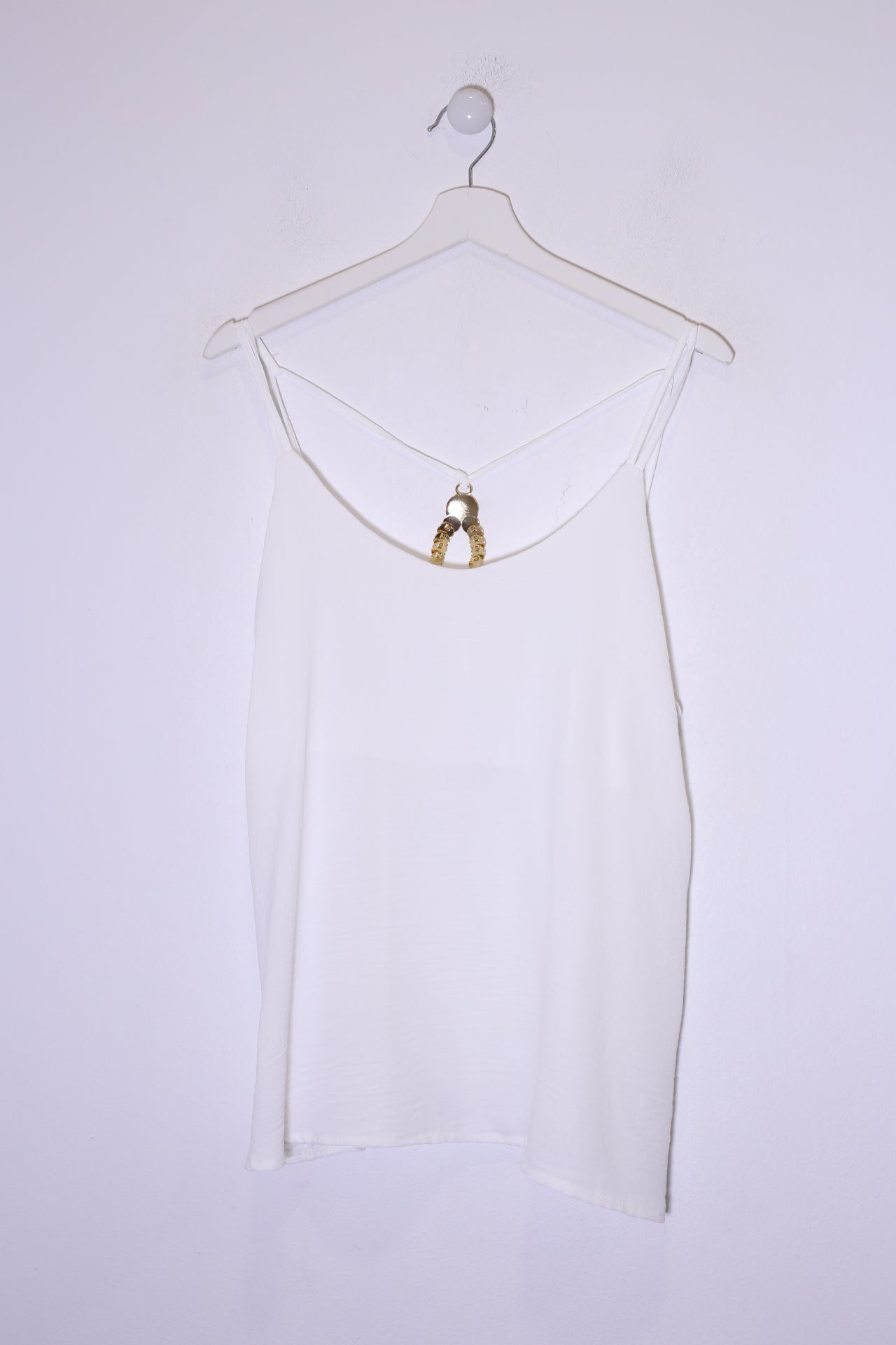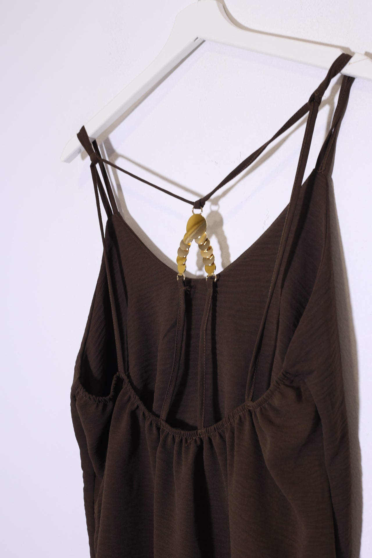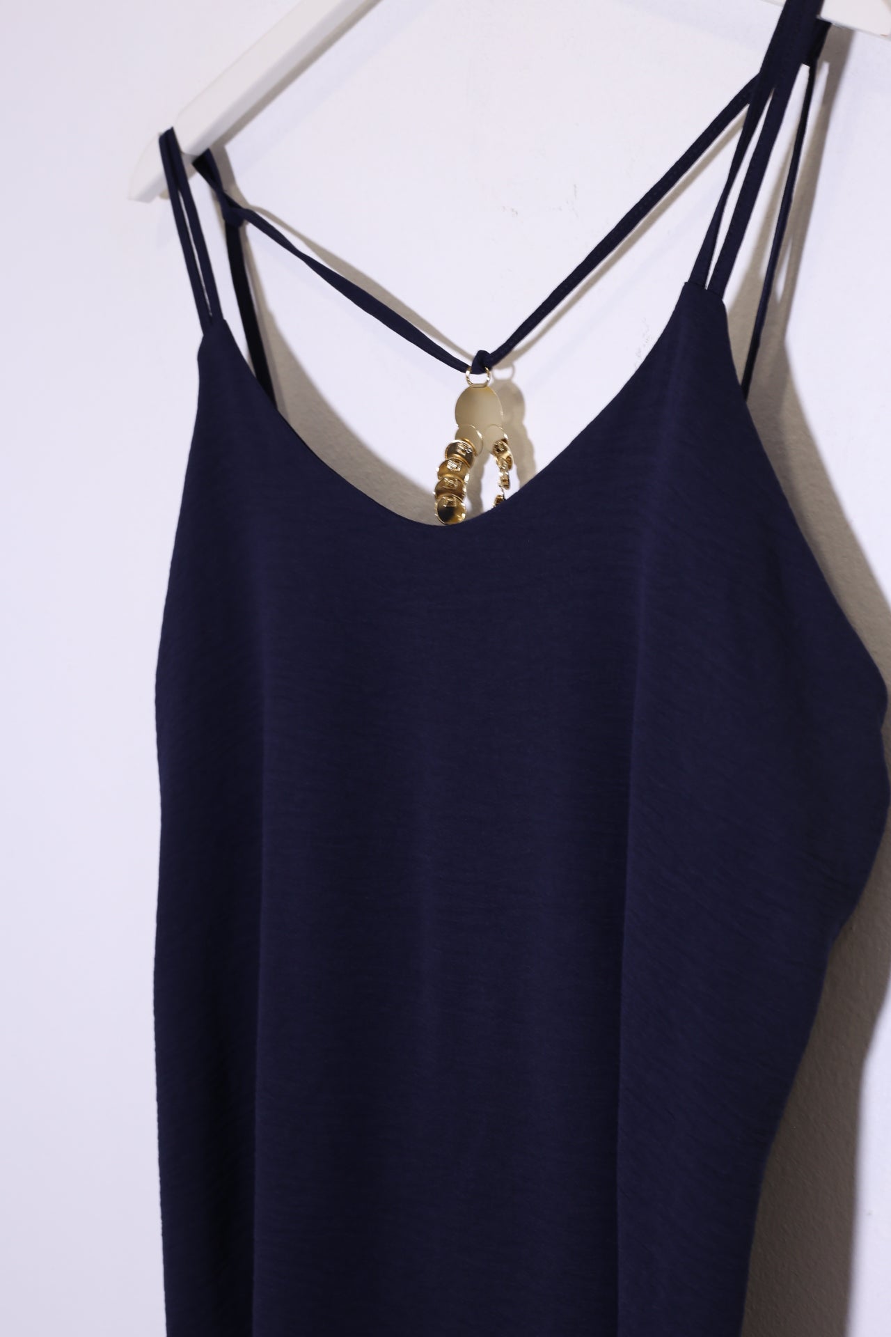 Top de tirantes dobles cruzados en la espalda con detalle de abalorios decorativos en los tirantes, escote redondo, elástico posterior y tejido con textura sutil.