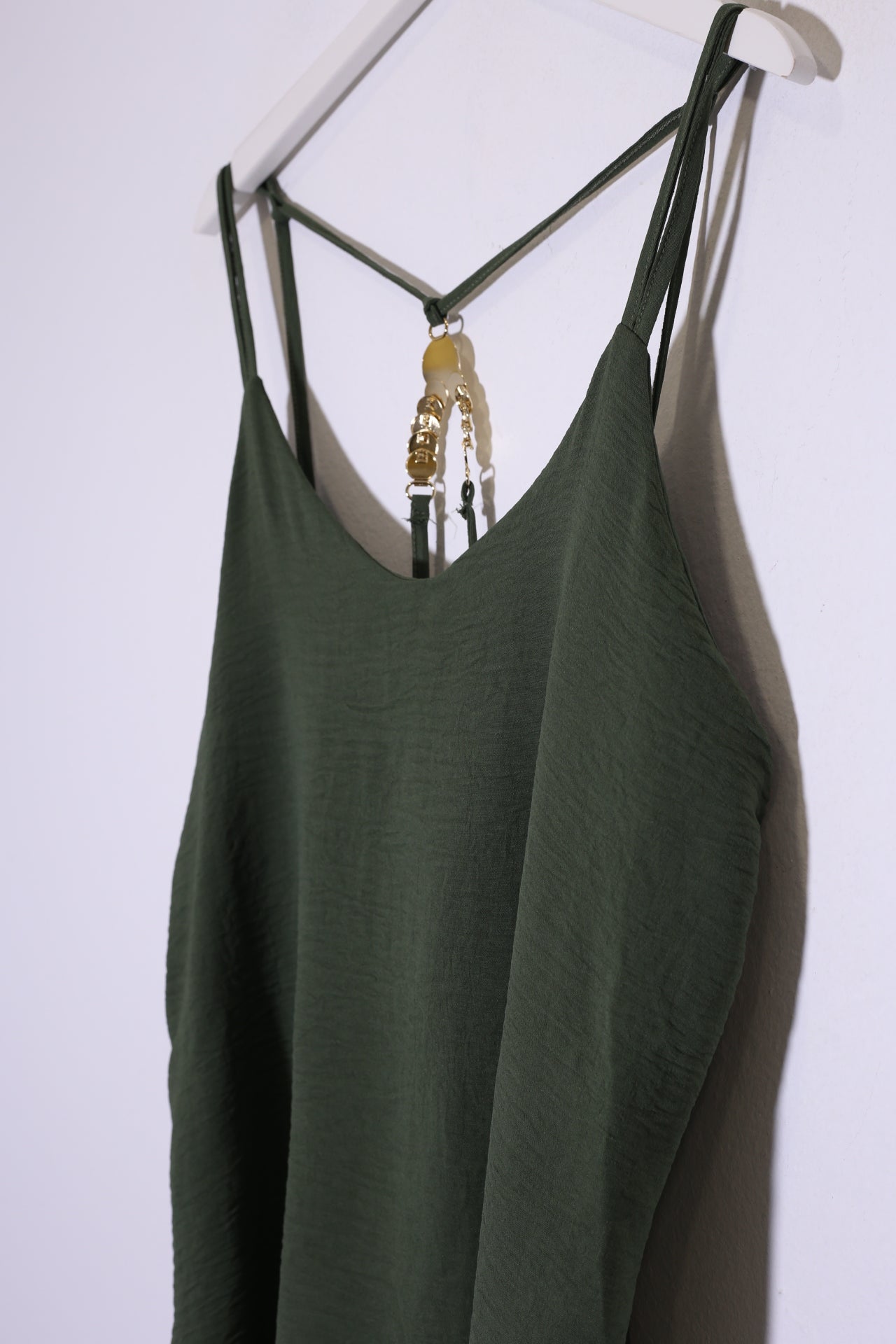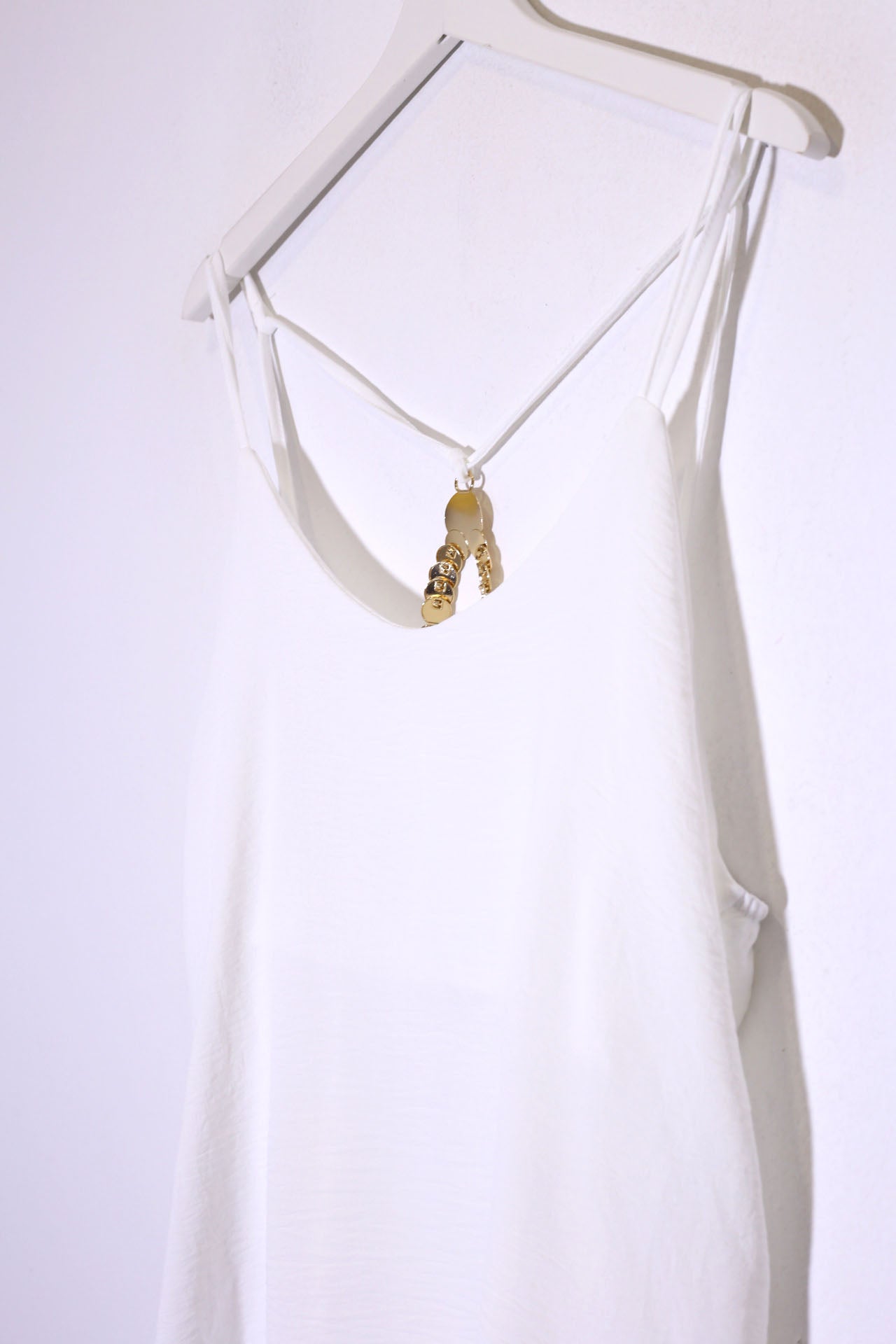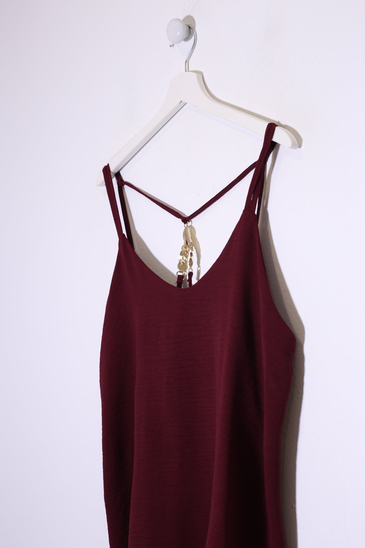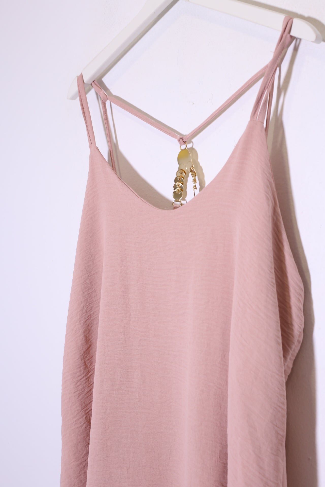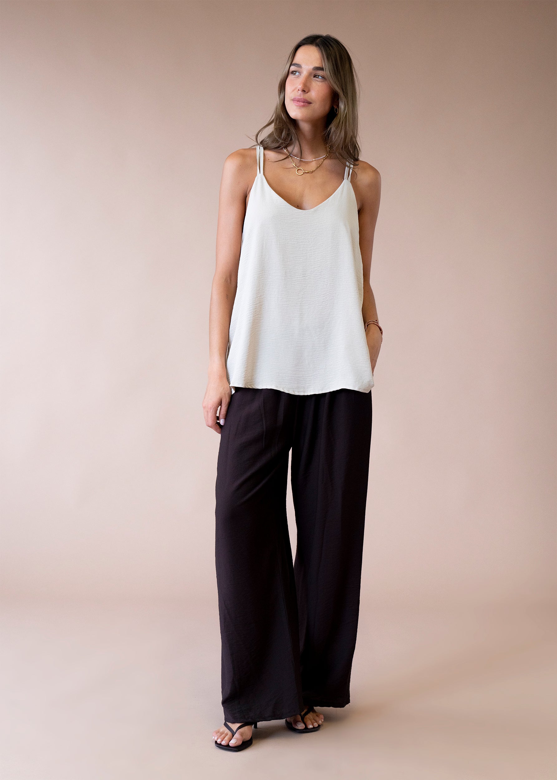 Top de tirantes dobles cruzados en la espalda con detalle de abalorios decorativos en los tirantes, escote redondo, elástico posterior y tejido con textura sutil.
