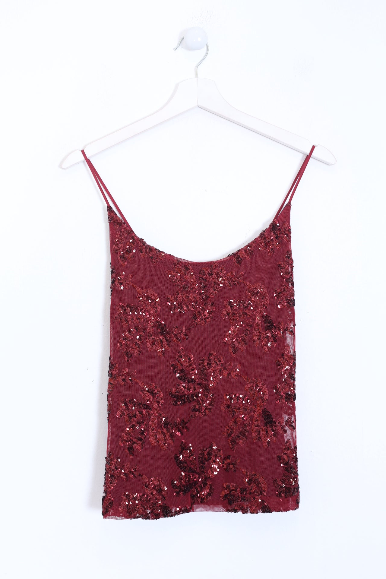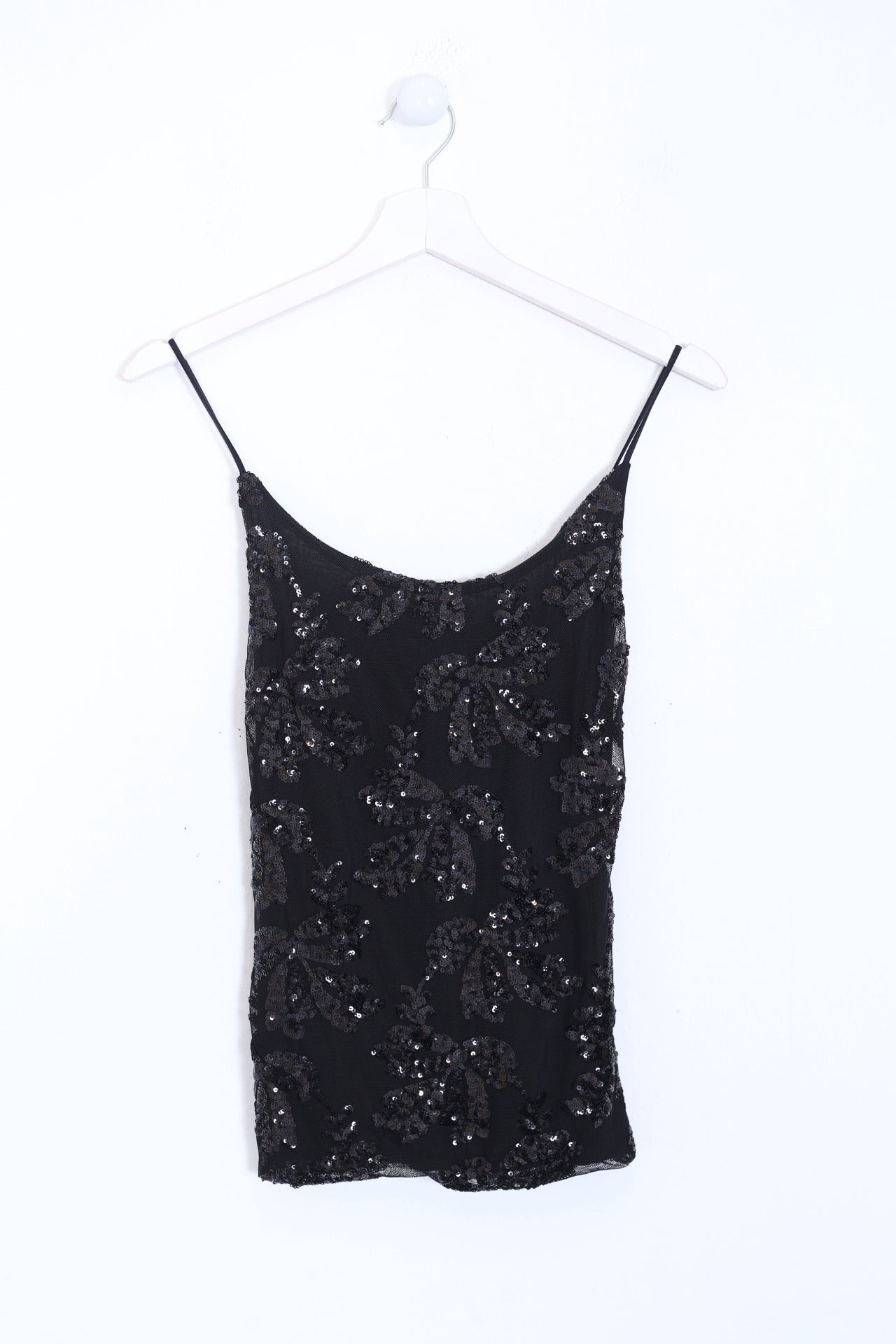Top de tirantes finos y escote redondo. Tejido con aplicaciones de lentejuelas a tono con forma de lazos.