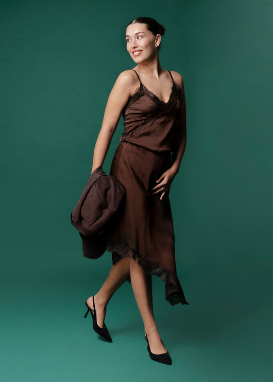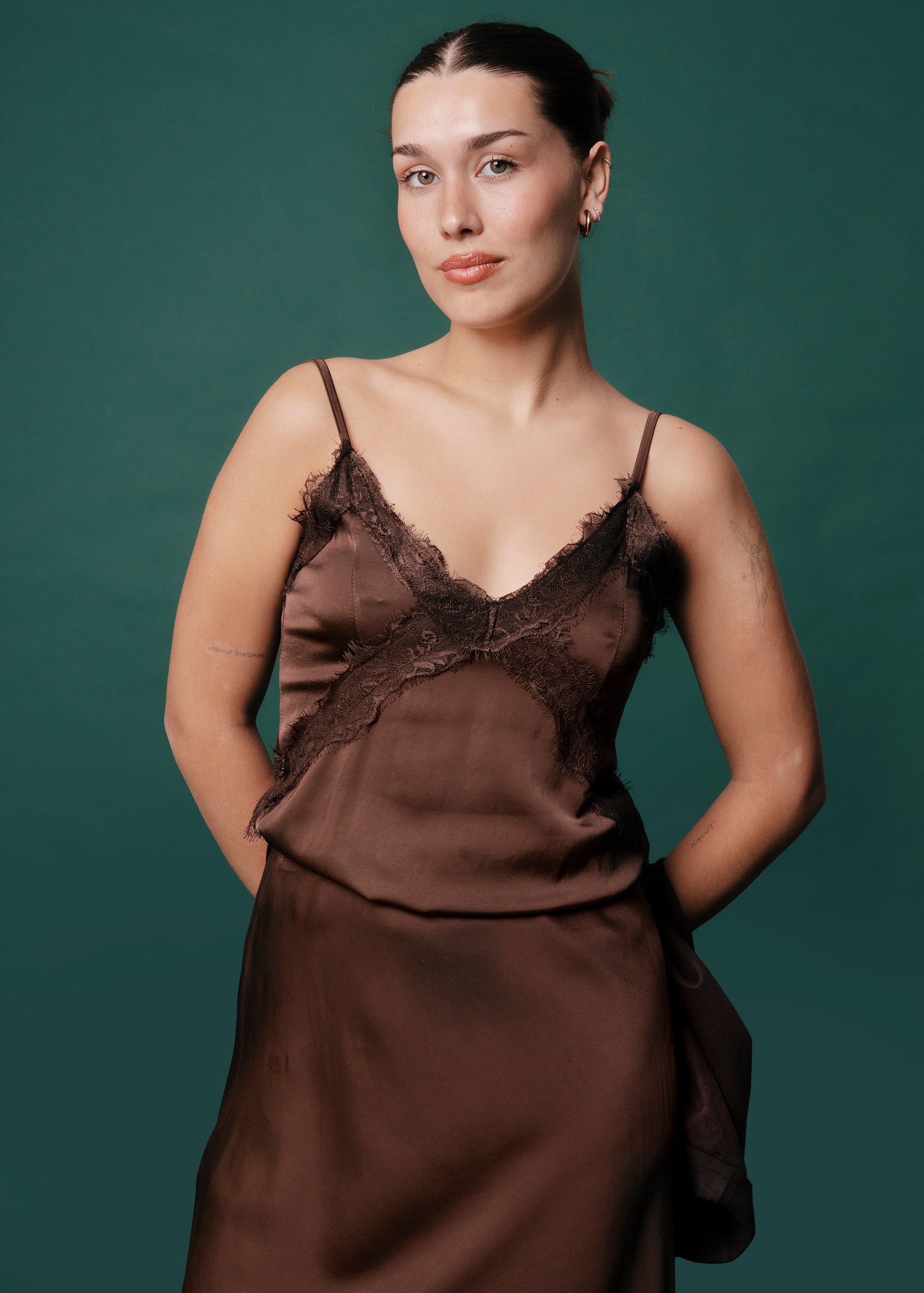 Top de tirantes finos ajustables y escote en punta. Detalle de encaje en escote y frontal.