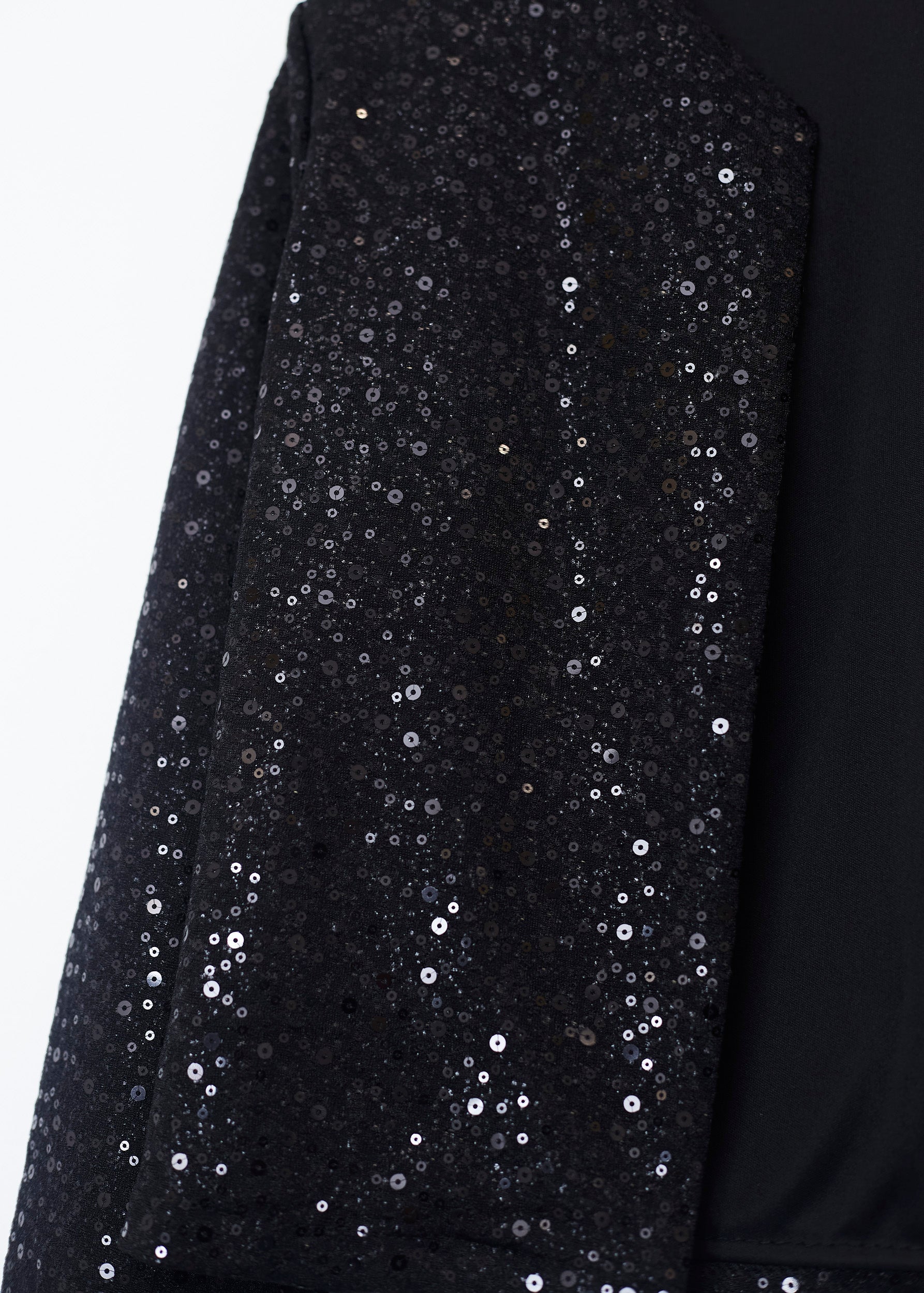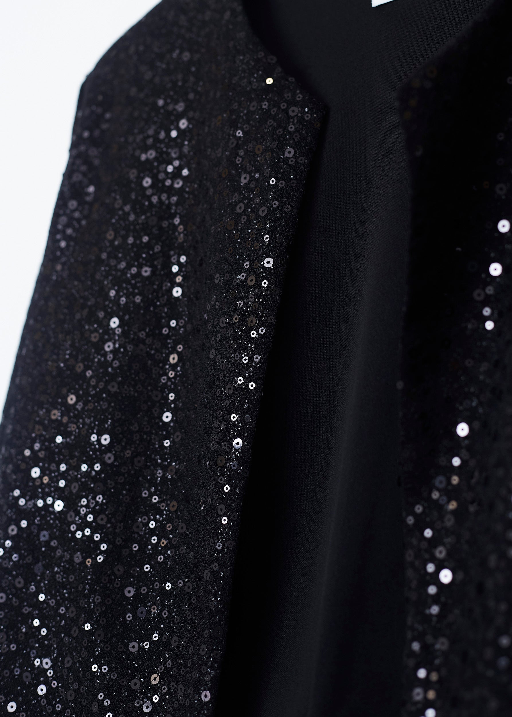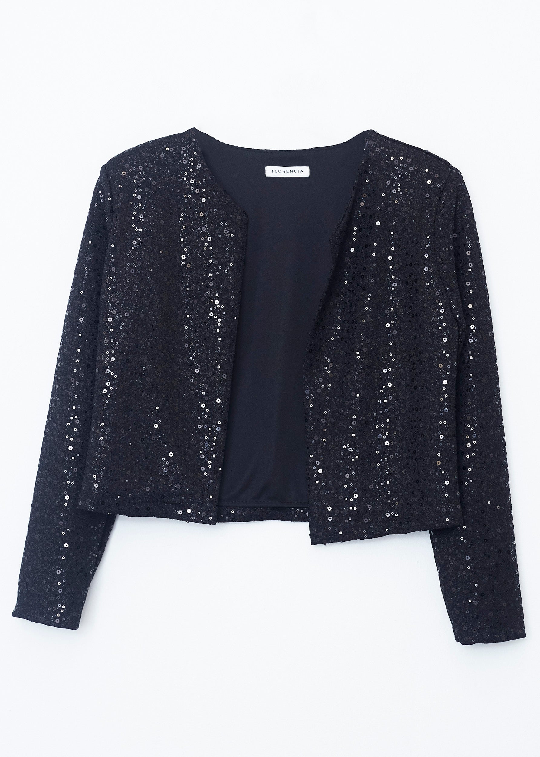 Torera con cuello caja y manga larga. Tejido con detalle de lentejuelas. Forro interior.