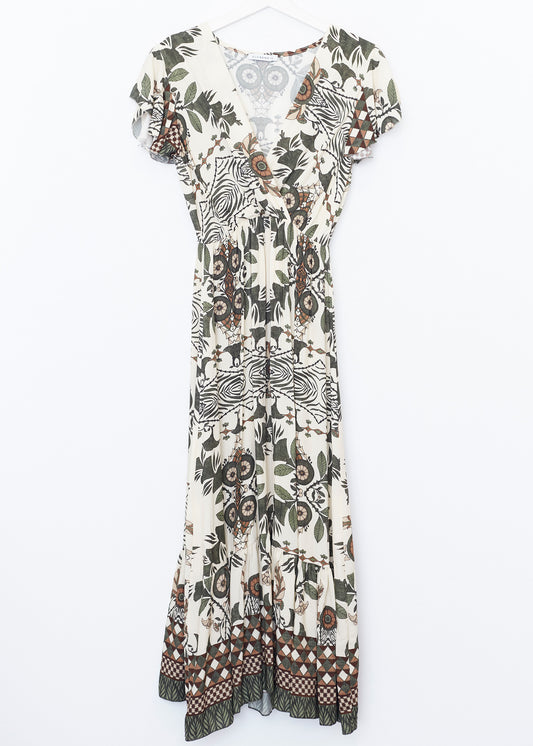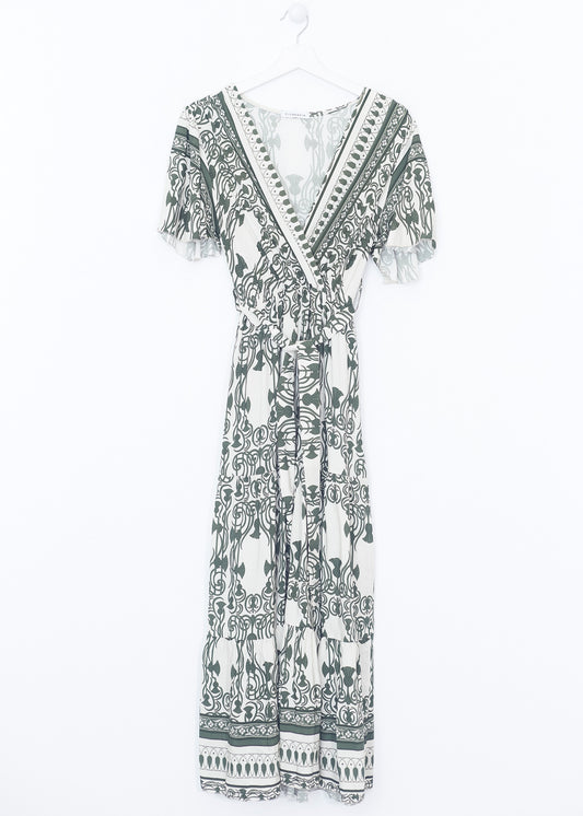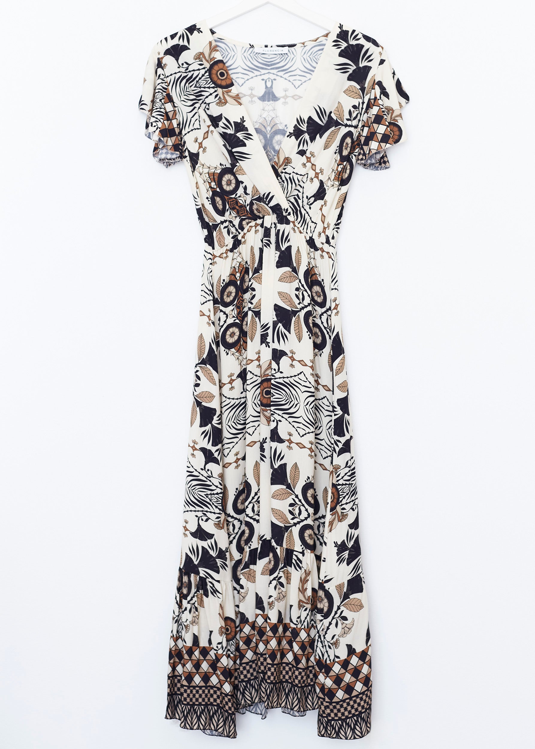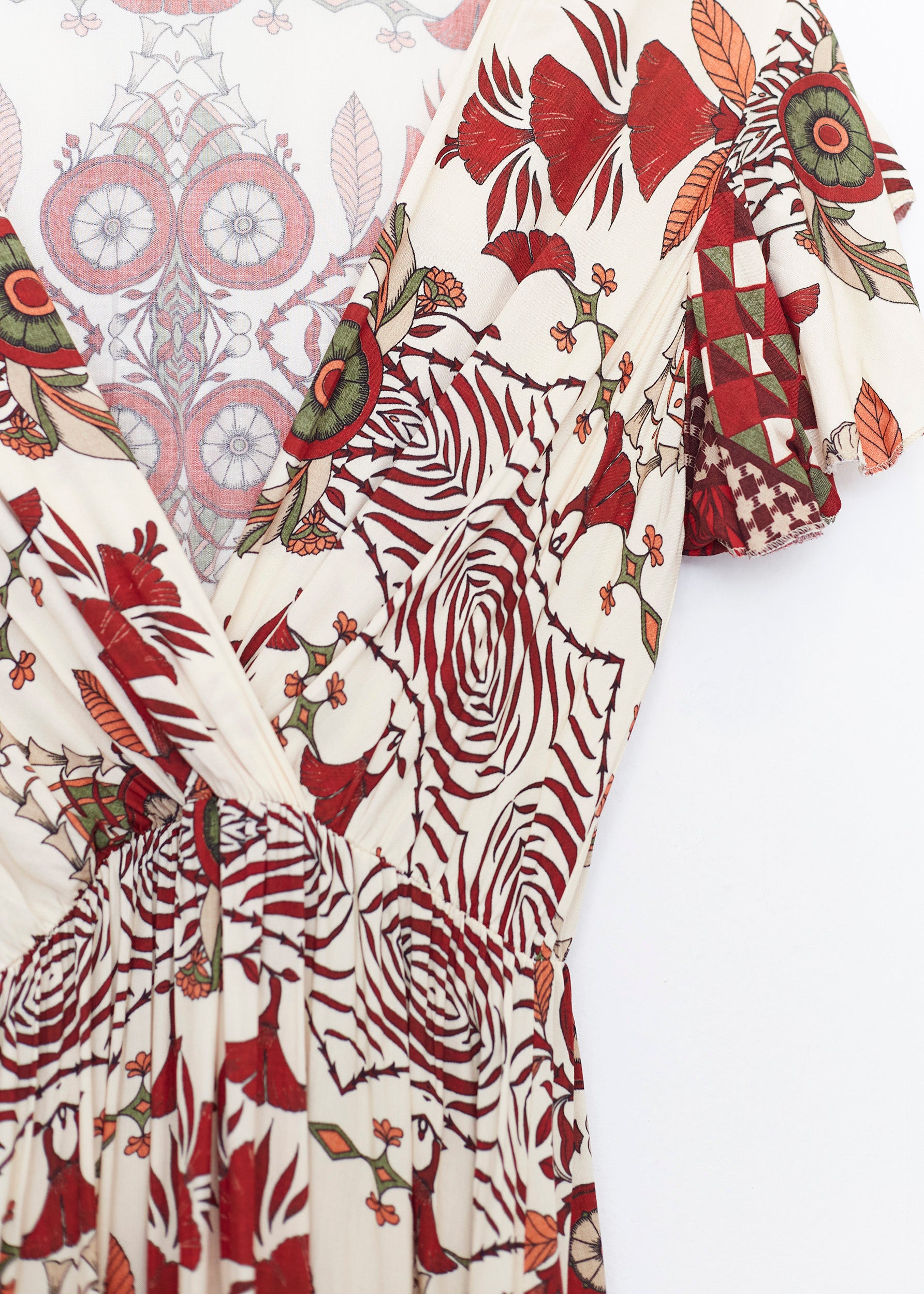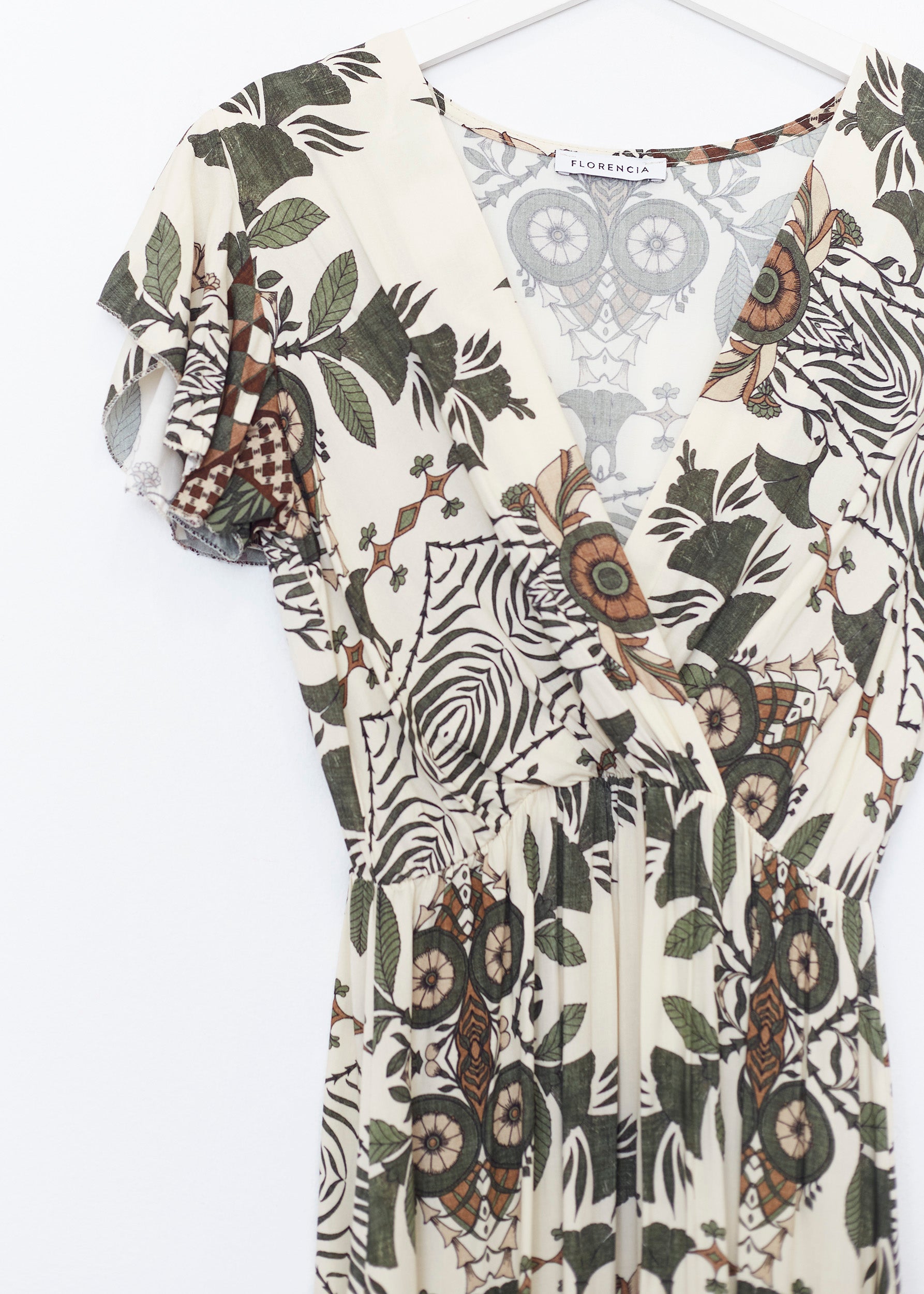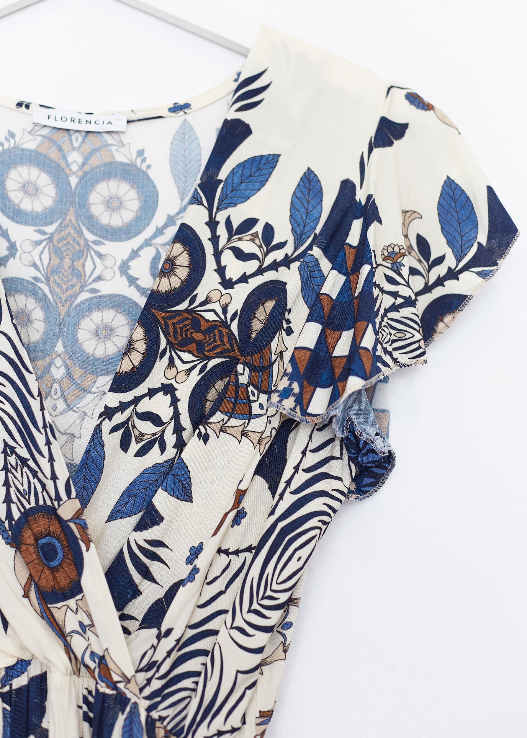 Vestido de manga corta con detalle de volantes y escote cruzado en punta. Cintura elástica. Detalle de volante en bajo. Estampado floral.
