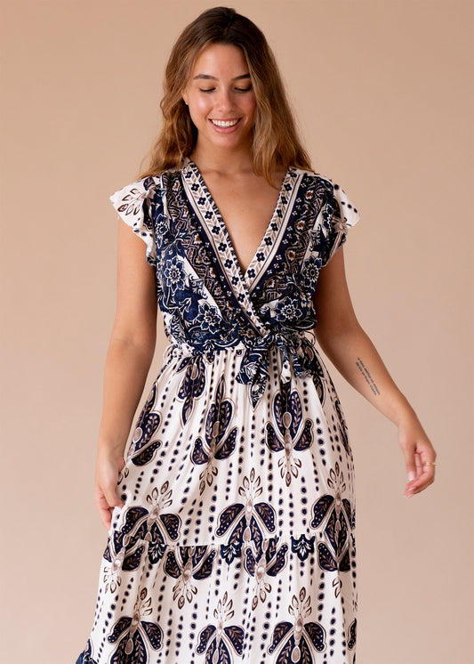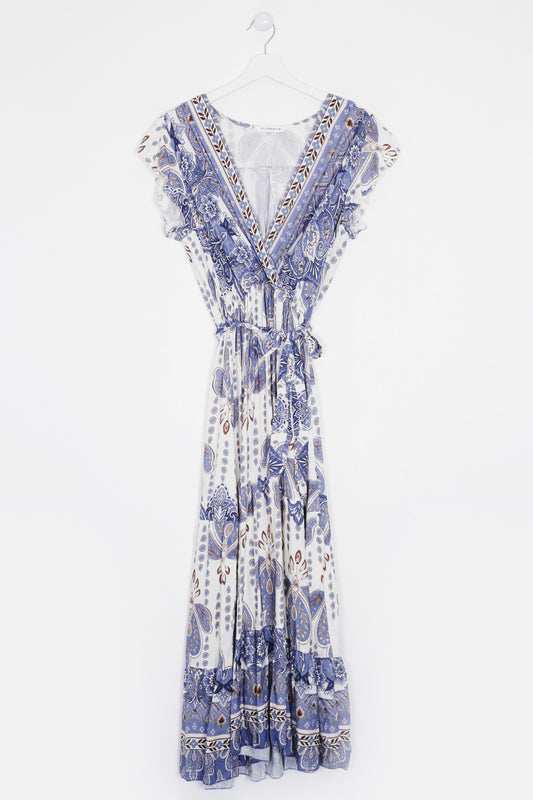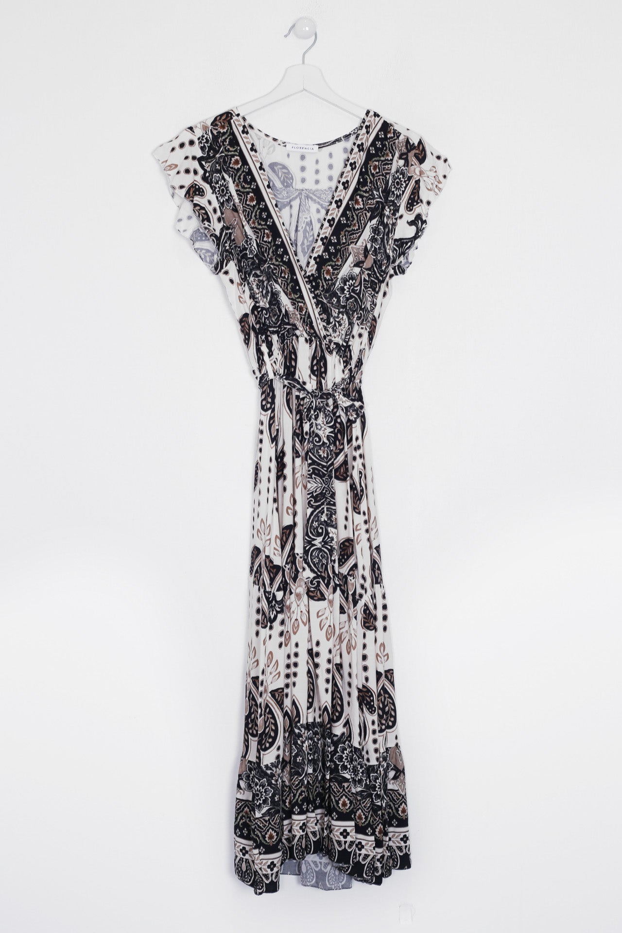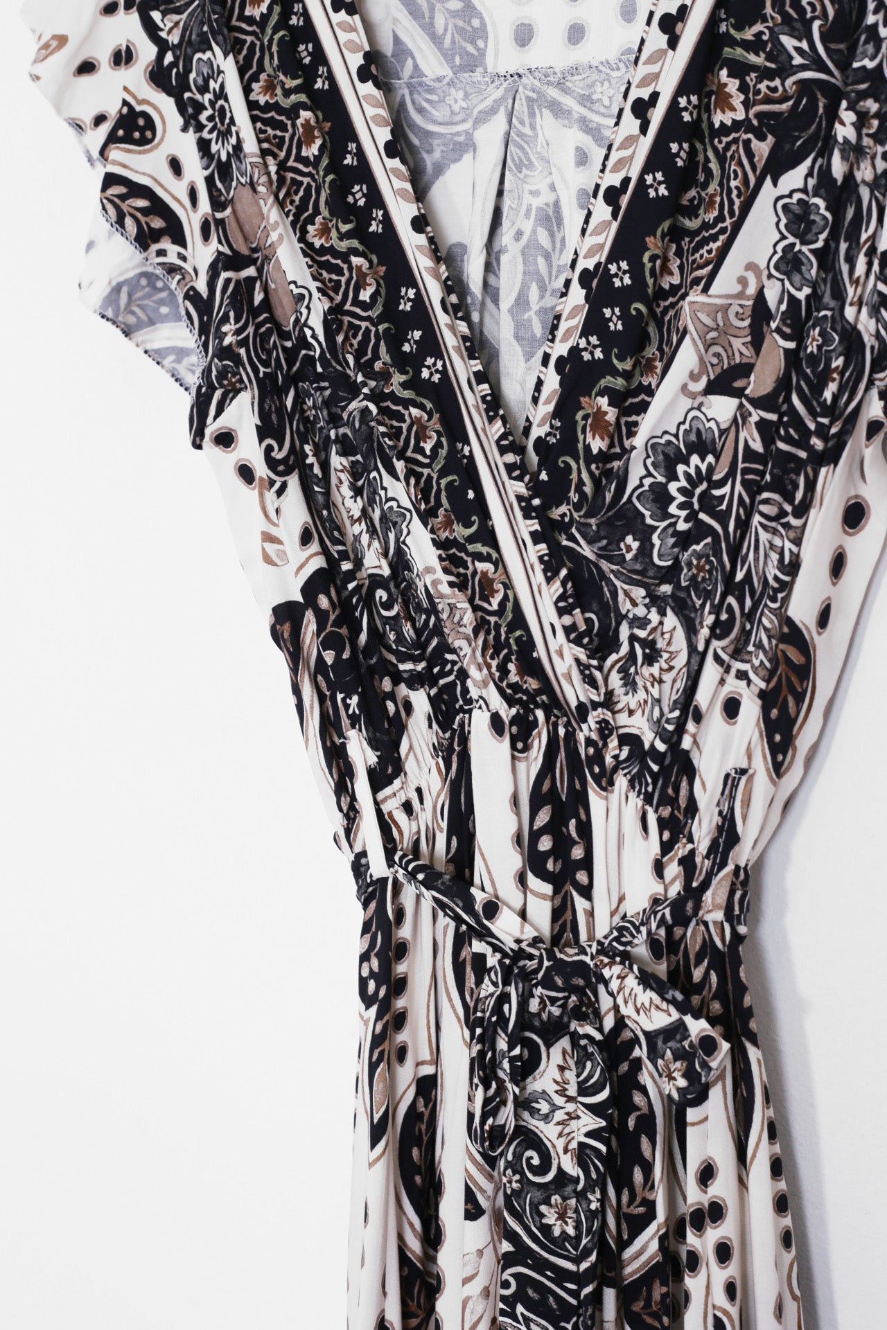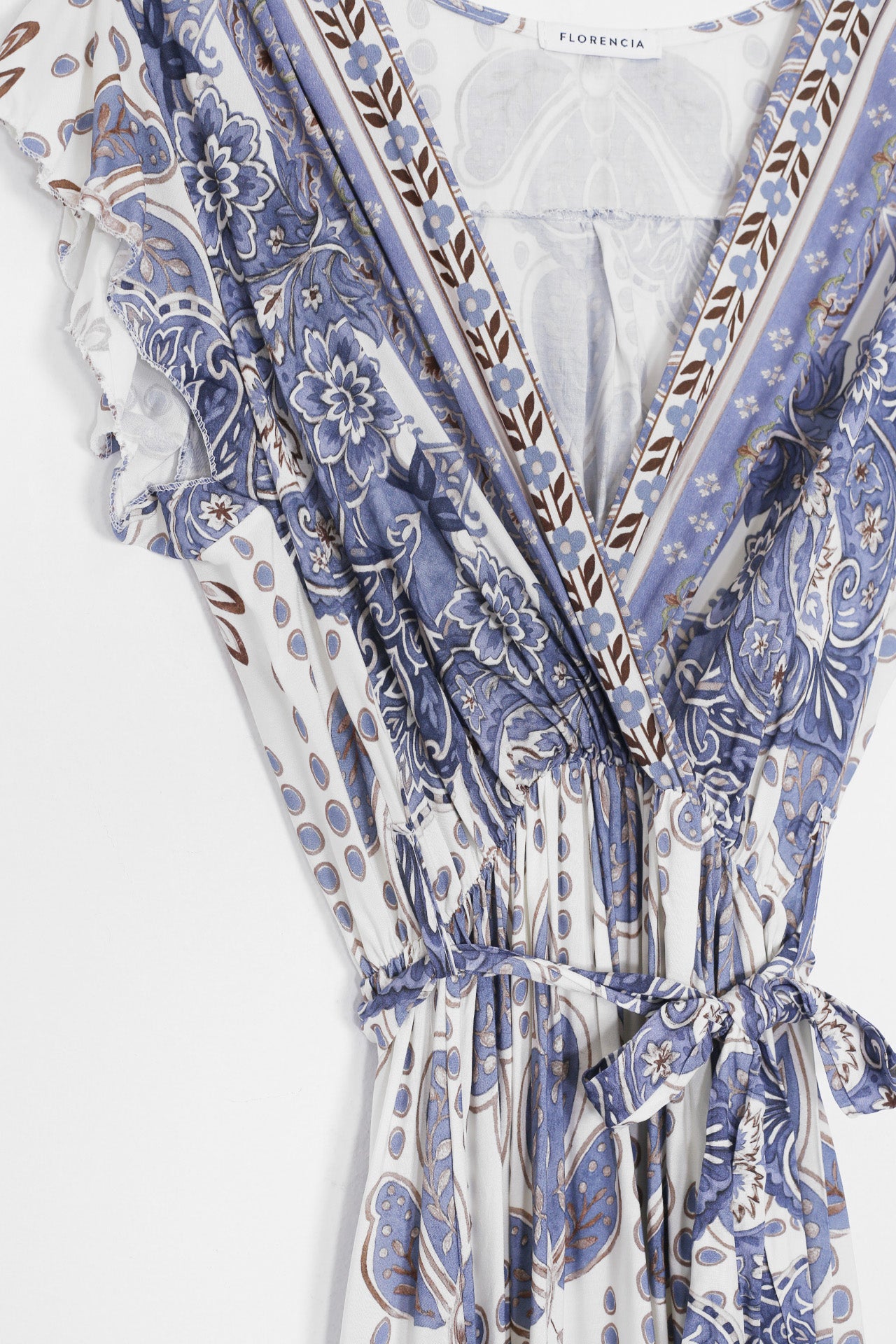 Vestido largo de escote en punta cruzado. Manga corta con volante. Cintura elástica con detalle de trabillas y cinturón en el mismo tejido. Bajo con volantes.