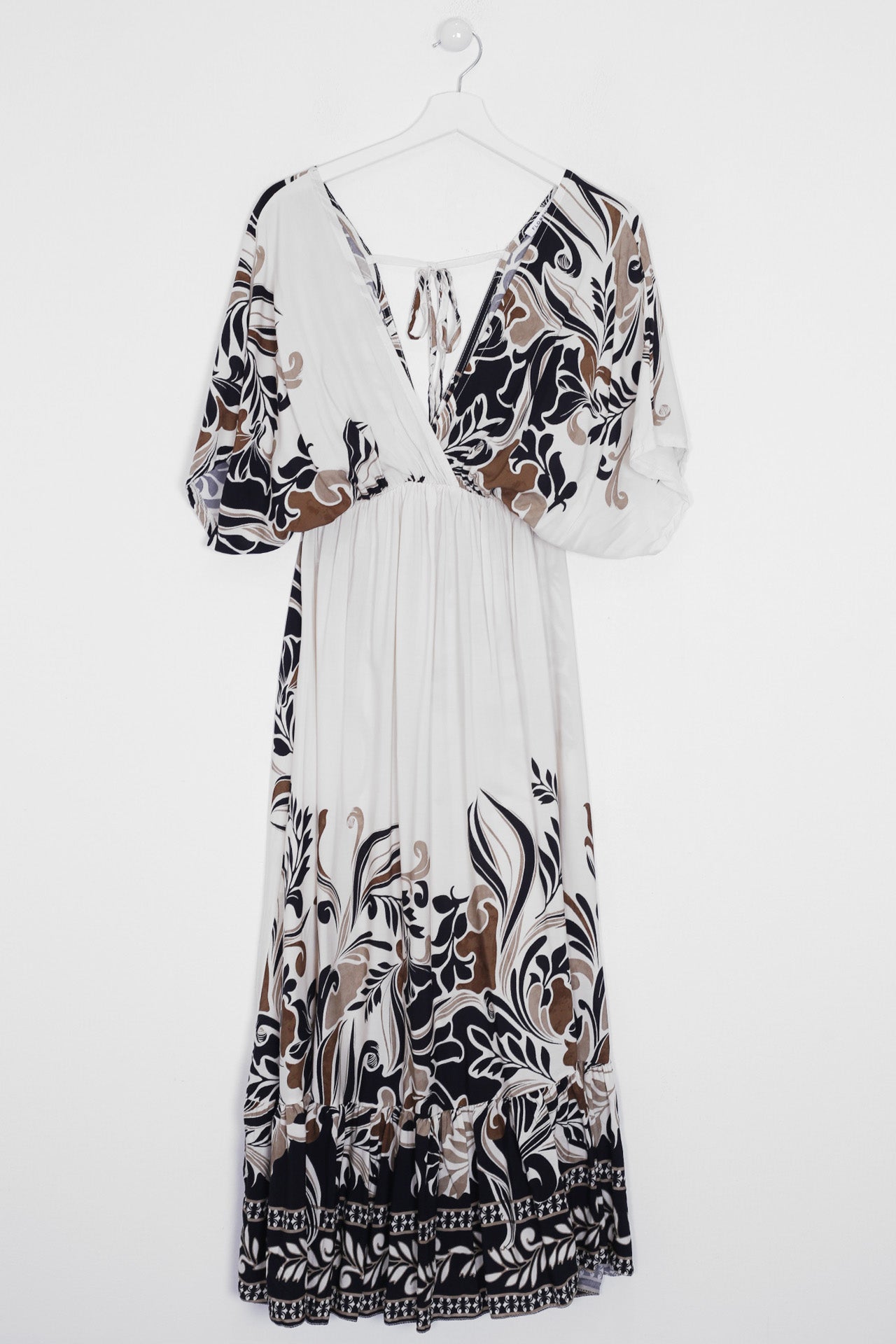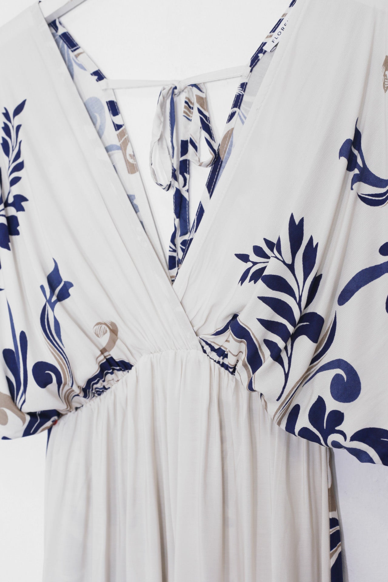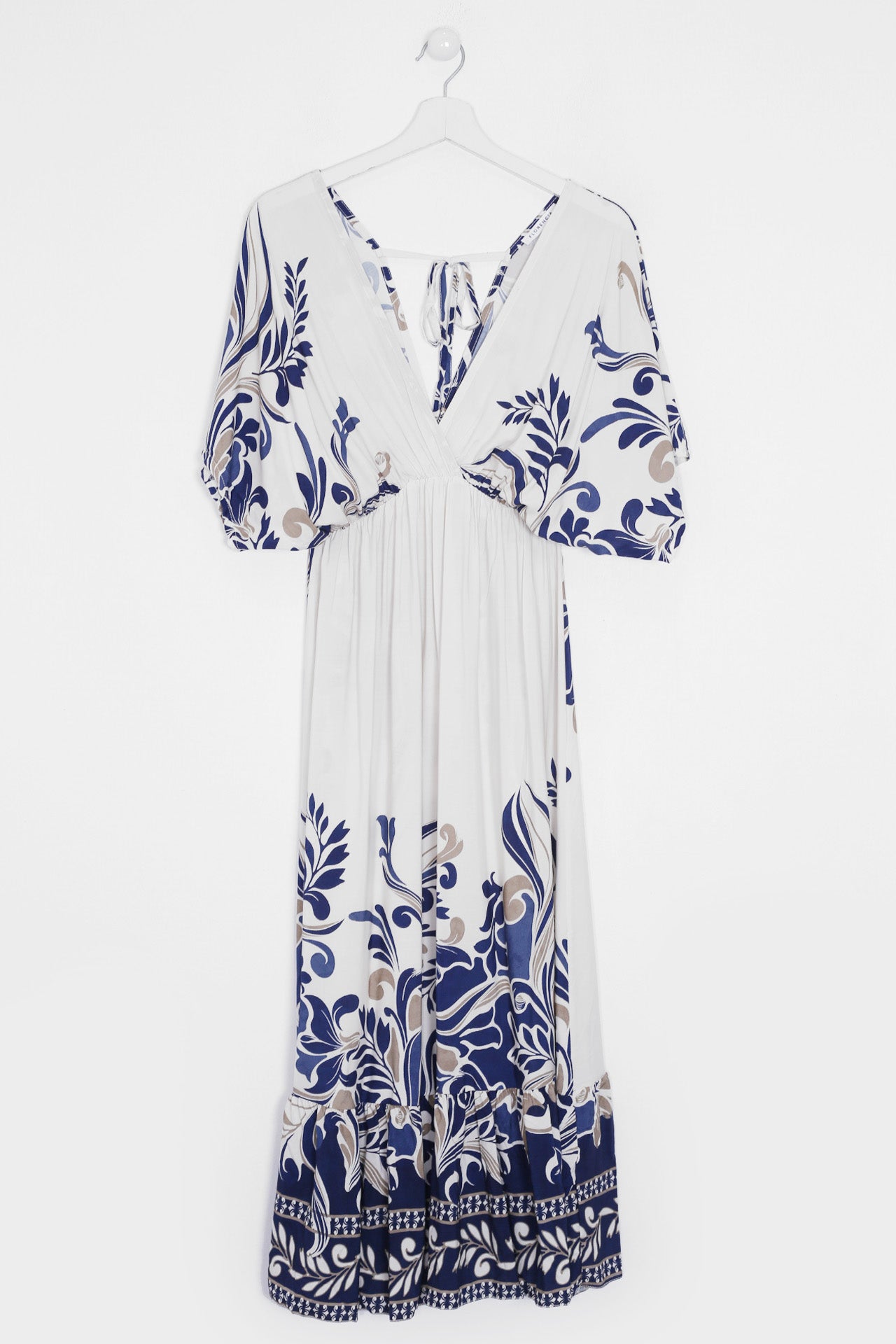 Vestido largo de escote en punta cruzado. Manga corta. Detalle de cierre con nudo en espalda. Cintura elástica. Bajo con volante.