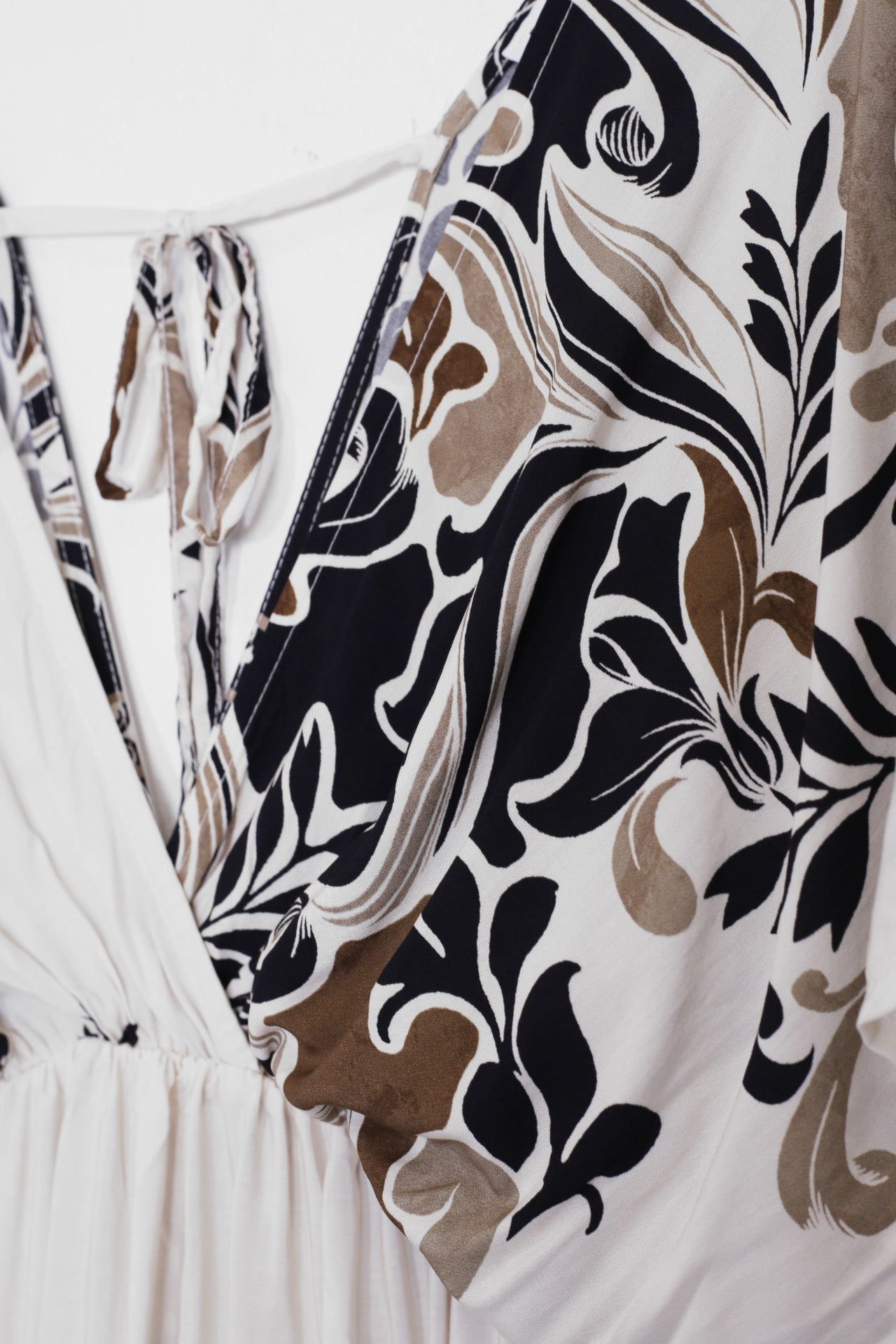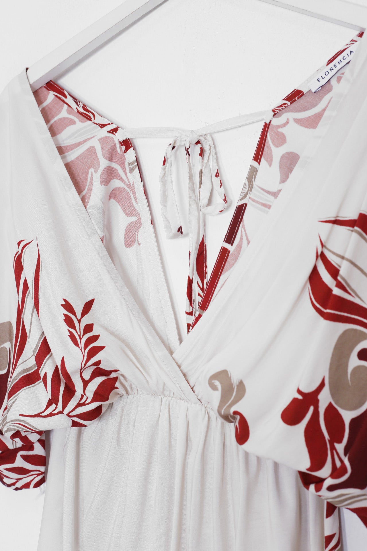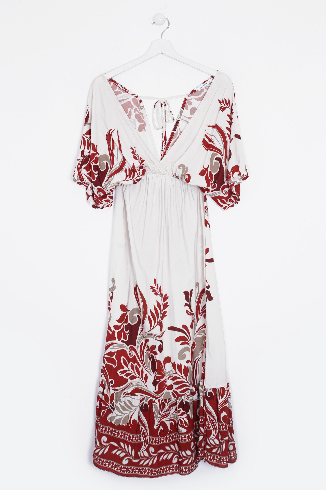 Vestido largo de escote en punta cruzado. Manga corta. Detalle de cierre con nudo en espalda. Cintura elástica. Bajo con volante.