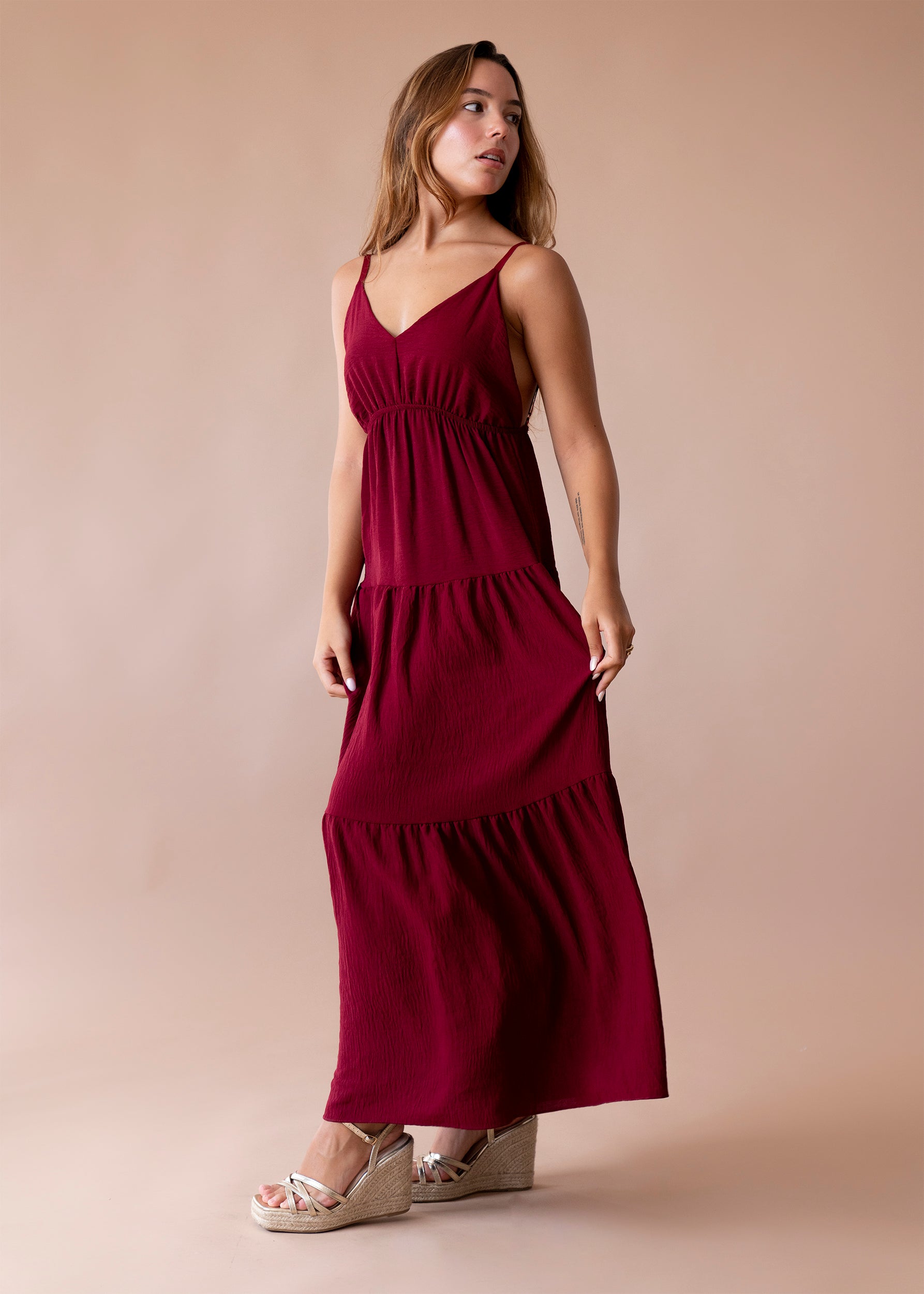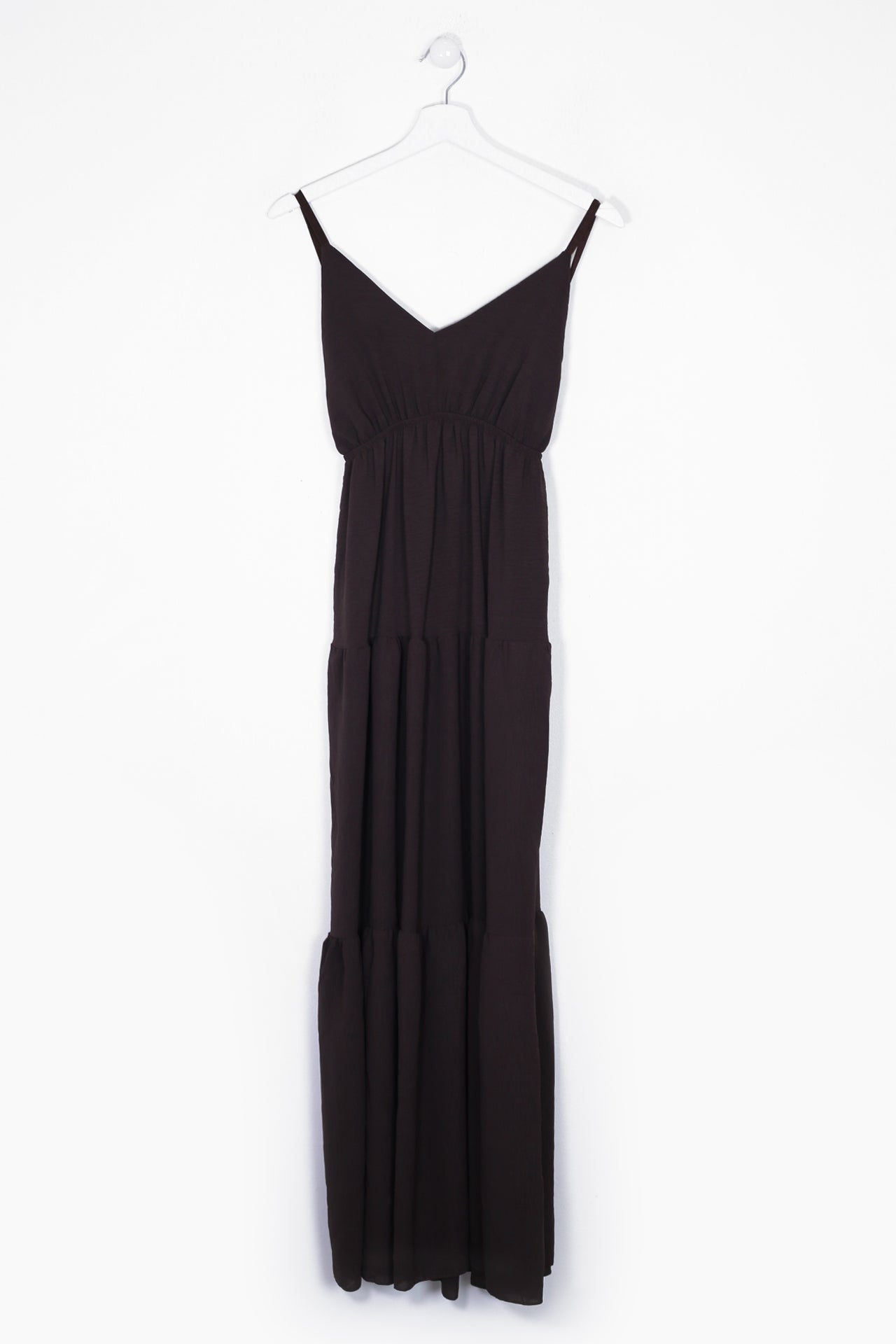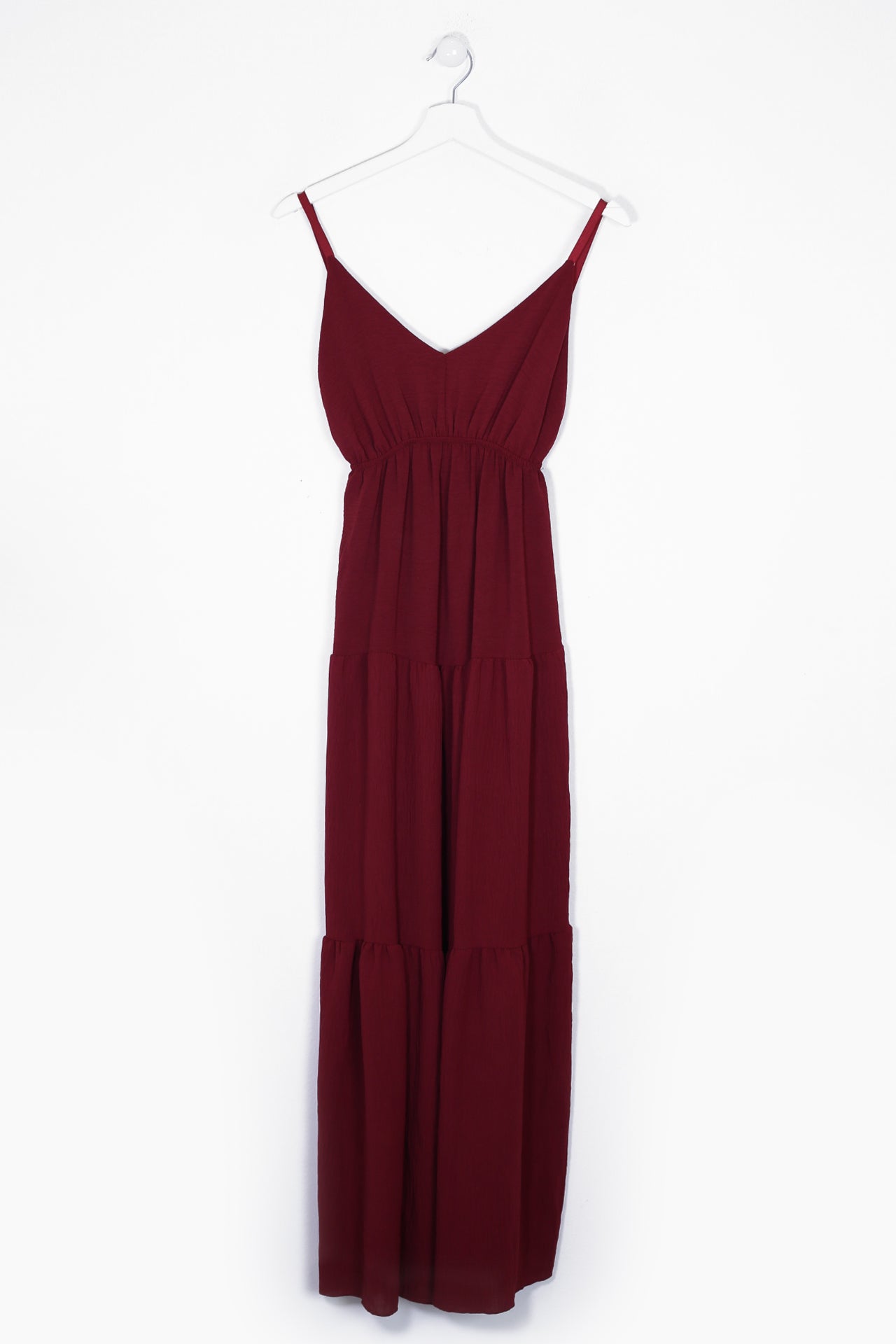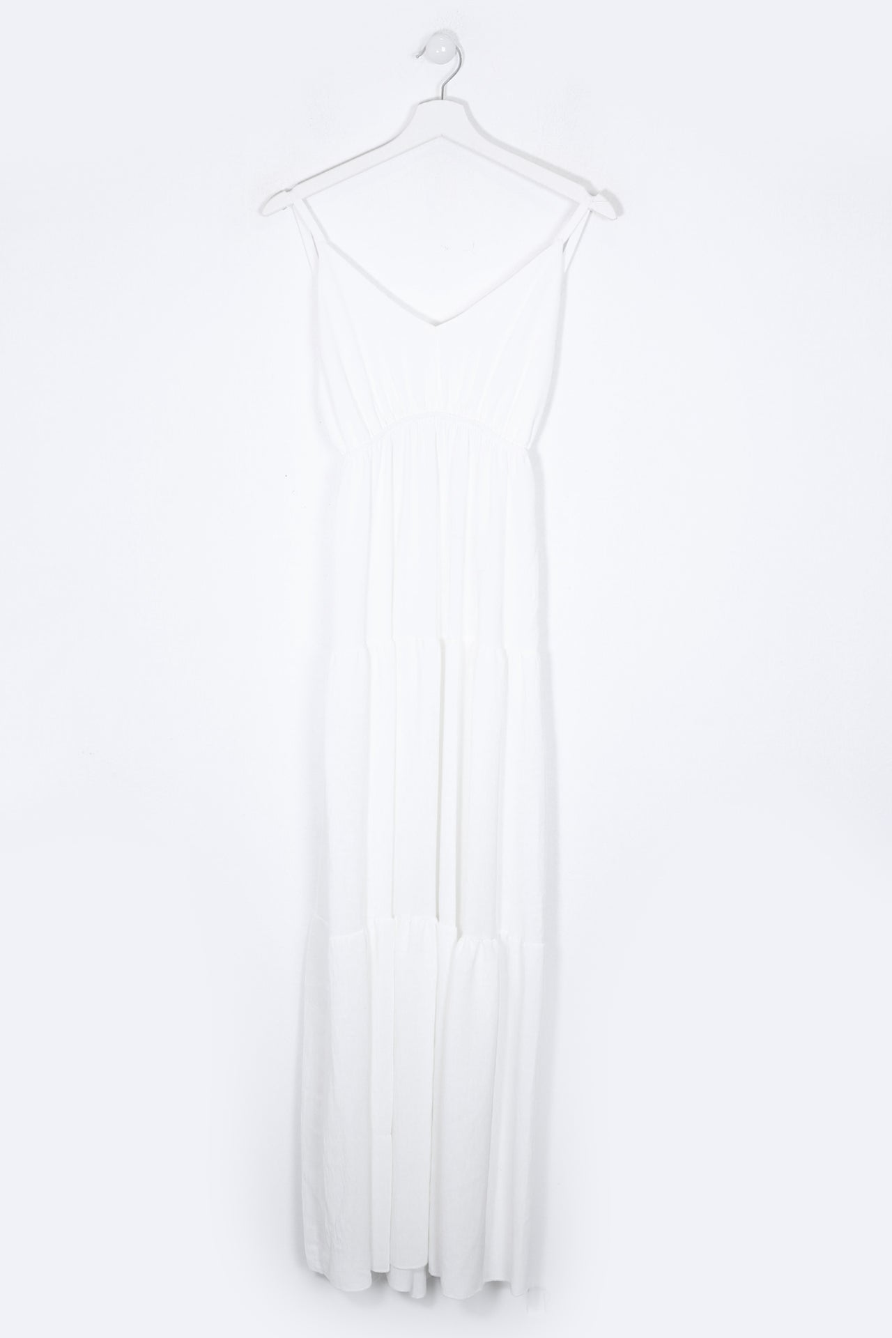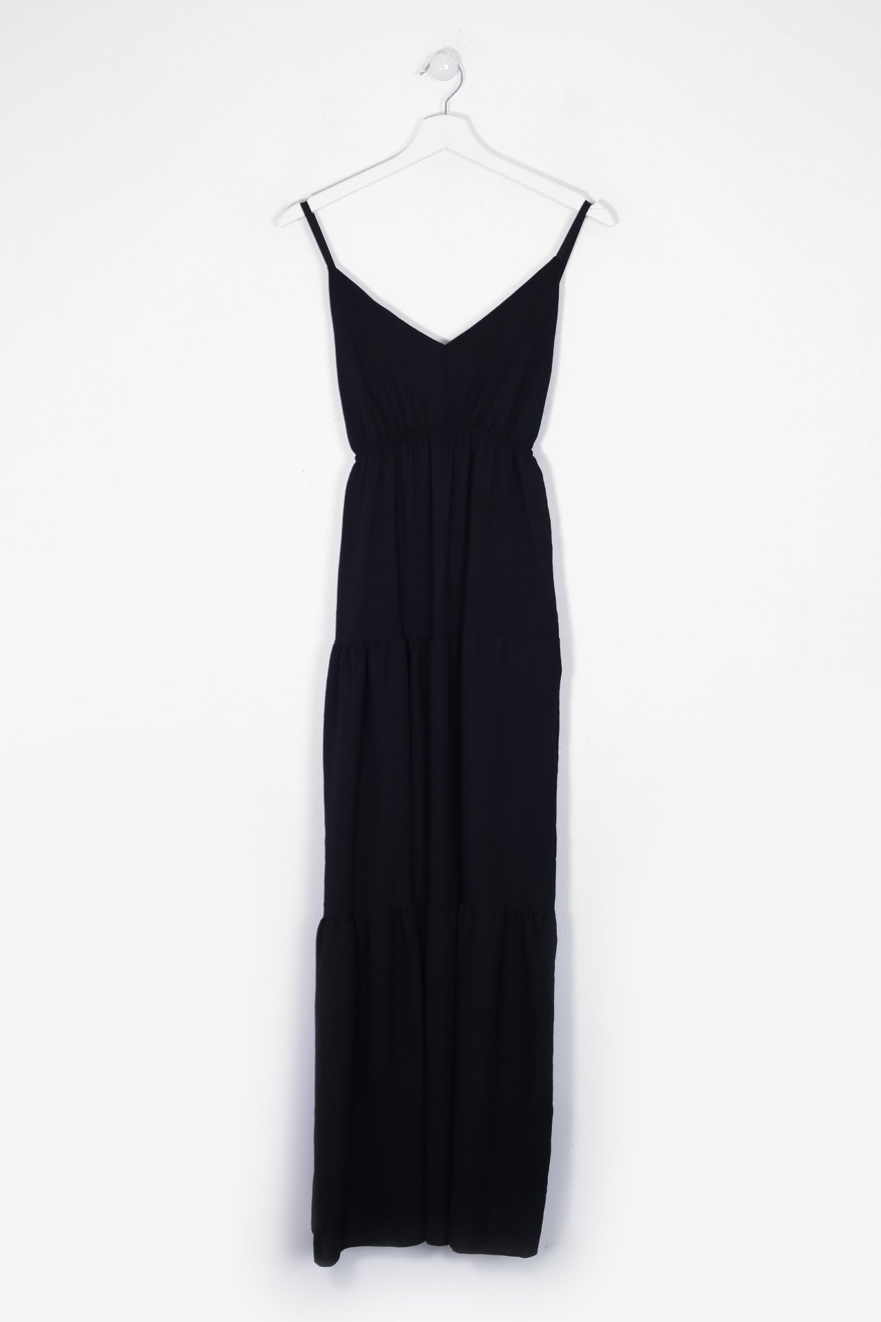 Vestido largo con escote en punta y tirantes finos ajustables. Elástico bajo el pecho. Detalle de volantes en falda.