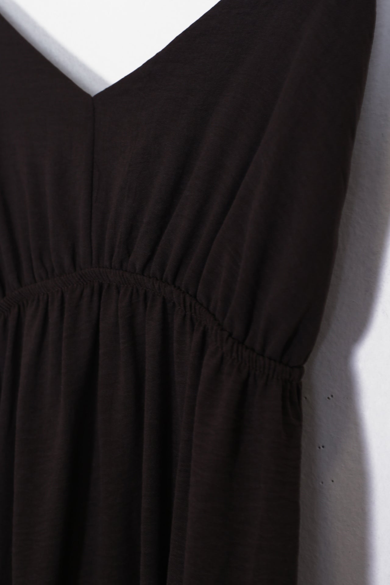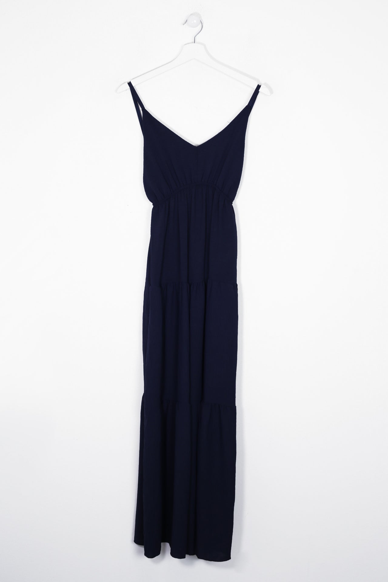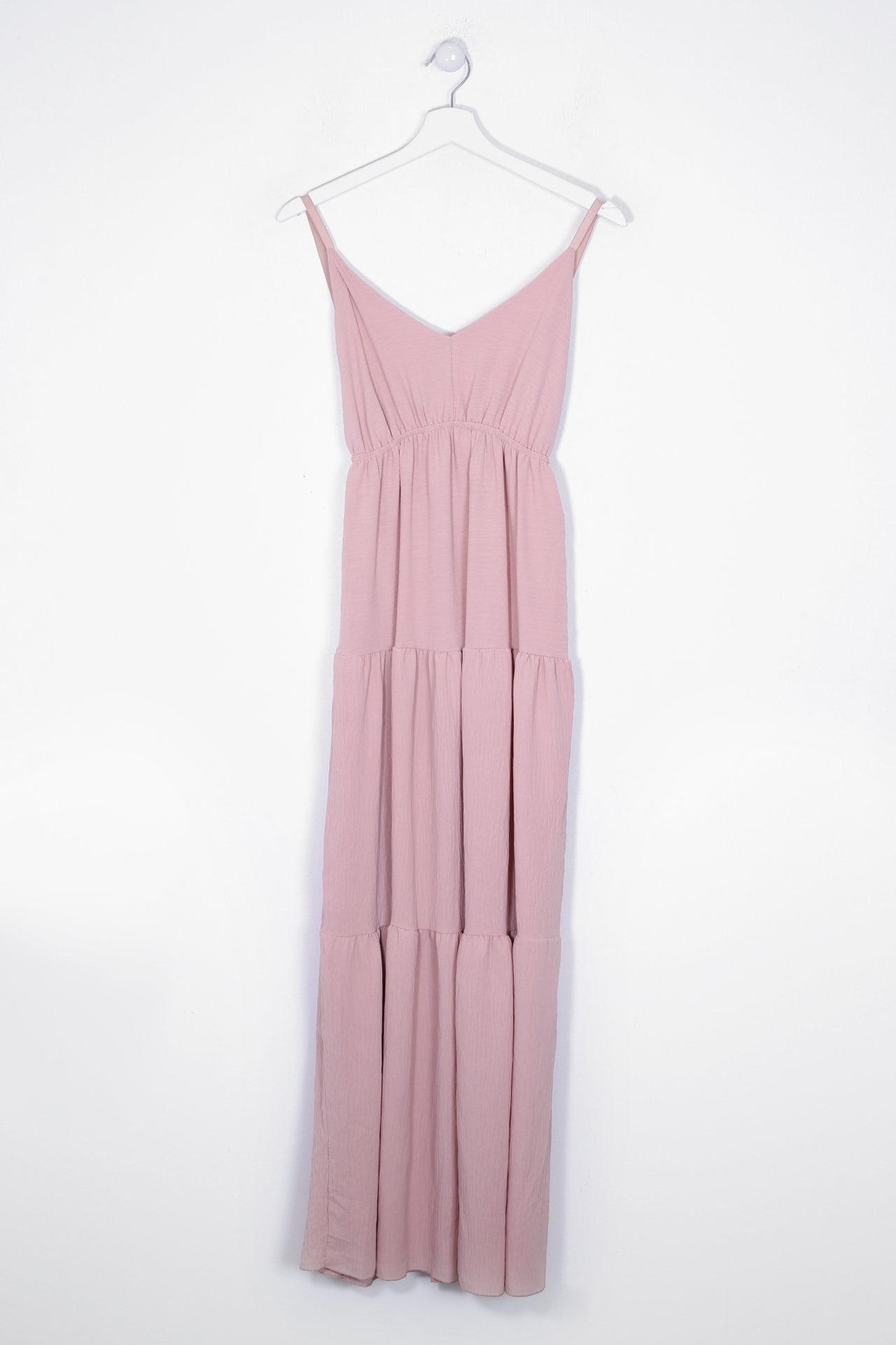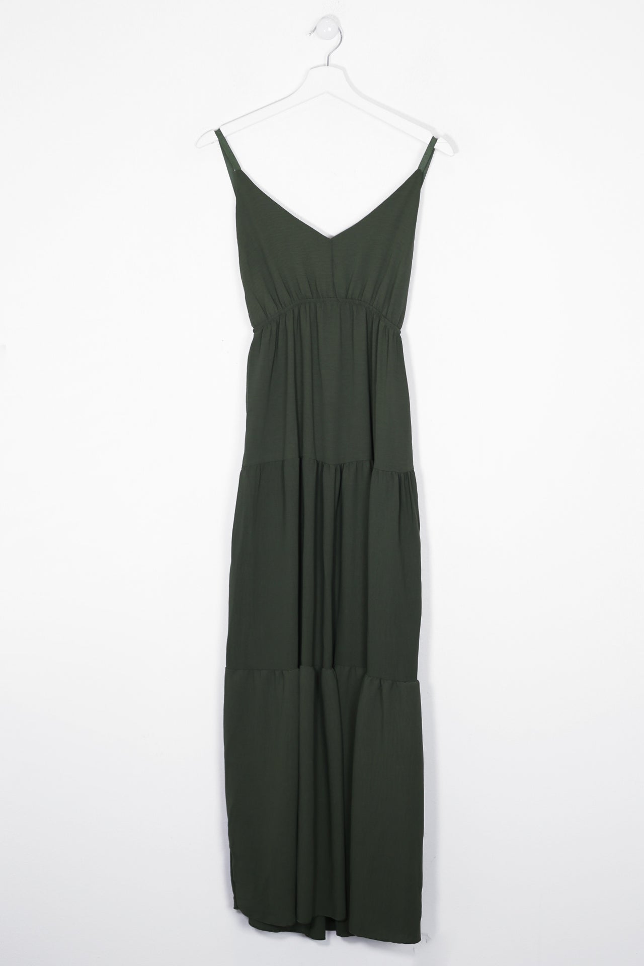 Vestido largo con escote en punta y tirantes finos ajustables. Elástico bajo el pecho. Detalle de volantes en falda.